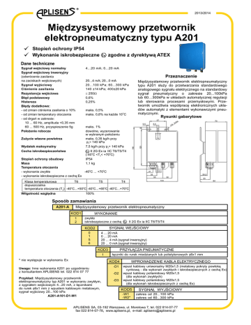 2013/2014 2013/2014 Międzysystemowy przetwornik elektropneumatyczny typu A201 [ [ Stopień ochrony IP54 Wykonanie iskrobezpieczne zgodne z dyrektywą ATEX Dane techniczne Sygnał wejściowy normalny Sygnał wejściowy inwersyjny (odwrócenie zasilania na zaciskach wejściowych) Sygnał wyjściowy Ciśnienie zasilania Rezystancja wejściowa Błąd podstawowy Histereza Błędy dodatkowe: - od zmian ciśnienia zasilania o 10% - od zmian temperatury otoczenia - od drgań w zakresie: 10 ... 60 Hz, amplituda <0,35 mm 60 ... 500 Hz, przyspieszenie 5g Położenie robocze 4...20 mA; 0...20 mA Przeznaczenie 20...4 mA; 20...0 mA 20...100 kPa; 60...300 kPa 140 ±14 kPa; 400±20 kPa Ł 250W 0,6% 0,25% Międzysystemowy przetwornik elektropneumatyczny typu A201 służy do przetwarzania standardowego analogowego sygnału elektrycznego na standardowy sygnał pneumatyczny o zakresie 20...100kPa lub 60…300kPa w układach automatycznej regulacji lub sterowania procesami przemysłowymi. Przetwornik umożliwia współpracę elektronicznych układów automatyki z elementami wykonawczymi pneumatycznymi. maks. 0,5% maks. 0,8% na każde 10OC Rysunki gabarytowe 57 6,5 9,5 Stopień ochrony obudowy Masa Temperatura otoczenia - wykonanie zwykłe -400C ... +700C - wykonanie iskrobezpieczne z cechą Ex 70 6,5 21 28.5 35 30 55 33 104 Klasa temperaturowa T6 T5 T4 dopuszczalna o o o o o temperatura otoczenia (Ta) -40 C...+50 C -40 C...+65 C -40 C...+70oC Wilgotność względna . 125 Wydatek maksymalny Cecha iskrobezpieczeństwa tw 14 146 Zużycie własne powietrza o -2 8 maks. 1% dowolne, wyzerowanie w wybranym położeniu maks. 0,35 kg/h przy pz= 140 kPa 7,5 kg/h przy pz= 140 kPa II 2G Ex ia IIC T6/T5/T4 (-400C <Ta< +700C) IP54 1,1 kg f8 84 100% Sposób zamawiania A201-A Międzysystemowy przetwornik elektropneumatyczny KOD1 1 2 WYKONANIE zwykłe iskrobezpieczne z cechą SYGNAŁ WEJŚCIOWY KOD2 0 1 5 6 II 2G Ex ia IIC T6/T5/T4 4 ... 20 mA 0 ... 20 mA 20 ... 4 mA (sygnał inwersyjny) 20 ... 0 mA (sygnał inwersyjny) KOD3 1 * nie występuje w wykonaniu Ex PRZYŁĄCZA PNEUMATYCZNE łączniki do rurek miedzianych lub polietylenowych f6x1 mm KOD4 Uwaga: Inne wykonania A201 po uzgodnieniu z konsultantem APLISENS tel. 022 814 07 77 Przykład: Międzysystemowy przetwornik elektropneumatyczny typ A201 w wykonaniu zwykłym, z sygnałem wejściowym 4...20 mA, z łącznikami do rurek f6x1 mm z wpustem kablowym metalowym, sygnał wyjściowy 20...100 kPa A201-A101-D1-W1 -D1 -D2 -D3 WPROWADZENIE KABLA ELEKTRYCZNEGO wpust kablowy uniwersalny M20x1,5 (metalowy pokryty powłoką cynkową - dla wykonań zwykłych i iskrobezpiecznych z cechą Ex) wpust kablowy poliamidowy M20x1,5 (dla wykonań zwykłych) wpust kablowy poliamidowy M20x1,5 (dla wykonań iskrobezpiecznych z cechą Ex) KOD5 -W1 -W2* SYGNAŁ WYJŚCIOWY zakres od 20...100 kPa zakres od 60...300 kPa APLISENS APLISENS S.A., SA, 03-192 03-192Warszawa, Warszawa,ul. ul.Morelowa Morelowa7, 7,tel. tel.022 022814-07-77 814-07-77 fax 022 814-07-78, www.aplisens.pl, e-mail: [email protected]