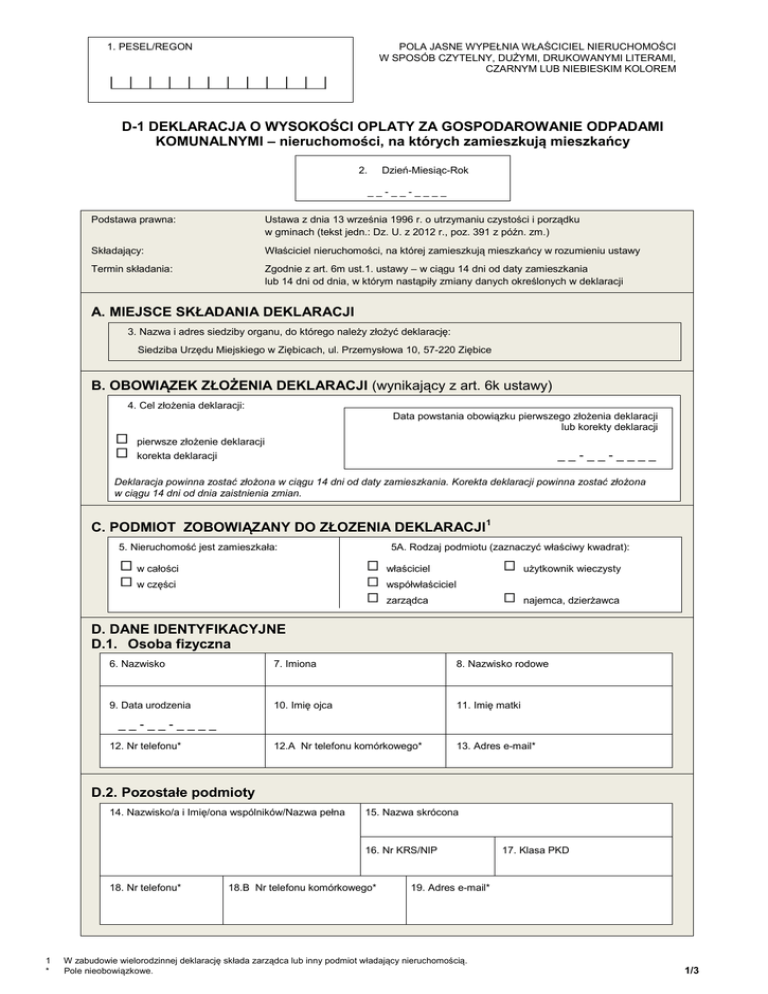 POLA JASNE WYPEŁNIA WŁAŚCICIEL NIERUCHOMOŚCI W SPOSÓB CZYTELNY, DUŻYMI, DRUKOWANYMI LITERAMI, CZARNYM LUB NIEBIESKIM KOLOREM 1. PESEL/REGON | | | | | | | | | | | | D-1 DEKLARACJA O WYSOKOŚCI OPLATY ZA GOSPODAROWANIE ODPADAMI KOMUNALNYMI – nieruchomości, na których zamieszkują mieszkańcy Dzień-Miesiąc-Rok 2. __-__-____ Podstawa prawna: Ustawa z dnia 13 września 1996 r. o utrzymaniu czystości i porządku w gminach (tekst jedn.: Dz. U. z 2012 r., poz. 391 z późn. zm.) Składający: Właściciel nieruchomości, na której zamieszkują mieszkańcy w rozumieniu ustawy Termin składania: Zgodnie z art. 6m ust.1. ustawy – w ciągu 14 dni od daty zamieszkania lub 14 dni od dnia, w którym nastąpiły zmiany danych określonych w deklaracji A. MIEJSCE SKŁADANIA DEKLARACJI 3. Nazwa i adres siedziby organu, do którego należy złożyć deklarację: Siedziba Urzędu Miejskiego w Ziębicach, ul. Przemysłowa 10, 57-220 Ziębice B. OBOWIĄZEK ZŁOŻENIA DEKLARACJI (wynikający z art. 6k ustawy) 4. Cel złożenia deklaracji: Data powstania obowiązku pierwszego złożenia deklaracji lub korekty deklaracji pierwsze złożenie deklaracji __-__-____ korekta deklaracji Deklaracja powinna zostać złożona w ciągu 14 dni od daty zamieszkania. Korekta deklaracji powinna zostać złożona w ciągu 14 dni od dnia zaistnienia zmian. C. PODMIOT ZOBOWIĄZANY DO ZŁOZENIA DEKLARACJI1 5. Nieruchomość jest zamieszkała: 5A. Rodzaj podmiotu (zaznaczyć właściwy kwadrat): w całości właściciel w części współwłaściciel użytkownik wieczysty zarządca najemca, dzierżawca D. DANE IDENTYFIKACYJNE D.1. Osoba fizyczna 6. Nazwisko 7. Imiona 8. Nazwisko rodowe 9. Data urodzenia 10. Imię ojca 11. Imię matki 12.A Nr telefonu komórkowego* 13. Adres e-mail* __-__-____ 12. Nr telefonu* D.2. Pozostałe podmioty 14. Nazwisko/a i Imię/ona wspólników/Nazwa pełna 15. Nazwa skrócona 16. Nr KRS/NIP 18. Nr telefonu* 1 * 18.B Nr telefonu komórkowego* 17. Klasa PKD 19. Adres e-mail* W zabudowie wielorodzinnej deklarację składa zarządca lub inny podmiot władający nieruchomością. Pole nieobowiązkowe. 1/3 20. Osoby upoważnione do reprezentowania: 2 _________________________________________________________________________________________________ ____________________________________ podstawa umocowania __________________________________________ _________________________________________________________________________________________________ ____________________________________ podstawa umocowania __________________________________________ _________________________________________________________________________________________________ ____________________________________ podstawa umocowania __________________________________________ _________________________________________________________________________________________________ ____________________________________ podstawa umocowania __________________________________________ Sposób reprezentacji:3_______________________________________________________________________________ _________________________________________________________________________________________________ D.3. DANE NIERUCHOMOŚCI na której powstają odpady komunalne4 21. Ulica 24. Miejscowość 22. Nr domu 25. Gmina 23. Nr lokalu 26. Kod pocztowy 27. Poczta D.4. ADRES DO KORESPONDENCJI (jeżeli jest inny niż adres nieruchomości w D.3.) 28. Kraj 29. Województwo 30. Powiat 31. Gmina 32. Ulica 33. Nr domu 35. Miejscowość 36. Kod pocztowy 34. Nr lokalu 37. Poczta Jednocześnie oświadczam, iż odpady z nieruchomości będą zbierane w sposób 5: selektywny 6 zmieszany E. OPŁATA ZA GOSPODAROWANIE ODPADAMI KOMUNALNYMI Ogółem liczba osób zamieszkujących nieruchomość I Wielkość gospodarstw domowych na terenie nieruchomości, dla której składana jest deklaracja 38. II Ilość gospodarstw domowych znajdujących się na nieruchomości, dla której składana jest deklaracja, według ich wielkości 1 – osobowe III Kwota opłaty dla jednego gospodarstwa 7 39. 40. 2 - osobowe 41. 3 - osobowe 42. 4 - osobowe 43. 5 - osobowe więcej niż 5 - osobowe V Miesięczna kwota opłaty 8 (suma opłat 2 3 4 5 6 7 8 44. pkt IV – od poz. 51 do poz. 56) IV Iloczyn II i III 45. 51. zł/ gosp. dom. zł/ miesiąc 46. 52. zł/ gosp. dom. zł/ miesiąc 47. 53. zł/ gosp. dom. zł/ miesiąc 48. 54. zł/ gosp. dom. zł/ miesiąc 49. 55. zł/ gosp. dom. zł/ miesiąc 50. 56. zł/ gosp. dom. zł/ miesiąc 57. zł/ miesiąc Należy wpisać imię i nazwisko, adres zamieszkania oraz nr telefonu osoby upoważnionej oraz podstawę umocowania. W przypadku pełnomocnictwa ogólnego pełnomocnictwo lub szczególnego pełnomocnictwo powinno być udzielone na piśmie i złożone z niniejszą deklaracją w oryginale lub formie uwierzytelnionego odpisu z uiszczoną opłatą skarbową. Należy wpisać czy pełnomocnicy mogą działać samodzielnie, czy posiadają pełnomocnictwo łączne. Dla każdej nieruchomości należy złożyć odrębną deklarację. Selektywna zbiórka odpadów będzie podlegała kontroli. Zbieranie odpadów w sposób selektywny polega na segregacji odpadów, w ramach której dany strumień odpadów, w celu ułatwienia przetwarzania, obejmuje jedynie odpady charakteryzujące się takimi samymi właściwościami i cechami. Sposób selektywnego zbierania określa szczegółowo Regulamin utrzymania czystości i porządku w Gminie Ziębice. W przypadku wyboru metody nieselektywnego zbierania odpadów komunalnych należy wybrać odpowiednią stawkę dla danej wielkości gospodarstwa domowego. Przy wyborze selektywnego zbierania odpadów komunalnych należy wybrać odpowiednio niższą stawkę. Kwoty stawek określone są w § 1 Uchwały Rady Miejskiej w Ziębicach w sprawie metody ustalenia opłaty za gospodarowanie odpadami komunalnymi oraz wysokości tej opłaty i stawki opłaty za pojemnik. Opłatę z poz. 57 należy wpłacać w odstępach miesięcznych, do 15 dnia miesiąca na wska