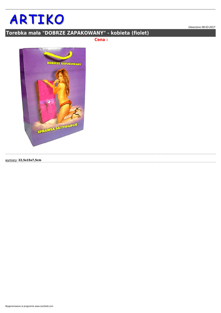 Utworzono 08-03-2017 Torebka mała "DOBRZE ZAPAKOWANY" - kobieta (fiolet) Cena : wymiary: 22,5x15x7,5cm Wygenerowano w programie www.oscGold.com