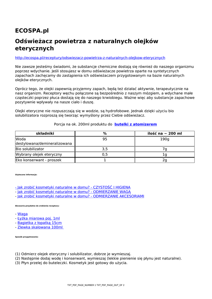 ECOSPA.pl Odświeżacz powietrza z naturalnych olejków eterycznych http://ecospa.pl/receptury/odswiezacz-powietrza-z-naturalnych-olejkow-eterycznych Nie zawsze jesteśmy świadomi, że substancje chemiczne dostają się również do naszego organizmu poprzez wdychanie. Jeśli stosujesz w domu odświeżacze powietrza oparte na syntetycznych zapachach zachęcamy do zastąpienia ich odświeżaczem przygotowanym na bazie naturalnych olejków eterycznych. Oprócz tego, że olejki zapewnią przyjemny zapach, będą też działać aktywnie, terapeutycznie na nasz organizm. Receptory węchu połączone są bezpośrednio z naszym mózgiem, a wdychane małe cząsteczki poprzez płuca dostają się do naszego krwiobiegu. Ważne więc aby substancje zapachowe pozytywnie wpływały na nasze ciało i duszę. Olejki eteryczne nie rozpuszczają się w wodzie, są hydrofobowe. Jednak dzięki użyciu bio solubilizatora rozproszą się tworząc wymyślony przez Ciebie odświeżacz. Porcja na ok. 200ml produktu do butelki z atomizerem składniki % ilość na ~ 200 ml Woda destylowana/demineralizowana 95 190g Bio solubilizator 3,5 7g Wybrany olejek eteryczny 0,5 1g Eko konserwant - proszek 1 2g Użyteczne informacje: - Jak zrobić kosmetyki naturalne w domu? - CZYSTOŚĆ I HIGIENA - Jak zrobić kosmetyki naturalne w domu? - ODMIERZANIE WAGĄ - Jak zrobić kosmetyki naturalne w domu? - ODMIERZANIE AKCESORIAMI Akcesoria przydatne do zrobienia receptury: - Waga - Łyżka miarowa poj. 1ml - Bagietka z łopatką 15cm - Zlewka skalowana 100ml Sposób przygotowania: (1) Odmierz olejek eteryczny i solubilizator, dobrze je wymieszaj. (2) Następnie dodaj wodę i konserwant, wymieszaj (lekkie pienienie się płynu jest naturalne). (3) Płyn przelej do buteleczki. Kosmetyk jest gotowy do użycia. TXT_PDF_PAGE_NUMBER 1 TXT_PDF_PAGE_OUT_OF 2 Przechowywanie stosowanie termin przydatności na półce lub w lodówce Używaj rozpylając mgiełkę w pomieszczeniu. Przed użyciem wstrząśnij. 3 miesiące Uwagi: Ilość potrzebnego bio solubilizatora jest zależna od użytego olejku. Na stronie bio solubilizatora podane są przybliżone ilości potrzebne do rozpuszczenia wybranych olejków. Dla olejków niewymienionych w tabeli procentowy udział możesz ustalić sama. Zacznij od proporcji 1 część olejku/ 5 części solubilizatora. Jeśli odświeżacz jest bardzo mętny dodawaj stopniowo niewielkie ilości solubilizatora. Gdy płyn zacznie robić się klarowniejszy oznaczało to będzie lepsze rozpuszczanie. Solubilizator nadaje płynom barwę miodową. Rozpuszczanie olejków ułatwi również dodanie kilku procent alkoholu etylowego (spirytusu 95%). TXT_PDF_PAGE_NUMBER 2 TXT_PDF_PAGE_OUT_OF 2