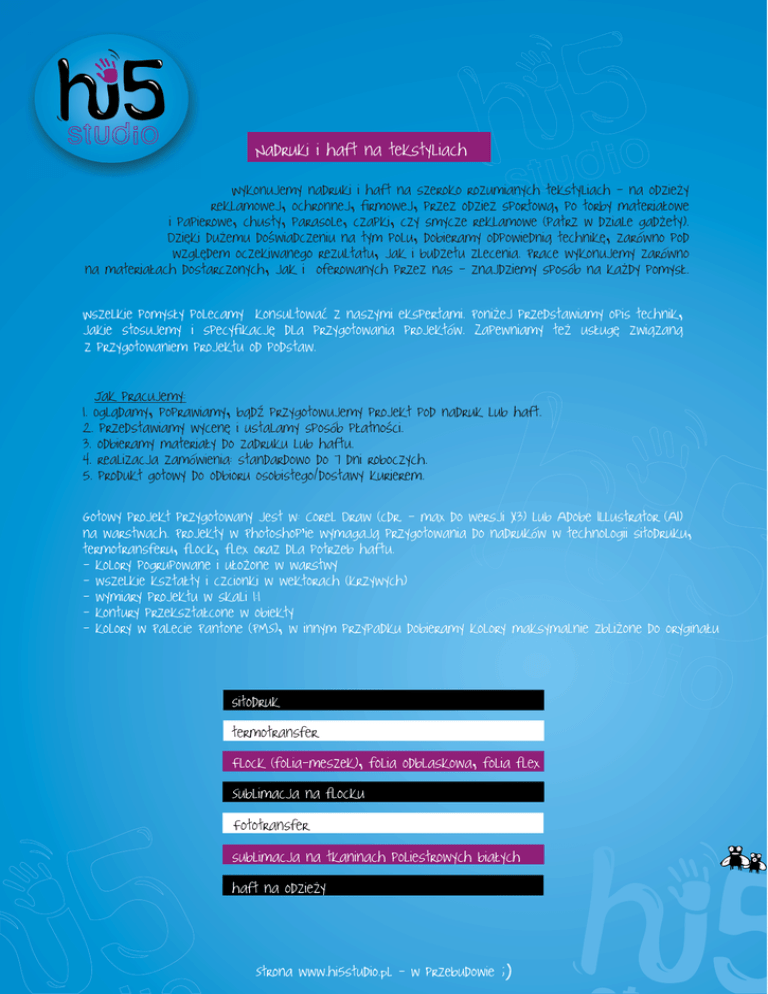 Nadruki i haft na tekstyliach Wykonujemy nadruki i haft na szeroko rozumianych tekstyliach - na odziezy reklamowej, ochronnej, firmowej, przez odziez sportowa, po torby materialowe i papierowe, chusty, parasole, czapki, czy smycze reklamowe (patrz w dziale gadzety). Dzieki duzemu doswiadczeniu na tym polu, dobieramy odpowiednia technike, zarówno pod wzgledem oczekiwanego rezultatu, jak i budzetu zlecenia. Prace wykonujemy zarówno na materialach dostarczonych, jak i oferowanych przez nas - znajdziemy sposób na kazdy pomysl. Wszelkie pomysly polecamy konsultowac z naszymi ekspertami. Ponizej przedstawiamy opis technik, jakie stosujemy i specyfikacje dla przygotowania projektów. Zapewniamy tez usluge zwiazana z przygotowaniem projektu od podstaw. Jak pracujemy: 1. Ogladamy, poprawiamy, badz przygotowujemy projekt pod nadruk lub haft. 2. przedstawiamy wycene i ustalamy sposób platnosci. 3. odbieramy materialy do zadruku lub haftu. 4. realizacja zamówienia: standardowo do 7 dni roboczych. 5. produkt gotowy do odbioru osobistego/dostawy kurierem. Gotowy projekt przygotowany jest w: Corel Draw (cdr. - max do wersji X3) lub Adobe Illustrator (AI) na warstwach. Projekty w Photoshop’ie wymagaja przygotowania do nadruków w technologii sitodruku, termotransferu, flock, flex oraz dla potrzeb haftu. - kolory pogrupowane i ulozone w warstwy - wszelkie ksztalty i czcionki w wektorach (krzywych) - wymiary projektu w skali 1:1 - kontury przeksztalcone w obiekty - kolory w Palecie Pantone (PMS), w innym przypadku dobieramy kolory maksymalnie zblizone do oryginalu sitodruk termotransfer Flock (folia-meszek), folia odblaskowa, folia flex Sublimacja na flocku Fototransfer sublimacja na tkaninach poliestrowych bialych haft na odziezy