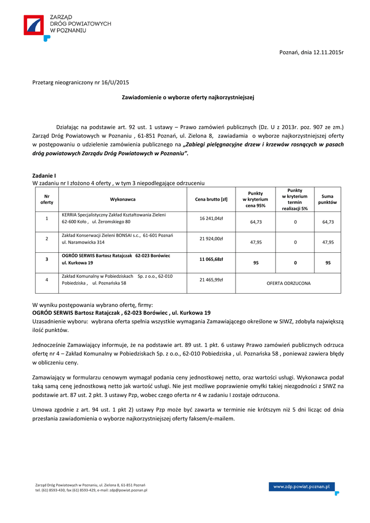 Poznań, dnia 12.11.2015r Przetarg nieograniczony nr 16/U/2015 Zawiadomienie o wyborze oferty najkorzystniejszej Działając na podstawie art. 92 ust. 1 ustawy – Prawo zamówień publicznych (Dz. U z 2013r. poz. 907 ze zm.) Zarząd Dróg Powiatowych w Poznaniu , 61-851 Poznań, ul. Zielona 8, zawiadamia o wyborze najkorzystniejszej oferty w postępowaniu o udzielenie zamówienia publicznego na „Zabiegi pielęgnacyjne drzew i krzewów rosnących w pasach dróg powiatowych Zarządu Dróg Powiatowych w Poznaniu”. Zadanie I W zadaniu nr I złożono 4 oferty , w tym 3 niepodlegające odrzuceniu Nr oferty Wykonawca Cena brutto [zł] 1 KERRIA Specjalistyczny Zakład Kształtowania Zieleni 62-600 Koło , ul. Żeromskiego 80 16 241,04zł 2 Zakład Konserwacji Zieleni BONSAI s.c., 61-601 Poznań ul. Naramowicka 314 21 924,00zł 3 OGRÓD SERWIS Bartosz Ratajczak 62-023 Borówiec ul. Kurkowa 19 11 065,68zł 4 Zakład Komunalny w Pobiedziskach Sp. z o.o., 62-010 Pobiedziska , ul. Poznańska 58 21 465,99zł Punkty w kryterium cena 95% Punkty w kryterium termin realizacji 5% Suma punktów 64,73 0 64,73 47,95 0 47,95 95 0 95 OFERTA ODRZUCONA W wyniku postępowania wybrano ofertę, firmy: OGRÓD SERWIS Bartosz Ratajczak , 62-023 Borówiec , ul. Kurkowa 19 Uzasadnienie wyboru: wybrana oferta spełnia wszystkie wymagania Zamawiającego określone w SIWZ, zdobyła największą ilość punktów. Jednocześnie Zamawiający informuje, że na podstawie art. 89 ust. 1 pkt. 6 ustawy Prawo zamówień publicznych odrzuca ofertę nr 4 – Zakład Komunalny w Pobiedziskach Sp. z o.o., 62-010 Pobiedziska , ul. Poznańska 58 , ponieważ zawiera błędy w obliczeniu ceny. Zamawiający w formularzu cenowym wymagał podania ceny jednostkowej netto, oraz wartości usługi. Wykonawca podał taką samą cenę jednostkową netto jak wartość usługi. Nie jest możliwe poprawienie omyłki takiej niezgodności z SIWZ na podstawie art. 87 ust. 2 pkt. 3 ustawy Pzp, wobec czego oferta nr 4 w zadaniu I zostaje odrzucona. Umowa zgodnie z art. 94 ust. 1 pkt 2) ustawy Pzp może być zawarta w terminie nie krótszym niż 5 dni licząc od dnia przesłania zawiadomienia o wyborze najkorzystniejszej oferty faksem/e-mailem. Zarząd Dróg Powiatowych w Poznaniu, ul. Zielona 8, 61-851 Poznań tel. (61) 8593-430, fax (61) 8593-429, e-mail: [email protected] Zadanie II W zadaniu nr II złożono 2 oferty Nr oferty Wykonawca Cena brutto [zł] 1 KERRIA Specjalistyczny Zakład Kształtowania Zieleni 62-600 Koło , ul. Żeromskiego 80 145 868,04zł 3 OGRÓD SERWIS Bartosz Ratajczak 62-023 Borówiec ul. Kurkowa 19 74 336,40zł Punkty w kryterium cena 95% Punkty w kryterium termin realizacji 5% Suma punktów 48,41 0 48,41 95 5 100 W wyniku postępowania wybrano ofertę, firmy: OGRÓD SERWIS Bartosz Ratajczak , 62-023 Borówiec , ul. Kurkowa 19 Uzasadnienie wyboru: wybrana oferta spełnia wszystkie wymagania Zamawiającego określone w SIWZ, zdobyła największą ilość punktów. Umowa zgodnie z art. 94 ust. 2 pkt 3 lit. a ustawy Pzp może być zawarta następnego dnia, licząc od dnia przesłania zawiadomienia o wyborze najkorzystniejszej oferty. Zadanie III W zadaniu nr III złożono 2 oferty Nr oferty Wykonawca Cena brutto [zł] 1 KERRIA Specjalistyczny Zakład Kształtowania Zieleni 62-600 Koło , ul. Żeromskiego 80 124 343,64zł 3 OGRÓD SERWIS Bartosz Ratajczak , 62-023 Borówiec ul. Kurkowa 19 84 196,80zł Punkty w kryterium cena 95% Punkty w kryterium termin realizacji 5% Suma punktów 64,33 0 64,33 95 0 95 W wyniku postępowania wybrano ofertę, firmy: OGRÓD SERWIS Bartosz Ratajczak, 62-023 Borówiec , ul. Kurkowa 19 Uzasadnienie wyboru: wybrana oferta spełnia wszystkie wymagania Zamawiającego określone w SIWZ, zdobyła największą ilość punktów. Umowa zgodnie z art. 94 ust. 2 pkt 3 lit. a ustawy Pzp może być zawarta następnego dnia, licząc od dnia przesłania zawiadomienia o wyborze najkorzystniejszej oferty. Sprawę prowadzi: Marlena Jakubiak, tel. 61 859-34-34 Strona 2 z 2