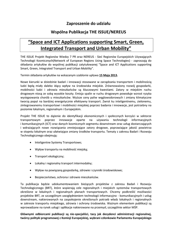 Zaproszenie do udziału Wspólna Publikacja THE ISSUE/NEREUS “Space and ICT Applications supporting Smart, Green, Integrated Transport and Urban Mobility” THE ISSUE Projekt Regionów Wiedzy 7 PR oraz NEREUS - Sieć Regionów Europejskich Używających Technologii Kosmicznych(Network of European Regions Using Space Technologies) - zapraszają do składania artykułów do wspólnej publikacji zatytułowanej “Space and ICT Applications supporting Smart, Green, Integrated Transport and Urban Mobility”. Termin składania artykułów na wskazanym szablonie upływa 15 Maja 2013. Nowe kierunki w dziedzinie badań i innowacji stosowane w zarządzaniu transportem i mobilnością ludzi będą miały daleko idący wpływ na środowiska miejskie. Zrównoważony rozwój gospodarki, mobilności ludzi i zdrowia mieszkańców są kluczowymi kwestiami. Zatory w miejskim ruchu drogowym niosą ze sobą wysokie koszty. Emisja spalin w ruchu drogowym powoduje wzrost ryzyka występowania chorób u mieszkańców. Wyższe ceny paliw węglowodorowych i zmiany klimatyczne tworzą popyt na bardziej energetycznie efektywny transport. Zwrot ku inteligentnemu, zielonemu, zintegrowanemu transportowi i mobilności miejskiej poprzez badania i innowacje, jest potrzebny na poziomie lokalnym, regionalnym i Europejskim. Projekt THE ISSUE to dążenie do identyfikacji ekonomicznych i społecznych korzyści w sektorze transportowym poprzez innowacje oparte na używaniu technologii informacyjnych i komunikacyjnych (ICT) oraz danych kosmicznych segmentu downstream oraz usług dostarczających i wdrażających nowe rozwiązania zmniejszające zatory drogowe, poprawiające jakość powietrza w stopniu lokalnym oraz ułatwiające zmiany środków transportu. Tematy z zakresu Badań i Rozwoju Technologicznego obejmują:  Inteligentne Systemy Transportowe;  Wpływ transportu na mobilność miejską;  Transport ekologiczny;  Lokalny i regionalny transport intermodalny;  Wpływ na powiązaną gospodarkę, zdrowie i czynniki środowiskowe;  Bezpieczeństwo, ochrona i zdrowie mieszkańców. Ta publikacja będzie udokumentowaniem bieżących projektów z zakresu Badań i Rozwoju Technologicznego (BRT), które wspierają cele regionalnych i miejskich systemów transportowych określone w lokalnych i regionalnych planach transportowych. Chcemy podkreślić możliwości projektów BRT, ze szczególnym uwzględnieniem technologii informacyjno - komunikacyjnych i usług downstream, nakierowanych na zaspokojenie określonych potrzeb władz lokalnych i regionalnych w zakresie transportu miejskiego, zdrowia i ochrony środowiska. Ważnym elementem publikacji są wprowadzane na rynek usługi i aplikacje nakierowane na przemysł, szczególnie sektor MŚP. Głównymi odbiorcami publikacji są nie-specjaliści, tacy jak decydenci administracji regionalnej, twórcy polityki programowej z Komisji Europejskiej, wybrani członkowie Parlamentu Europejskiego i władz krajowych państw członkowskich, prezesi i dyrektorzy firm ze szczególnym uwzględnieniem sektora MŚP. Informacje będą krótkie, zajmujące najwyżej 2 strony a5. Ma to na celu przedstawienie różnorodności aplikacji i możliwości ich praktycznego zastosowania. 50 wybranych artykułów zostanie włączonych do wysokiej jakości publikacji, która zaprezentowana zostanie w Brukseli w październiku 2013. Wszystkie artykuły spełniające kryteria zostaną opublikowane na stronach internetowych THE ISSUE i NEREUS. Nie przewidziane zostało wynagrodzenie dla autorów. Instrukcje dla autorów: Artykuły powinny być w języku angielskim, ograniczone do dwóch stron formatu A5 (ok. 500-700 słów) i zawierać do dwóch ilustracji. Należy używać standardowego wzorca, który można znaleźć pod adresem: http://www.theissue.eu/en/a/Call-for-article. Każdy artykuł powinien zawierać następujące sekcje: 1. 2. 3. 4. Tytuł artykułu Region europejski Nazwiska autorów, dane kontaktowe, powiązania Wyzwanie społeczne THE ISSUE (należy wybrać jeden z poniższych punktów):  Innowacje w Inteligentnych Systemach Zarządzania Ruchem  Postępy w zakresie monitoringu i zarządzania jakością powietrza i poziomem emisji gazów cieplarnianych na terenach miejskich  Regionalne i miejskie sieci drogowe - wykorzystanie, planowanie i optymalizacja  Transport miejski i mobilność, intermodalność i interoperacyjność  Poprawa ochrony, bezpieczeństwa i zdrowia społeczności miejskiej  Włączanie i krzyżowanie technologii 5. Aplikacja użytkownika (należy wybrać jedną lub maksymalnie dwie z poniższej listy):  Zarządzanie ograniczeniami ruchu. Rozwój zintegrowanego systemu zarządzania ruchem drogowym i problemami środowiskowymi  Zarządzanie jakością powietrza i monitoring poziomu emisji gazów cieplarnianych  Interoperacyjność frachtu drogowego ponad granicami miast i regionów  Systemy informacyjne na rzecz planowanie sieci drogowych i inteligentnego zarządzania ruchem  Rozwiązania z zakresu Inteligentnych Systemów Transportowych dla podwyższenia poziomu bezpieczeństwa ruchu drogowego (unikanie wypadków). Narzędzie do poprawy bezpieczeństwa drogowego  Usługi dla transportu i planowanie wykorzystujące rozwiązania SDI i GIS  Technologie dla podróżnych i usługi z zakresu informacji o ruchu drogowym - usługi dla użytkowników, operatorów transportowych oraz z zakresu planowania  Rozwój wspólnych rozwiązań transmisji danych: wspólny bilet, interoperacyjność danych.  Korzyści publiczne  Inne 6. Wyzwanie Opisz problem lub wyzwanie. Co było motywacją di tych badań lub podjętych działań. Używaj prostego języka, nakierowanym na ogół społeczeństwa. Unikaj skrótów. 7. Następstwa Wskaż implikacje odpowiadające wymaganiom wyzwania w kategoriach społecznoekonomicznych, politycznych i środowiskowych oraz w odniesieniu do regionalnej polityki transportowej. 8. Rozwiązanie THE ISSUE Opisz jak badania lub rozwój odpowiadają potrzebom wyzwania i p