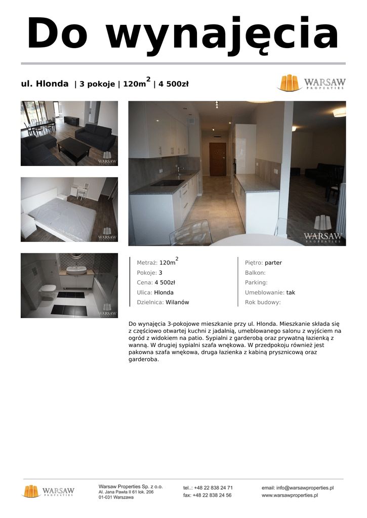 Do wynajęcia 2 ul. Hlonda | 3 pokoje | 120m | 4 500zł Metraż: 120m 2 Piętro: parter Pokoje: 3 Balkon: Cena: 4 500zł Parking: Ulica: Hlonda Umeblowanie: tak Dzielnica: Wilanów Rok budowy: Do wynajęcia 3-pokojowe mieszkanie przy ul. Hlonda. Mieszkanie składa się z częściowo otwartej kuchni z jadalnią, umeblowanego salonu z wyjściem na ogród z widokiem na patio. Sypialni z garderobą oraz prywatną łazienką z wanną. W drugiej sypialni szafa wnękowa. W przedpokoju również jest pakowna szafa wnękowa, druga łazienka z kabiną prysznicową oraz garderoba.
