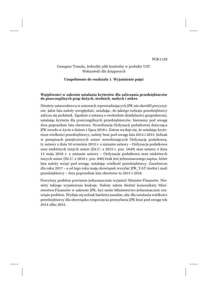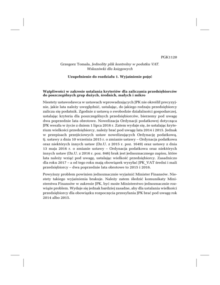PGK1120 Grzegorz Tomala, Jednolity plik kontrolny w podatku VAT. Wskazówki dla księgowych Uzupełnienie do rozdziału 1. Wyjaśnienie pojęć Wątpliwości w zakresie ustalania kryteriów dla zaliczania przedsiębiorców do poszczególnych grup duŜych, średnich, małych i mikro Niestety ustawodawca w ustawach wprowadzających JPK nie określił precyzyjnie, jakie lata naleŜy uwzględnić, ustalając, do jakiego rodzaju przedsiębiorcy zalicza się podatnik. Zgodnie z ustawą o swobodzie działalności gospodarczej, ustalając kryteria dla poszczególnych przedsiębiorców, bierzemy pod uwagę dwa poprzednie lata obrotowe. Nowelizacja Ordynacji podatkowej dotycząca JPK weszła w Ŝycie z dniem 1 lipca 2016 r. Zatem wydaje się, Ŝe ustalając kryterium wielkości przedsiębiorcy, naleŜy brać pod uwagę lata 2014 i 2015. Jednak w przepisach przejściowych ustaw nowelizujących Ordynację podatkową, tj. ustawy z dnia 10 września 2015 r. o zmianie ustawy – Ordynacja podatkowa oraz niektórych innych ustaw (Dz.U. z 2015 r. poz. 1649) oraz ustawy z dnia 13 maja 2016 r. o zmianie ustawy – Ordynacja podatkowa oraz niektórych innych ustaw (Dz.U. z 2016 r. poz. 846) brak jest jednoznacznego zapisu, które lata naleŜy wziąć pod uwagę, ustalając wielkość przedsiębiorcy. Zasadniczo dla roku 2017 – a od tego roku mają obowiązek wysyłać JPK_VAT średni i mali przedsiębiorcy – dwa poprzednie lata obrotowe to 2015 i 2016. PowyŜszy problem powinien jednoznacznie wyjaśnić Minister Finansów. Niestety takiego wyjaśnienia brakuje. NaleŜy zatem śledzić komunikaty Ministerstwa Finansów w zakresie JPK, być moŜe Ministerstwo jednoznacznie rozwiąŜe problem. Wydaje się jednak bardziej zasadne, aby dla ustalania wielkości przedsiębiorcy dla obowiązku rozpoczęcia przesyłania JPK brać pod uwagę rok 2014 albo 2015. Przykład ustalenia kryterium dla mikroprzedsiębiorcy w oparciu o dane z 2014 i 2015 r. Lata Średnioroczne zatrudnienie Roczny obrót netto ze sprzedaŜy towarów, wyrobów i usług oraz operacji finansowych 2014 9 osób 1 mln euro 3 mln euro 2015 10 osób 3 mln euro 3 mln euro Suma aktywów bilansu sporządzonego na koniec roku W 2016 r. podatnik jest mikroprzedsiębiorcą, poniewaŜ w jednym z dwóch poprzednich lat obrotowych spełnił warunki dla mikroprzedsiębiorcy, tj. zatrudnienie wyniosło mniej niŜ 10 osób oraz został spełniony jeden z dwóch warunków finansowych – przychody finansowe netto były niŜsze od 2 mln zł. 2014 10 osób 3 mln euro 3 mln euro 2015 9 osób 3 mln euro 1 mln euro W 2016 r. podatnik jest mikroprzedsiębiorcą, poniewaŜ w jednym z dwóch poprzednich lat obrotowych spełnił warunki dla mikroprzedsiębiorcy, tj. zatrudnienie wyniosło mniej niŜ 10 osób oraz został spełniony jeden z dwóch warunków finansowych – suma aktywów bilansu sporządzonego na koniec roku była niŜsza od 2 mln zł. 2014 10 osób 1 mln euro 1 mln euro 2015 10 osób 1 mln euro 1 mln euro W 2016 r. podatnik nie jest mikroprzedsiębiorcą, poniewaŜ w jednym z dwóch poprzednich lat obrotowych nie spełnił warunków dla mikroprzedsiębiorcy, tj. zatrudnienie wyniosło w kaŜdym z lat co najmniej 10 osób. W takim przypadku warunki finansowe nie są juŜ istotne, poniewaŜ obligatoryjnie naleŜy spełnić warunek zatrudnienia. 2014 9 osób 3 mln euro 3 mln euro 2015 9 osób 3 mln euro 3 mln euro W 2016 r. podatnik nie jest mikroprzedsiębiorcą, poniewaŜ w jednym z dwóch poprzednich lat obrotowych nie spełnił warunków dla mikroprzedsiębiorcy. Zatrudnienie wyniosło co prawda mniej niŜ 10 osób, ale nie został spełniony Ŝaden z warunków finansowych.