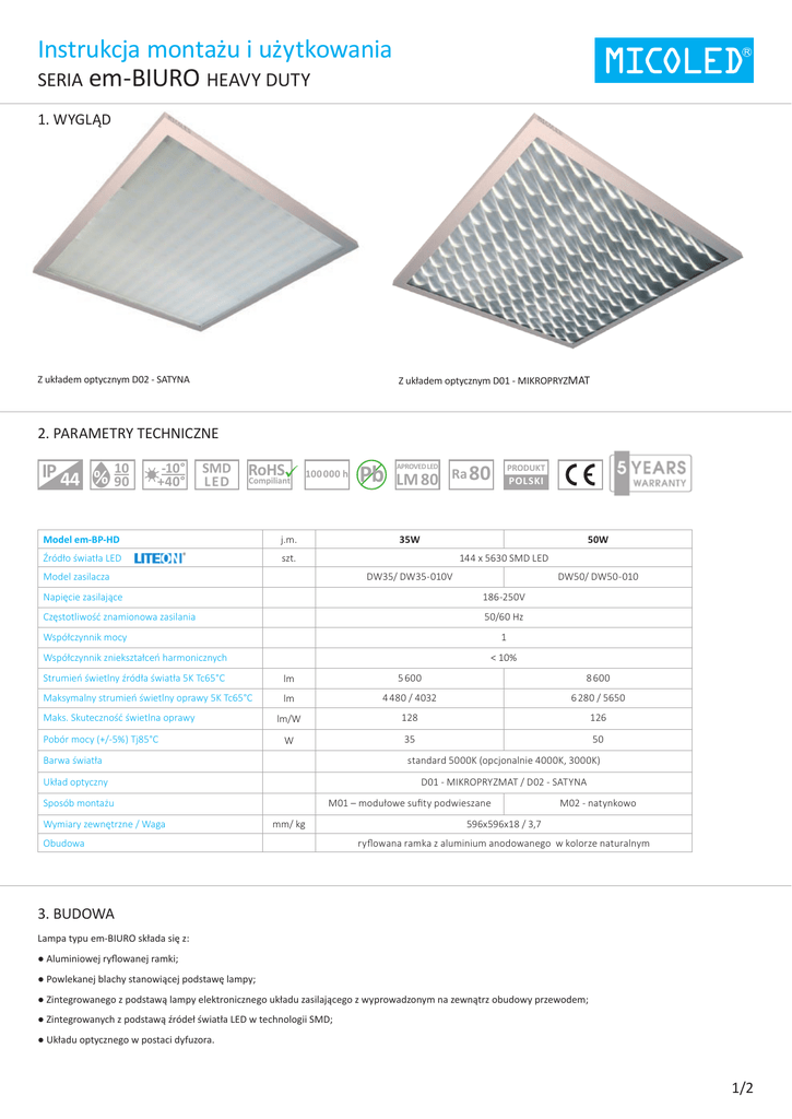 Instrukcja montażu i użytkowania SERIA em-BIURO HEAVY DUTY 1. WYGLĄD Z układem optycznym D01 - MIKROPRYZMAT Z układem optycznym D02 - SATYNA 2. PARAMETRY TECHNICZNE 10 IP 44 % 90 -10° +40° SMD LED RoHS Compiliant Model em-BP-HD j.m. Źródło światła LED szt. 100 000 h Pb LM 80 Ra 80 APROVED LED PRODUKT POLSKI 35W 50W 144 x 5630 SMD LED Model zasilacza DW35/ DW35-010V DW50/ DW50-010 Napięcie zasilające 186-250V Częstotliwość znamionowa zasilania 50/60 Hz Współczynnik mocy 1 Współczynnik zniekształceń harmonicznych Strumień świetlny źródła światła 5K Tc65°C Maksymalny strumień świetlny oprawy 5K Tc65°C Maks. Skuteczność świetlna oprawy Pobór mocy (+/-5%) Tj85°C < 10% lm 5 600 8 600 lm 4 480 / 4032 6 280 / 5650 lm/W 128 126 W 35 50 Barwa światła standard 5000K (opcjonalnie 4000K, 3000K) Układ optyczny D01 - MIKROPRYZMAT / D02 - SATYNA Sposób montażu Wymiary zewnętrzne / Waga M01 – modułowe sufity podwieszane mm/ kg Obudowa M02 - natynkowo 596x596x18 / 3,7 ryflowana ramka z aluminium anodowanego w kolorze naturalnym 3. BUDOWA Lampa typu em-BIURO składa się z: ● Aluminiowej ryflowanej ramki; ● Powlekanej blachy stanowiącej podstawę lampy; ● Zintegrowanego z podstawą lampy elektronicznego układu zasilającego z wyprowadzonym na zewnątrz obudowy przewodem; ● Zintegrowanych z podstawą źródeł światła LED w technologii SMD; ● Układu optycznego w postaci dyfuzora. 1/2 4. MONTAŻ LAMPY Przed zamontowaniem lampy em-BIURO należy ją podłączyć. Lampę montować w modułowe sufity podwieszane o otworze 600x600mm lub natynkowo za pomocą zestawu montażowego A01. MONTAŻ W SUFICIE PODWIESZANYM - wymagany otwór w świetle 600 x 600 mm. MONTAŻ NATYNKOWY - zastosować dostępny w akcesoriach zestaw do montażu A01. Zestaw A01 zawiera 4 sztuki uchwytów magnetycznych z otworem pod stożkowy łeb śruby (średnica zewnętrzna uchwytu 32mm, średnica otworu wewnętrznego 5,5mm; średnica fazy pod łeb śruby 11,5mm; wysokość uchwytu łącznie z gumowym elementem dystansowym zintegrowanym z uchwytem magnetycznym wynosi 16mm) Montaż w suficie podwieszanym Uchwyty magnetyczne należy zamontować do podłoża (sufitu, ściany) w czterech narożnikach, tak by tworzyły kwadrat o szerokości ok. 400mm. Uchwyty należy zamocować na kołkach rozporowych (odpowiednio dobranych w zależności od rodzaju podłoża) z zastosowaniem wkrętów z łbem stożkowym o średnicy 8 – 11 mm. UWAGA! Wkręt z łbem stożkowym musi uwzględniać 35mm dystans, i o taką długość powinien być dłuższy od kołka rozporowego. Po uprzednim sprawdzeniu zamontowanych uchwytów magnetycznych, należy zamocować podstawę lampy (od strony powlekanej blachy) do uchwytów magnetycznych, następnie wypozycjonować. Montaż natynkowy 5. PODŁĄCZANIE Podłączanie można wykonywać wyłącznie przy wyłączonym napięciu zasilania. Przewód zasilający lampy podłączać do instalacji poprzez złączki dwutorowe. 6. UŻYTKOWANIE, CZYNNOŚCI KONSERWACYJNE W trakcie użytkowania lampa nie wymaga zabiegów konserwacyjnych. W przypadku zabrudzenia układu optycznego należy je oczyścić ogólnie dostępnymi środkami. 7. NAPRAWA Samodzielna naprawa przez nieprzeszkolony personel użytkownika jest zabroniona. W przypadku stwierdzenia wadliwego działania lub niedziałania lampę należy zdemontować i odesłać do naprawy do producenta. Użytkownicy eksploatujący duże ilości lamp serii em-BIURO na życzenie zostaną przeszkoleni do wykonywania samodzielnych napraw. 8. UWAGI KOŃCOWE Wszelkie prace związane z montażem i / lub eksploatacją lamp serii em-BIURO może wykonywać wyłącznie personel posiadający wymagane obowiązującymi przepisami kwalifikację stwierdzone zaświadczeniem kwalifikacyjnym. MICOLED SP. Z O.O., WPT, ul. Duńska 13, 54-427 Wrocław, tel. +48 71 785 89 58, [email protected], www.micoled.pl KRS: 0000499036, NIP: 8943050889, REGON: 022327801, KONTO: Alior Bank 04 2490 0005 0000 4530 8839 6983 2/2