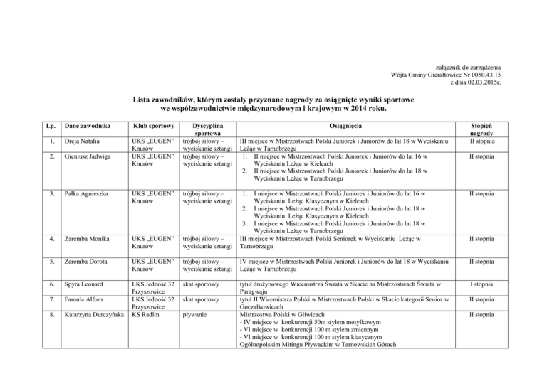 załącznik do zarządzenia Wójta Gminy Gierałtowice Nr 0050.43.15 z dnia 02.03.2015r. Lista zawodników, którym zostały przyznane nagrody za osiągnięte wyniki sportowe we współzawodnictwie międzynarodowym i krajowym w 2014 roku. Lp. Dane zawodnika Klub sportowy 1. Dreja Natalia 2. Gieniusz Jadwiga UKS „EUGEN” Knurów UKS „EUGEN” Knurów Dyscyplina sportowa trójbój siłowy – wyciskanie sztangi trójbój siłowy – wyciskanie sztangi 3. Pałka Agnieszka UKS „EUGEN” Knurów trójbój siłowy – wyciskanie sztangi 4. Zaremba Monika UKS „EUGEN” Knurów 5. Zaremba Dorota 6. Spyra Leonard 7. Famula Alfons 8. Katarzyna Durczyńska Osiągnięcia III miejsce w Mistrzostwach Polski Juniorek i Juniorów do lat 18 w Wyciskaniu Leżąc w Tarnobrzegu 1. II miejsce w Mistrzostwach Polski Juniorek i Juniorów do lat 16 w Wyciskaniu Leżąc w Kielcach 2. II miejsce w Mistrzostwach Polski Juniorek i Juniorów do lat 18 w Wyciskaniu Leżąc w Tarnobrzegu Stopień nagrody II stopnia II stopnia II stopnia trójbój siłowy – wyciskanie sztangi I miejsce w Mistrzostwach Polski Juniorek i Juniorów do lat 16 w Wyciskaniu Leżąc Klasycznym w Kielcach 2. I miejsce w Mistrzostwach Polski Juniorek i Juniorów do lat 18 w Wyciskaniu Leżąc Klasycznym w Kielcach 3. I miejsce w Mistrzostwach Polski Juniorek i Juniorów do lat 18 w Wyciskaniu Leżąc w Tarnobrzegu III miejsce w Mistrzostwach Polski Seniorek w Wyciskaniu Leżąc w Tarnobrzegu UKS „EUGEN” Knurów trójbój siłowy – wyciskanie sztangi IV miejsce w Mistrzostwach Polski Juniorek i Juniorów do lat 18 w Wyciskaniu Leżąc w Tarnobrzegu II stopnia LKS Jedność 32 Przyszowice LKS Jedność 32 Przyszowice KS Radlin skat sportowy tytuł drużynowego Wicemistrza Świata w Skacie na Mistrzostwach Świata w Paragwaju tytuł II Wicemistrza Polski w Mistrzostwach Polski w Skacie kategorii Senior w Goczałkowicach Mistrzostwa Polski w Gliwicach - IV miejsce w konkurencji 50m stylem motylkowym - VI miejsce w konkurencji 100 m stylem zmiennym - VI miejsce w konkurencji 100 m stylem klasycznym Ogólnopolskim Mitingu Pływackim w Tarnowskich Górach I stopnia skat sportowy pływanie 1. II stopnia II stopnia II stopnia - I miejsce w konkurencji 50 m stylem klasycznym - I miejsce w konkurencji 100m stylem klasycznym Międzynarodowy Mityng Pływacki w Pawłowicach - I miejsce w konkurencji 100m stylem zmiennym, - I miejsce w konkurencji 200m stylem klasycznym, - I miejsce w konkurencji 50m stylem motylkowym, - I miejsce w konkurencji 200m stylem dowolnym, - I miejsce w konkurencji 50m stylem dowolnym Mistrzostwa Śląska w Gliwicach - I miejsce w konkurencji 50m stylem klasycznym, - I miejsce w konkurencji 100m stylem klasycznym, - I miejsce w konkurencji 50m stylem motylkowym, - II miejsce w konkurencji 200m stylem klasycznym, - II miejsce 50m stylem dowolnym 9. Kalkan Jakub LKS Jedność 32 Przyszowice pływanie 10. Prokop Bartosz LKS Jedność 32 Przyszowice pływanie 11. Pierchała Maksymilian LKS Jedność 32 Przyszowice pływanie 12. Wyrobek Robert LKS Jedność 32 Przyszowice pływanie Mistrzostwa Śląska w Radlinie - II miejsce w konkurencji 200 m stylem dowolnym - III miejsce w konkurencji 100 m stylem dowolnym - III miejsce w konkurencji 100 m stylem klasycznym - III miejsce w konkurencji 100 m stylem zmiennym Mistrzostwa Śląska w Radlinie - III miejsce w konkurencji 400 m stylem dowolnym - III miejsce w konkurencji 800 m stylem dowolnym Mistrzostwa Śląska w Gliwicach - II miejsce w konkurencji 800 m stylem dowolnym - III miejsce w konkurencji 200 m stylem dowolnym Mistrzostwa Śląska w Radlinie - III miejsce w konkurencji 50 m stylem klasycznym - V miejsce w konkurencji 100 m stylem klasycznym - VI miejsce w konkurencji 100 m stylem zmiennym Mistrzostwa Śląska w Radlinie - I miejsce w konkurencji 50 m stylem grzbietowym - I miejsce w konkurencji 100 m stylem grzbietowym - I miejsce w konkurencji 200 m stylem dowolnym - I miejsce w konkurencji 100 m stylem zmiennym - I miejsce w konkurencji 4 x 50 m stylem zmiennym - II miejsce w konkurencji 4 x 50 m stylem dowolnym Mistrzostwa Śląska w Gliwicach - I miejsce w konkurencji 50 m stylem grzbietowym - I miejsce w konkurencji 100 m stylem grzbietowym - II miejsce w konkurencji 200 m stylem dowolnym III stopnia III stopnia III stopnia III stopnia 13. Browarska Emilia LKS Jedność 32 Przyszowice pływanie 14. Browarski Maciej pływanie 15. Wyrobek Rafał LKS Jedność 32 Przyszowice LKS Jedność 32 Przyszowice 16. Hudzikowski Mateusz LKS Jedność 32 Przyszowice pływanie 17. Bartnik Dariusz LKS Jedność 32 Przyszowice pływanie 18. Lamla Filip LKS Jedność 32 Przyszowice pływanie pływanie - I miejsce w konkurencji 100 m stylem zmiennym - III miejsce w konkurencji 4 x 50 m stylem zmiennym - III miejsce w konkurencji 4 x 50 m stylem dowolnym Mistrzostwa Śląska w Radlinie - I miejsce w konkurencji 50 m stylem grzbietowym - I miejsce w konkurencji 100 m stylem grzbietowym - II miejsce w konkurencji 200 m stylem dowolnym Mistrzostwa Śląska w Radlinie - IV miejsce w konkurencji 100 m stylem dowolnym Mistrzostwa Śląska w Gliwicach - VI miejsce w konkurencji 200 m stylem grzbietowym - VI miejsce w konkurencji 50 m stylem grzbietowym - VI miejsce w konkurencji 1500 m stylem dowolnym - VI miejsce w konkurencji 100 m stylem grzbietowym - V miejsce w konkurencji 200 m stylem grzbietowym Mistrzostwa Śląska w Radlinie - II miejsce w konkurencji 200 m stylem dowolnym - I miejsce w konkurencji 4 x 50 stylem zmiennym - II miejsce w konkurencji 4 x 50 stylem dowolnym Mistrzostwa Śląska w Gliwicach - III miejsce w konkurencji 100 m stylem grzbietowym - III miejsce w konkurencji 4 x 50 stylem zmiennym - III miejsce w konkurencji 4 x 50 stylem dowolnym Mistrzostwa Śląska w Radlinie - II miejsce w konkurencji 50 m stylem grzbietowym - III miejsce w konkurencji 100 m stylem grzbietowym - III miejsce w konkurencji 50 m stylem dowolnym - III miejsce w konkurencji 100 m style