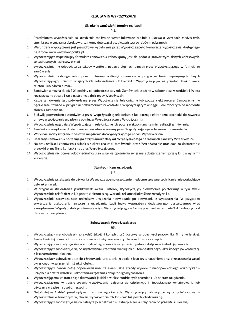 REGULAMIN WYPOŻYCZALNI Składanie zamówień i terminy realizacji § 1. 1. 2. 3. 4. 5. 6. 7. 8. 9. 10. 11. 12. 13. 14. Przedmiotem wypożyczenia są urządzenia medyczne wyprodukowane zgodnie z ustawą o wyrobach medycznych, spełniające wymagania dyrektyw oraz normy dotyczącej bezpieczeństwa wyrobów medycznych. Warunkiem wypożyczenia jest prawidłowe wypełnienie przez Wypożyczającego formularza wypożyczenia, dostępnego na stronie www.waldmannpolska.pl Wypożyczający wypełniający formularz zamówienia zobowiązany jest do podania prawdziwych danych adresowych, teleadresowych i adresów e-mail. Wypożyczalnia nie odpowiada za szkody wynikłe z podania błędnych danych przez Wypożyczającego w formularzu zamówienia. Wypożyczalnia zastrzega sobie prawo odmowy realizacji zamówień w przypadku braku wymaganych danych Wypożyczającego, uniemożliwiających ich potwierdzenie lub kontakt z Wypożyczającym, na przykład brak numeru telefonu lub adresu e-mail. Zamówienia można składać 24 godziny na dobę przez cały rok. Zamówienia złożone w soboty oraz w niedziele i święta rozpatrywane będą od rana następnego dnia pracy Wypożyczalni. Każde zamówienie jest potwierdzane przez Wypożyczalnię telefonicznie lub pocztą elektroniczną. Zamówienie nie będzie zrealizowane w przypadku braku możliwości kontaktu z Wypożyczającym w ciągu 5 dni roboczych od momentu złożenia zamówienia. Z chwilą potwierdzenia zamówienia przez Wypożyczalnię telefonicznie lub pocztą elektroniczną dochodzi do zawarcia umowy wypożyczenia urządzenia pomiędzy Wypożyczającym a Wypożyczalnią. Wypożyczalnia uzgadnia z Wypożyczającym telefonicznie lub pocztą elektroniczną termin realizacji zamówienia. Zamówione urządzenie dostarczane jest na adres wskazany przez Wypożyczającego w formularzu zamówienia. Wszystkie koszty związane z dostawą urządzenia do Wypożyczającego ponosi Wypożyczalnia. Realizacja zamówienia następuje po otrzymaniu zapłaty od Wypożyczającego na rachunek bankowy Wypożyczalni. Na czas realizacji zamówienia składa się okres realizacji zamówienia przez Wypożyczalnię oraz czas na dostarczenie przesyłki przez firmę kurierską na adres Wypożyczającego. Wypożyczalnia nie ponosi odpowiedzialności za wszelkie opóźnienia związane z dostarczeniem przesyłki, z winy firmy kurierskiej. Stan techniczny urządzenia § 2. 1. 2. 3. Wypożyczalnia przekazuje do używania Wypożyczającemu urządzenie medyczne sprawne technicznie, nie posiadające usterek ani wad. W przypadku stwierdzenia jakichkolwiek awarii i usterek, Wypożyczający niezwłocznie poinformuje o tym fakcie Wypożyczalnię telefonicznie lub pocztą elektroniczną. Warunki reklamacji określone zostały w § 4. Wypożyczalnia sprawdza stan techniczny urządzenia niezwłocznie po otrzymaniu z wypożyczenia. W przypadku stwierdzenia uszkodzenia, zniszczenia urządzenia, bądź braku wyposażenia dodatkowego, dostarczonego wraz z urządzeniem, Wypożyczalnia poinformuje o tym Wypożyczającego w formie pisemnej, w terminie 5 dni roboczych od daty zwrotu urządzenia. Zobowiązania Wypożyczającego §3. 1. 2. 3. 4. 5. 6. 7. 8. 9. Wypożyczający ma obowiązek sprawdzić jakość i kompletność dostawy w obecności pracownika firmy kurierskiej. Zaniechanie tej czynności może spowodować utratę roszczeń z tytułu szkód transportowych. Wypożyczający zobowiązuje się do samodzielnego montażu urządzenia zgodnie z dołączoną instrukcją montażu. Wypożyczający zobowiązuje się do użytkowania urządzenia według planu terapeutycznego, określonego po konsultacji z lekarzem dermatologiem. Wypożyczający zobowiązuje się do użytkowania urządzenia zgodnie z jego przeznaczeniem oraz przestrzegania zasad określonych w załączonej instrukcji obsługi. Wypożyczający ponosi pełną odpowiedzialność za ewentualne szkody wynikłe z nieodpowiedniego wykorzystania urządzenia oraz za wszelkie uszkodzenia urządzenia i dołączonego wyposażenia. Wypożyczającemu zabrania się dokonywania jakichkolwiek samodzielnych przeróbek lub napraw urządzenia. Wypożyczającemu w trakcie trwania wypożyczenia, zabrania się odpłatnego i nieodpłatnego wynajmowania lub użyczania urządzenia osobom trzecim. Najpóźniej na 1 dzień przed upływem terminu wypożyczenia, Wypożyczający zobowiązuje się do poinformowania Wypożyczalnię o kończącym się okresie wypożyczenia telefonicznie lub pocztą elektroniczną. Wypożyczający zobowiązuje się do należytego zapakowania i zabezpieczenia urządzenia do przesyłki kurierskiej. 10. Wypożyczający ponosi pełną odpowiedzialność za wszelkie uszkodzenia urządzenia wynikające z niewłaściwego zapakowania i zabezpieczenia urządzenia do przesyłki kurierskiej. Reklamacje §4. 1. 2. 3. 4. 5. Urządzenie podlega wymianie, jeżeli posiada wady fabryczne lub zostało uszkodzone mechanicznie w czasie transportu. Ewentualne uszkodzenia mechaniczne urządzenia powstałe podczas dostawy, Wypożyczający niezwłocznie zgłasza osobie dostarczającej przesyłkę i powiadamia Wypożyczalnię. Następnie Wypożyczający spisuje protokół reklamacyjny, który musi być podpisany przez kuriera. Dokumentem uprawniającym Wypożyczającego do świadczeń gwarancyjnych jest paragon lub faktura VAT. Warunkiem rozpatrzenia reklamacji przez Wypożyczalnię jest dostarczenie urządzenia w oryginalnym opakowaniu. Wypożyczalnia rozpatrzy reklamacje w terminie 7 dni roboczych od momentu jej wpłynięcia. Zwroty §5. 1. 2. 3. 4. W przypadku stwierdzenia wady urządzenia lub uszkodzenia mechanicznego powstałego w czasie transportu, Wypożyczającemu przysługuje możliwość zwrotu urządzenia w terminie 7 dni od daty odbioru urządzenia. Zwrot urządzenia odbywa się na koszt Wypożyczalni. Wypożyczalnia nie przyjmuje przesyłek odsyłanych za pobraniem. Zwracane urządzenie należy odsyłać razem z otrzymanym wraz z nim paragonem / fakturą VAT
