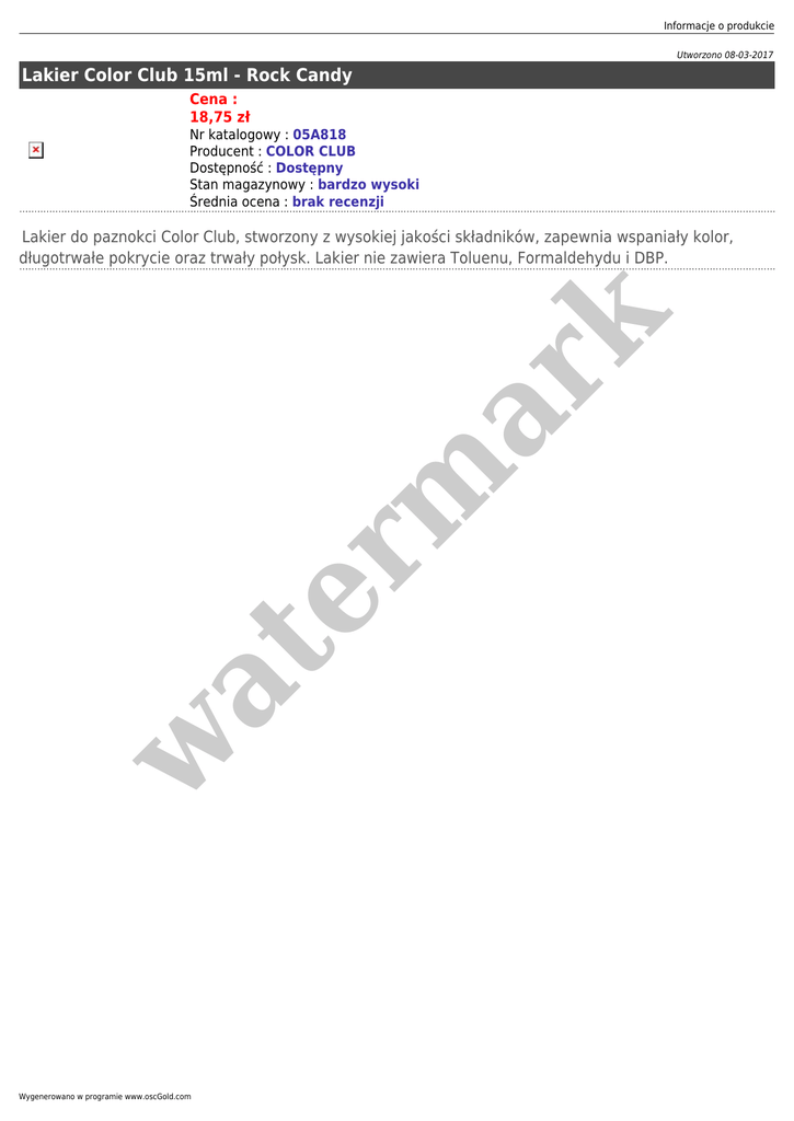 Informacje o produkcie Utworzono 08-03-2017 Lakier Color Club 15ml - Rock Candy Cena : 18,75 zł Nr katalogowy : 05A818 Producent : COLOR CLUB Dostępność : Dostępny Stan magazynowy : bardzo wysoki Średnia ocena : brak recenzji w at er m ar k Lakier do paznokci Color Club, stworzony z wysokiej jakości składników, zapewnia wspaniały kolor, długotrwałe pokrycie oraz trwały połysk. Lakier nie zawiera Toluenu, Formaldehydu i DBP. Wygenerowano w programie www.oscGold.com