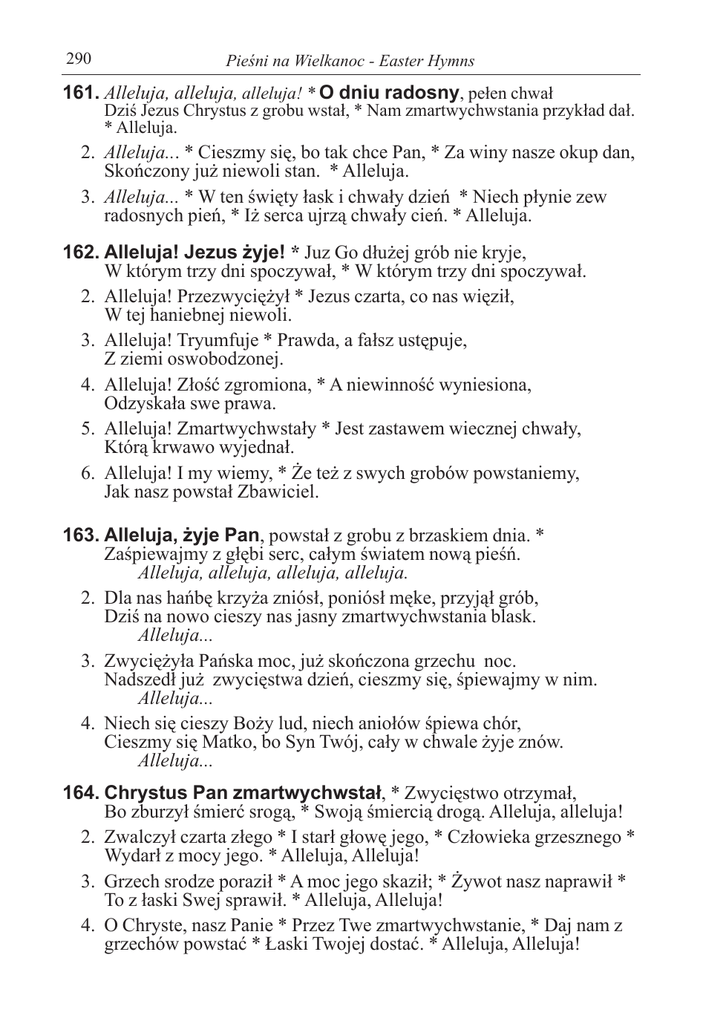 290 Pieśni na Wielkanoc - Easter Hymns 161.Alleluja, alleluja, alleluja! * O dniu radosny, pełen chwał Dziś Jezus Chrystus z grobu wstał, * Nam zmartwychwstania przykład dał. * Alleluja. 2.Alleluja... * Cieszmy się, bo tak chce Pan, * Za winy nasze okup dan, Skończony już niewoli stan. * Alleluja. 3. Alleluja... * W ten święty łask i chwały dzień * Niech płynie zew radosnych pień, * Iż serca ujrzą chwały cień. * Alleluja. 162.Alleluja! Jezus żyje! * Juz Go dłużej grób nie kryje, W którym trzy dni spoczywał, * W którym trzy dni spoczywał. 2.Alleluja! Przezwyciężył * Jezus czarta, co nas więził, W tej haniebnej niewoli. 3.Alleluja! Tryumfuje * Prawda, a fałsz ustępuje, Z ziemi oswobodzonej. 4.Alleluja! Złość zgromiona, * A niewinność wyniesiona, Odzyskała swe prawa. 5.Alleluja! Zmartwychwstały * Jest zastawem wiecznej chwały, Którą krwawo wyjednał. 6.Alleluja! I my wiemy, * Że też z swych grobów powstaniemy, Jak nasz powstał Zbawiciel. 163.Alleluja, żyje Pan, powstał z grobu z brzaskiem dnia. * Zaśpiewajmy z głębi serc, całym światem nową pieśń. Alleluja, alleluja, alleluja, alleluja. 2. Dla nas hańbę krzyża zniósł, poniósł męke, przyjął grób, Dziś na nowo cieszy nas jasny zmartwychwstania blask. Alleluja... 3. Zwyciężyła Pańska moc, już skończona grzechu noc. Nadszedł już zwycięstwa dzień, cieszmy się, śpiewajmy w nim. Alleluja... 4. Niech się cieszy Boży lud, niech aniołów śpiewa chór, Cieszmy się Matko, bo Syn Twój, cały w chwale żyje znów. Alleluja... 164.Chrystus Pan zmartwychwstał, * Zwycięstwo otrzymał, Bo zburzył śmierć srogą, * Swoją śmiercią drogą. Alleluja, alleluja! 2. Zwalczył czarta złego * I starł głowę jego, * Człowieka grzesznego * Wydarł z mocy jego. * Alleluja, Alleluja! 3. Grzech srodze poraził * A moc jego skaził; * Żywot nasz naprawił * To z łaski Swej sprawił. * Alleluja, Alleluja! 4. O Chryste, nasz Panie * Przez Twe zmartwychwstanie, * Daj nam z grzechów powstać * Łaski Twojej dostać. * Alleluja, Alleluja! Pieśni na Wielkanoc - Easter Hymns 291 165.Chrystus zmartwychwstan jest, * Nam na przykład dan jest, Iż mamy zmartwychpowstać, * Z Panem Bogiem królować.* Alleluja. 2.Leżał trzy dni w grobie, * Dał bok przebić sobie, Bok, ręce, nogi obie, * Na zbawienie tobie, Alleluja! 3.Trzy Maryje poszły, * Drogie maści niosły, Chciały Chrystusa pomazać, * Jemu cześć i chwałę dać, Alleluja! 4.Gdy na drodze były, * Tak sobie mówiły: Jest tam kamień niemały, * A któż nam go odwali, Alleluja! 5.Powiedz nam, Maryja, * Gdzieś Pana widziała? Widziałam Go po męce, * Trzymał chorągiew w ręce. Alleluja! 6.Gdy nad grobem stały, * Rzekł im Anioł biały: Nie bójcie się, Maryje, * Zmartwychwstał Pan i żyje. Alleluja! 7.Jezusa szukacie? * Tu Go nie znajdziecie, Wstałci z martwych, grób pusty. * Oto śmiertelne chusty. Alleluja! 167.Już Zbawiciel, Jezus żyje, * On, co za nas życie dał. Już Go grobu moc nie kryje, * Jak powiedział, zmartwychwstał. Nućmyż Jemu pienia chwały: * Witaj, Jezu zmartwychwstały! Alleluja, alleluja, alleluja, alleluja. 2.Triumfuje nad wrogami, * Śmiercią skruszył śmierci grot. * Piekło ściele pod nogami, * Trzyma klucz do niebios wrót. Nućmyż Jemu... 3. Dla mnieś, ożył, Chryste Panie, * Niechże duch mój z Tobą wraz, Z grzechów grobu zmartwychwstanie, * Złych nałogów zrzuci głaz. Bym Ci nucił pienia chwały... 168.Nie zna śmierci Pan żywota, * Chociaż przeszedł przez jej wrota; Rozerwała grobu pęta, * Ręka święta. Alleluja. 2.Twój, Adamie, dług spłacony, * Okup ludzki dokończony; Wnijdziesz w niebo z szczęśliwymi, * Dziećmi twymi. Alleluja! 3.Próżno straże, grób strzeżecie, * Już Go tutaj nie znajdziecie, Wstał, przeniknął skalne mury, * Bóg natury. Alleluja! 4.Teraz On na ludzkie plemię, * I na miłą patrzy ziemię. Która drogo dziś przybrana, * Kosztem Pana. Alleluja! 5. Przez Twe święte zmartwychwstanie * Z grzechów powstać daj nam, Panie. * Potem z Tobą królowanie. * Alleluja, Alleluja! 169.Otrzyjcie już łzy płaczący, żale z serca wyzujcie. Wszyscy w Chrystusa wierzący, weselcie się, radujcie. Bo zmartwychwstał samowładnie, jak przepowiedział dokładnie. Alleluja, alleluja, niechaj zabrzmi alleluja! 292 Pieśni na Wielkanoc - Easter Hymns 2.Darmo kamień wagi wielkiej, Żydzi na grób wtoczyli; Darmo dla pewności wszelkiej, zbrojnej straży użyli. Na nic straż, pieczęć i skała, nad grobem Pana się zdała, Alleluja... 3.Bóg wszechmocny, Bóg natury, wyższy nad wszystkie twory, Wstaje z grobu, kruszy mury, nie zna żadanej zapory. Zdjęta trwogą, straż upada, i prawie sobą nie włada, Alleluja... 4.Salome i dwie Maryje w grobie czasu rannego Słyszały głos: „Pan wasz żyje, tu tylko odzież Jego; Idźcie i to wszystko coście widziały, uczniom ogłoście”. Alleluja... 171.Przez Twoje święte zmartwychpowstanie, Boży Synu odpuść nam, nasze zgrzeszenie, Wierzymy, iżeś zmartwychpowstał, Żywoteś nasz naprawił, Śmierci wiecznej nas zbawił, Swoją świętą moc zjawił. 172.Wesel się Królowo miła, * Bo Ten, któregoś zrodziła, Zmartwychwstał Pan nad panami, * Módl się do Niego za nami. Alleluja, alleluja! 2. Ciesz się i wesel się w niebie, * Proś Go za nami w potrzebie, Byśmy się też tam dostali * I na wiek wieków śpiewali. Alleluja, alleluja! 173.Wesoły nam dzień dziś nastał, * Którego z nas każdy żądał; Tego dnia Chrystus zmartwychwstał. Alleluja, alleluja! 2. Król niebieski k'nam zawitał, * Jako śliczny kwiat zakwitał; Po śmierci się nam pokazał. Alleluja, alleluja! 3. Piekielne moce zwojował, * Nieprzyjaciela podeptał, Nad nędznymi się zmiłował. Alleluja, alleluja! 4. Do trzeciego dnia tam mieszkał, * Ojce święte tam pocieszał, Potem iść za Sobą kazał. Alleluja, alleluja! 5. Którzy w otchłaniach mieszkali, * Płaczliwie tam zawołali, Gdy Zbawiciela