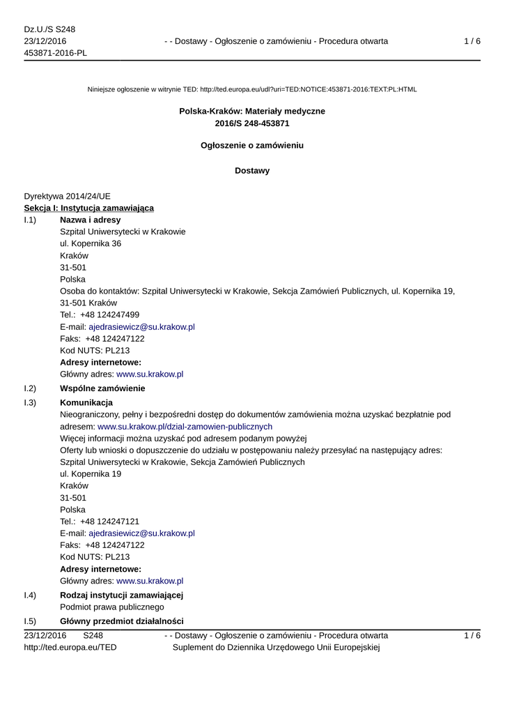Dz.U./S S248 23/12/2016 453871-2016-PL - - Dostawy - Ogłoszenie o zamówieniu - Procedura otwarta 1/6 Niniejsze ogłoszenie w witrynie TED: http://ted.europa.eu/udl?uri=TED:NOTICE:453871-2016:TEXT:PL:HTML Polska-Kraków: Materiały medyczne 2016/S 248-453871 Ogłoszenie o zamówieniu Dostawy Dyrektywa 2014/24/UE Sekcja I: Instytucja zamawiająca I.1) Nazwa i adresy Szpital Uniwersytecki w Krakowie ul. Kopernika 36 Kraków 31-501 Polska Osoba do kontaktów: Szpital Uniwersytecki w Krakowie, Sekcja Zamówień Publicznych, ul. Kopernika 19, 31-501 Kraków Tel.: +48 124247499 E-mail: [email protected] Faks: +48 124247122 Kod NUTS: PL213 Adresy internetowe: Główny adres: www.su.krakow.pl I.2) Wspólne zamówienie I.3) Komunikacja Nieograniczony, pełny i bezpośredni dostęp do dokumentów zamówienia można uzyskać bezpłatnie pod adresem: www.su.krakow.pl/dzial-zamowien-publicznych Więcej informacji można uzyskać pod adresem podanym powyżej Oferty lub wnioski o dopuszczenie do udziału w postępowaniu należy przesyłać na następujący adres: Szpital Uniwersytecki w Krakowie, Sekcja Zamówień Publicznych ul. Kopernika 19 Kraków 31-501 Polska Tel.: +48 124247121 E-mail: [email protected] Faks: +48 124247122 Kod NUTS: PL213 Adresy internetowe: Główny adres: www.su.krakow.pl I.4) Rodzaj instytucji zamawiającej Podmiot prawa publicznego I.5) Główny przedmiot działalności 23/12/2016 S248 http://ted.europa.eu/TED - - Dostawy - Ogłoszenie o zamówieniu - Procedura otwarta Suplement do Dziennika Urzędowego Unii Europejskiej 1/6 Dz.U./S S248 23/12/2016 453871-2016-PL - - Dostawy - Ogłoszenie o zamówieniu - Procedura otwarta 2/6 Zdrowie Sekcja II: Przedmiot II.1) Wielkość lub zakres zamówienia II.1.1) Nazwa: Dostawa materiałów ortopedycznych (DFZP-AJ-271-177/2016). Numer referencyjny: DFZP-AJ-271-177/2016 II.1.2) Główny kod CPV 33140000 II.1.3) Rodzaj zamówienia Dostawy II.1.4) Krótki opis: Przedmiotem zamówienia jest dostawa materiałów ortopedycznych. II.1.5) Szacunkowa całkowita wartość Wartość bez VAT: 617 650.00 PLN II.1.6) Informacje o częściach To zamówienie podzielone jest na części: tak Oferty można składać w odniesieniu do wszystkich części II.2) Opis II.2.1) Nazwa: Część 1 Część nr: 1 II.2.2) Dodatkowy kod lub kody CPV 33140000 II.2.3) Miejsce świadczenia usług Kod NUTS: PL213 Główne miejsce lub lokalizacja realizacji: Szpital Uniwersytecki w Krakowie. II.2.4) Opis zamówienia: System endoprotez obręczy barkowo-ramiennej 1. Endoproteza anatomiczna cementowana z panewką PE – 10 kompl. 2. Endoproteza odwrócona z panewką PE – 10 kompl. 3. Endoproteza anatomiczna pełna bezcementowa – 7 kompl. 4. Endoproteza połowicza bezcementowana – 7 kompl. II.2.5) Kryteria udzielenia zamówienia Kryteria określone poniżej Cena II.2.6) Szacunkowa wartość Wartość bez VAT: 253 800.00 PLN II.2.7) Okres obowiązywania zamówienia, umowy ramowej lub dynamicznego systemu zakupów Koniec: 31/08/2017 Niniejsze zamówienie podlega wznowieniu: nie II.2.10) Informacje o ofertach wariantowych 23/12/2016 S248 http://ted.europa.eu/TED - - Dostawy - Ogłoszenie o zamówieniu - Procedura otwarta Suplement do Dziennika Urzędowego Unii Europejskiej 2/6 Dz.U./S S248 23/12/2016 453871-2016-PL - - Dostawy - Ogłoszenie o zamówieniu - Procedura otwarta 3/6 Dopuszcza się składanie ofert wariantowych: nie II.2.11) Informacje o opcjach Opcje: nie II.2.12) Informacje na temat katalogów elektronicznych II.2.13) Informacje o funduszach Unii Europejskiej Zamówienie dotyczy projektu/programu finansowanego ze środków Unii Europejskiej: nie II.2.14) Informacje dodatkowe 1. Wadium wynosi 7600.00 PLN II.2) Opis II.2.1) Nazwa: Część 2 Część nr: 2 II.2.2) Dodatkowy kod lub kody CPV 33140000 II.2.3) Miejsce świadczenia usług Kod NUTS: PL213 Główne miejsce lub lokalizacja realizacji: Szpital Uniwersytecki w Krakowie. II.2.4) Opis zamówienia: Zestaw do rekonstrukcji wiązadeł krzyżowych kolana 1. System do rekonstrukcji więzadła przedniego oparty na fiksacji korówkowej za pomocą podłużnej płytki – 100 kompl. 2. System do rekonstrukcji więzadła przedniego ACL i tylnego PCL (trzy rodzaje) – 100 kompl. 3. Implant Biokompozytowy -100 szt. 4. Drut wiercący – 100 szt. 5. Drut celowniczy – 100 szt. 6. Drut wiercący – 100 szt. 7. Zestaw do szycia łękotki all-inside – 50 kompl. 8. System do rekonstrukcji więzadła przedniego ACL i tylnego PCL – 50 kompl. 9. Szwy dedykowane do obszycia przeszczepu – 50 szt. 10. Guziki do mocowania przeszczepu – 100 szt. 11. Guzik rewizyjny – 30 szt. 12. Pętla pusta do zabiegów rekonstrukcji ACL – 30 szt. 13. Specjalistyczny szew do zabiegów ortopedycznych – 50 szt. II.2.5) Kryteria udzielenia zamówienia Kryteria określone poniżej Cena II.2.6) Szacunkowa wartość Wartość bez VAT: 363 850.00 PLN II.2.7) Okres obowiązywania zamówienia, umowy ramowej lub dynamicznego systemu zakupów Koniec: 31/08/2017 Niniejsze zamówienie podlega wznowieniu: nie II.2.10) Informacje o ofertach wariantowych 23/12/2016 S248 http://ted.europa.eu/TED - - Dostawy - Ogłoszenie o zamówieniu - Procedura otwarta Suplement do Dziennika Urzędowego Unii Europejskiej 3/6 Dz.U./S S248 23/12/2016 453871-2016-PL - - Dostawy - Ogłoszenie o zamówieniu - Procedura otwarta 4/6 Dopuszcza się składanie ofert wariantowych: nie II.2.11) Informacje o opcjach Opcje: nie II.2.12) Informacje na temat katalogów elektronicznych II.2.13) Informacje o funduszach Unii Europejskiej Zamówienie dotyczy projektu/programu finansowanego ze środków Unii Europejskiej: nie II.2.14) Informacje dodatkowe 1. Wadium wynosi 10900.00 PLN Sekcja III: Informacje o charakterze prawnym, ekonomicznym, finansowym i technicznym III.1) Warunki udziału III.1.1) Zdolność do prowadzenia działalności zawodowej, w tym wymogi związane z wpisem do rejestru zawodowego lub handlowego Wykaz i krótki opis warunków: Zamawiający nie określił 