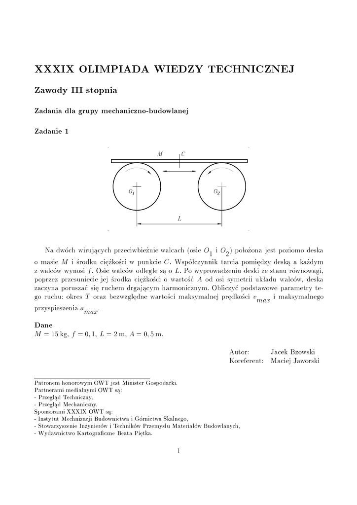 XXXIX OLIMPIADA WIEDZY TECHNICZNEJ Zawody III stopnia Zadania dla grupy mechaniczno-budowlanej Zadanie 1 Na dwóch wiruj¡cych przeciwbie»nie walcach (osie O1 i O2 ) poªo»ona jest poziomo deska o masie M i ±rodku ci¦»ko±ci w punkcie C . Wspóªczynnik tarcia pomi¦dzy desk¡ a ka»dym z walców wynosi f . Osie walców odlegªe s¡ o L. Po wyprowadzeniu deski ze stanu równowagi, poprzez przesuniecie jej ±rodka ci¦»ko±ci o warto±¢ A od osi symetrii ukªadu walców, deska zaczyna porusza¢ si¦ ruchem drgaj¡cym harmonicznym. Obliczy¢ podstawowe parametry tego ruchu: okres T oraz bezwzgl¦dne warto±ci maksymalnej pr¦dko±ci vmax i maksymalnego przyspieszenia amax. Dane M = 15 kg, f = 0; 1, L = 2 m, A = 0; 5 m. Autor: Jacek Bzowski Koreferent: Maciej Jaworski Patronem honorowym OWT jest Minister Gospodarki. Partnerami medialnymi OWT s¡: - Przegl¡d Techniczny, - Przegl¡d Mechaniczny. Sponsorami XXXIX OWT s¡: - Instytut Mechnizacji Budownictwa i Górnictwa Skalnego, - Stowarzyszenie In»ynierów i Techników Przemysªu Materiaªów Budowlanych, - Wydawnictwo Kartograczne Beata Pi¦tka. 1 Zadanie 2 Rysunek przedstawia wag¦ dziesi¦tn¡ tj. wag¦, w której stan równowagi osi¡ga si¦, gdy ci¦»ar odwa»ników P jest dziesi¦ciokrotnie mniejszy od ci¦»aru wa»onego ciaªa W . Dla belki AD obliczy¢ dªugo±¢ odcinka BC (wymiar b) i odcinka CD (wymiar c) tak, aby wynik wa»enia nie zale»aª od miejsca poªo»enia ciaªa na platformie wagowej. Dane a = 0; 8 m, d = 1 m, f = 0; 20 m. Uwaga Stan równowagi osi¡gany jest przy poziomym poªo»eniu belki AD. Autor: Jacek Bzowski Koreferent: Maciej Jaworski Zadanie 3 Fragmentem pewnego modernizowanego obiektu s¡ wspornikowe belki z ceowników 300 usytuowane wzgl¦dem siebie w styk i nie s¡ mi¦dzy sob¡ st¦»one (Rys.1); tworz¡ wi¦c rodzaj wspornikowej pªyty. Pªyt¦ t¦ postanowiono wykorzysta¢ jako swoisty magazyn materiaªów budowlanych, przy czym maksymalne obci¡»enie nimi pªyty okre±lono jako q. Powstaªa jednak obawa, »e pªyta z ceowników mo»e okaza¢ si¦ zbyt sªaba, aby obci¡»enie to bezpiecznie przenie±¢, tj. bez przekroczenia napr¦»e« dozwolonych k. Przeprowadzono odpowiednie obliczenia, które obawy te potwierdziªy. Postanowiono wi¦c pªyt¦ t¦ wzmocni¢ w sposób pokazany na rysunku (Rys.2). Wykorzystano w tym celu dost¦pne materiaªy: dwuteownik HEB 300 oraz stalowe rury o ±rednicy zewn¦trznej D i grubo±ci ±cianki g. Peªne charakterystyki ceowników, dwuteownika oraz rur, wymiary geometryczne podano w danych liczbowych na ko«cu tre±ci zadania. 2 Rys.1 1. Przedstaw obliczenia wskazuj¡ce na niedostateczn¡ no±no±¢ pªyty. 2. Oblicz w jakim poziomym rozstawie x nale»y pionowo rozmie±ci¢ rury, aby nie ulegªy wyboczeniu? Dolne ko«ce rur s¡ utwierdzone w betonowym fundamencie, natomiast poª¡czenie górnych ko«ców rur z dwuteownikiem nale»y traktowa¢ jako przegubowo-przesuwne. Wszystkie wzory potrzebne do rozwi¡zania zadania s¡ w ka»dym poradniku. Nale»y uwzgl¦dni¢ ci¦»ar wªasny pªyty z ceowników oraz dwuteownika, natomiast ci¦»ar wªasny rur i st¦»e« pokazanych na rysunku (Rys.2) lini¡ przerywan¡ mo»na pomin¡¢. St¦»enia te nie odgrywaj¡ w zadaniu istotnej roli, ich obecno±¢ mo»na pomin¡¢. Wskazówka: Ze wzgl¦du na du»¡ dªugo±¢ pªyty z ceowników, mo»na j¡ potraktowa¢ jako walcowo zginane pasmo pªytowe, tj. mo»na wyodr¦bni¢ pewien fragment jej dªugo±ci i traktowa¢ go jak zginan¡ belk¦. Lokalnego zginania dwuteownika (Rys.2) mo»na nie uwzgl¦dnia¢. Dane liczbowe Ceownik 300: szeroko±¢ b = 0; 30 m; wska¹nik wytrzymaªo±ci Wy = 67; 8 10 6 m3 ; ci¦»ar jednostkowy g1 = 0; 462 kN/m Dwuteownik HEB300: ci¦»ar jednostkowy g2 = 1; 170 kN/m Rury stalowe: moment bezwªadno±ci J = 27; 9 10 8 m4; D = 57 mm; g = 5 mm Moduª odksztaªcalno±ci (Younga) stali E = 2; 1 105 MPa; napr¦»enia dopuszczalne na zginanie stali k = 200 MPa 3 Maksymalne obci¡»enie pªyty materiaªami budowlanymi q = 4 kN/m2 Wymiary geometryczne: wysi¦g wspornika l = 4; 5 m, wysoko±¢ rury h = 5 m. UWAGA: W obliczeniach pomin¡¢ szeroko±¢ dwuteownika. Rys.2 Autor: Wojciech Radomski Koreferent: Jacek Bzowski 4