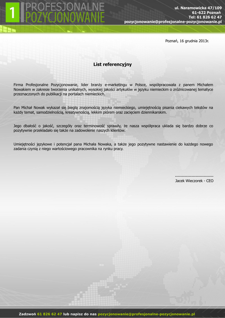 ul. Naramowicka 47/109 61-622 Poznań Tel: 61 826 62 47 [email protected] Poznań, 16 grudnia 2013r. List referencyjny Firma Profesjonalne Pozycjonowanie, lider branży e-marketingu w Polsce, współpracowała z panem Michałem Nowakiem w zakresie tworzenia unikalnych, wysokiej jakości artykułów w języku niemieckim o zróżnicowanej tematyce przeznaczonych do publikacji na portalach niemieckich. Pan Michał Nowak wykazał się biegłą znajomością języka niemieckiego, umiejętnością pisania ciekawych tekstów na każdy temat, samodzielnością, kreatywnością, lekkim piórem oraz zacięciem dziennikarskim. Jego dbałość o jakość, szczegóły oraz terminowość sprawiły, że nasza współpraca układa się bardzo dobrze co pozytywnie przekładało się także na zadowolenie naszych klientów. Umiejętności językowe i potencjał pana Michała Nowaka, a także jego pozytywne nastawienie do każdego nowego zadania czynią z niego wartościowego pracownika na rynku pracy. ---------------------------Jacek Wieczorek - CEO Zadzwoń 61 826 62 47 lub napisz do nas [email protected]