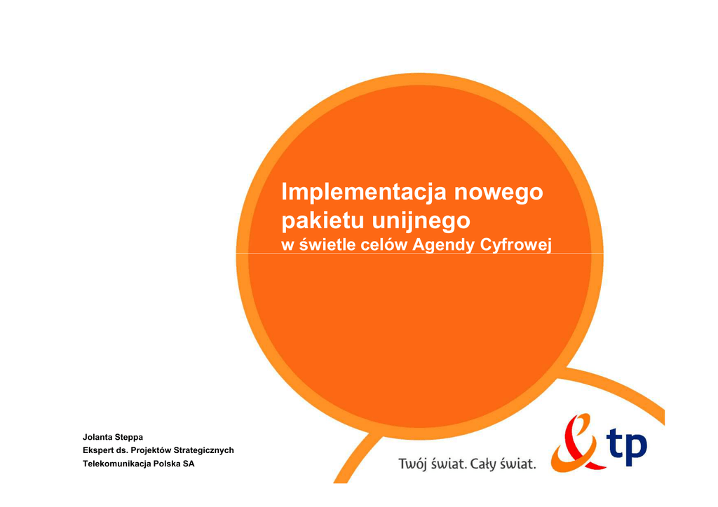 Implementacja nowego pakietu unijnego w świetle celów Agendy Cyfrowej Jolanta Steppa Ekspert ds. Projektów Strategicznych Telekomunikacja Polska SA Agenda Cyfrowa w obszarze szybkiego i bardzo szybkiego dostępu do Internetu – działania o charakterze legislacyjnym • Dynamiczny jednolity rynek cyfrowy • Interoperacyjność i normy • Zaufanie i bezpieczeństwo • Szybki i bardzo szybki dostęp do Internetu • Wzmocnienie umiejętności wykorzystywania technologii cyfrowych i włączenia społecznego Korzyści z TIK dla społeczeństwa UE • Zaproponowanie decyzji Parlamentu Europejskiego i Rady w sprawie programu europejskiej polityki w zakresie widma radiowego Wydanie zalecenia w celu zachęcania do inwestycji w konkurencyjne sieci nowej generacji Działania legislacyjne dla Państw Członkowskich: – – – 2 Ułatwienie inwestycji w Internet szerokopasmowy Wdrożenie polityki w zakresie widma radiowego Wdrożenie zalecenia KE zachęcającego do inwestycji w NGA Podstawowy szerokopasmowy dostęp do Internetu dla 100% wszystkich obywateli UE do 2013 r.: Dostęp do Internetu o przepustowości 30 Mb/s dla 100 % obywateli UE do 2020 r.: Dostęp do bardzo szybkich sieci szerokopasmowych do 2020 r.; 50 % europejskich gospodarstw domowych powinno mieć abonament na dostęp do Internetu o przepustowości powyżej 100 Mb/s. Działanie Nr 8 Agendy Cyfrowej – decyzja w sprawie europejskiej polityki w zakresie widma radiowego Status prac Zaproponowanie decyzji Parlamentu Europejskiego i Rady w sprawie programu europejskiej polityki w zakresie widma w celu zwiększenia skuteczności zarządzania widmem radiowym Drugie czytanie RSPP w Parlamencie Europejskim – 1Q 2012 Główne założenia wynikające z Agendy Cyfrowej: promocja efektywnego zarządzania widmem, zapewnienie dodatkowej elastyczności (również dzięki umożliwieniu handlu częstotliwościami) wspieranie konkurencyjności i innowacyjności Dyrektywy 2009 Zapewnienie efektywności wykorzystywania widma Obiektywne, przejrzyste, niedyskryminujace i proporcjonalne zasady przyznawania widma Neutralność technologii i usług wykorzystywanych w poszczególnych pasmach Wprowadzenie mechanizmu przekazania praw do zarządzania częstotliwościami Uprawnienie dla państw członkowskich do określenia zasad zapobiegających przetrzymywaniu widma Nowelizacja Pt. Ustawowe ograniczenie czasu rezerwacji częstotliwości (15 lat). Arbitralne ustawowe stwierdzenie, że 15 lat jest wystarczające dla spełnienia wszystkich przesłanek (charakter usług, inwestycje, kierunki rozwoju) Jednorazowa dodatkowa opłata za przedłużenie rezerwacji częstotliwości – – 3 Fiskalny charakter propozycji Mniejsze możliwości rozwoju rynku Działanie Nr 8 Agendy Cyfrowej – wydanie zalecenia zachęcającego do inwestycji w sieci nowej generacji. Wydanie zalecenia w celu zachęcania do inwestycji w konkurencyjne sieci nowej generacji 4 Główne założenia Zalecenia wynikające z Agendy Cyfrowej: przy ustalaniu cen dostępu uzależnionych od kosztów należy odpowiednio uwzględnić ryzyko inwestycyjne krajowe organy regulacyjne powinny mieć możliwość stosowania w każdym przypadku najbardziej odpowiednich środków zaradczych w zakresie dostępu, co zezwoli na rozsądne tempo inwestycji alternatywnych operatorów, uwzględniając jednocześnie poziom konkurencji na danym obszarze należy promować mechanizmy wspólnych inwestycji i podziału ryzyka Działanie Nr 8 Agendy Cyfrowej – wdroŜenie zalecenia zachęcającego do inwestycji w sieci nowej generacji. Zalecenie NGA: przy ustalaniu cen dostępu uzależnionych od kosztów należy odpowiednio uwzględnić ryzyko inwestycyjne Risk Premium – podstawowa zachęta inwestycyjna dla operatora SMP Dyrektywy: Art. 8 ust. 5 lit d DR – zagwarantowanie, że każdy przypadek udzielenia dostępu uwzględnia ryzyko inwestycyjne Art. 13 DD – w celu zachęt inwestycyjnych, w tym inwestycji w NGA, „NRA biorą pod uwagę dokonane przez operatora inwestycje oraz umożliwiają uzyskanie zwrotu stosownej części zainwestowanego kapitału, uwzględniając wszelkie ryzyko typowe dla przedsięwzięcia” krajowe organy regulacyjne powinny mieć możliwość stosowania w każdym przypadku najbardziej odpowiednich środków zaradczych w zakresie dostępu Nowelizacja Prawa telekomunikacyjnego: należy promować mechanizmy wspólnych inwestycji i podziału ryzyka 5 Dodanie do art. 39 ust. 6 w brzmieniu „W przypadku nowego przedsięwzięcia inwestycyjnego Prezes UKE, ustalając opłaty z tytułu dostępu, bierze również pod uwagę możliwość zaistnienia ryzyka związanego z przedsięwzięciem inwestycyjnym, typowego dla nowych sieci dostępu wspierających produkty, na które popyt jest niepewny”. Działanie Nr 8 Agendy Cyfrowej – wdroŜenie zalecenia zachęcającego do inwestycji w sieci nowej generacji. Ryzyko inwestycyjne w nowelizacji Pt przy ustalaniu cen dostępu uzależnionych od kosztów należy odpowiednio uwzględnić ryzyko inwestycyjne krajowe organy regulacyjne powinny mieć możliwość stosowania w każdym przypadku najbardziej odpowiednich środków zaradczych w zakresie dostępu należy promować mechanizmy wspólnych inwestycji i podziału ryzyka Art. 39 Pt - nowelizacja nie zawiera gwarancji zwrotu zaangażowanego kapitału uwzględniającego wszelkie ryzyko inwestycyjne Brak rozwiązań dla ryzyka inwestycyjnego w art. 40 Pt (koszty ponoszone); obowiązki kosztowe TP na wszystkich rynkach hurtowych wynikają z art. 40 Pt Regulator weryfikując stawki oparte o koszty ponoszone bierze pod uwagę: – – Brak Risk premium jako przesłanki weryfikacji kosztów przez Regulatora Zmiany w Pt zapowiedziane po konsultacjach społecznych – – 6 promocję efektywności i zrównoważonej konkurencji zapewnienie maksymalnych korzyści dla użytkowników końcowych. Zapewnienie zwrotu zainwestowanego kapitału – dla art. 39 i 40 Pt Pominięcie uwzględnienia ryzyka inwestycyjnego Dz