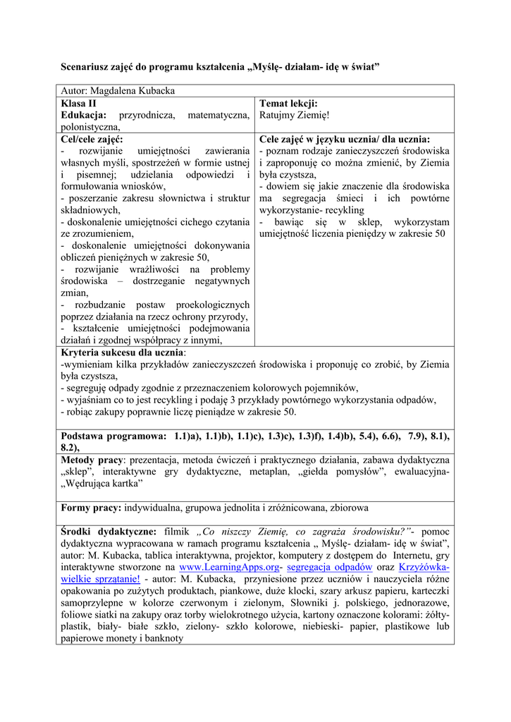 Scenariusz zajęć do programu kształcenia „Myślę- działam- idę w świat” Autor: Magdalena Kubacka Klasa II Temat lekcji: Edukacja: przyrodnicza, matematyczna, Ratujmy Ziemię! polonistyczna, Cel/cele zajęć: Cele zajęć w języku ucznia/ dla ucznia: - rozwijanie umiejętności zawierania - poznam rodzaje zanieczyszczeń środowiska własnych myśli, spostrzeżeń w formie ustnej i zaproponuję co można zmienić, by Ziemia i pisemnej; udzielania odpowiedzi i była czystsza, formułowania wniosków, - dowiem się jakie znaczenie dla środowiska - poszerzanie zakresu słownictwa i struktur ma segregacja śmieci i ich powtórne składniowych, wykorzystanie- recykling - doskonalenie umiejętności cichego czytania - bawiąc się w sklep, wykorzystam ze zrozumieniem, umiejętność liczenia pieniędzy w zakresie 50 - doskonalenie umiejętności dokonywania obliczeń pieniężnych w zakresie 50, - rozwijanie wrażliwości na problemy środowiska – dostrzeganie negatywnych zmian, - rozbudzanie postaw proekologicznych poprzez działania na rzecz ochrony przyrody, - kształcenie umiejętności podejmowania działań i zgodnej współpracy z innymi, Kryteria sukcesu dla ucznia: -wymieniam kilka przykładów zanieczyszczeń środowiska i proponuję co zrobić, by Ziemia była czystsza, - segreguję odpady zgodnie z przeznaczeniem kolorowych pojemników, - wyjaśniam co to jest recykling i podaję 3 przykłady powtórnego wykorzystania odpadów, - robiąc zakupy poprawnie liczę pieniądze w zakresie 50. Podstawa programowa: 1.1)a), 1.1)b), 1.1)c), 1.3)c), 1.3)f), 1.4)b), 5.4), 6.6), 7.9), 8.1), 8.2), Metody pracy: prezentacja, metoda ćwiczeń i praktycznego działania, zabawa dydaktyczna „sklep”, interaktywne gry dydaktyczne, metaplan, „giełda pomysłów”, ewaluacyjna„Wędrująca kartka” Formy pracy: indywidualna, grupowa jednolita i zróżnicowana, zbiorowa Środki dydaktyczne: filmik „Co niszczy Ziemię, co zagraża środowisku?”- pomoc dydaktyczna wypracowana w ramach programu kształcenia „ Myślę- działam- idę w świat”, autor: M. Kubacka, tablica interaktywna, projektor, komputery z dostępem do Internetu, gry interaktywne stworzone na www.LearningApps.org- segregacja odpadów oraz Krzyżówkawielkie sprzątanie! - autor: M. Kubacka, przyniesione przez uczniów i nauczyciela różne opakowania po zużytych produktach, piankowe, duże klocki, szary arkusz papieru, karteczki samoprzylepne w kolorze czerwonym i zielonym, Słowniki j. polskiego, jednorazowe, foliowe siatki na zakupy oraz torby wielokrotnego użycia, kartony oznaczone kolorami: żółtyplastik, biały- białe szkło, zielony- szkło kolorowe, niebieski- papier, plastikowe lub papierowe monety i banknoty Przebieg zajęć „Drogowskazy” -wskazówki i uwagi o realizacji Centra Aktywnej Edukacji 1. Wprowadzenie do zajęć- powitanie w kole na dywanie. Zabawa artystyczno„głuchy telefon”- hasło: temat zajęć- Ratujmy Ziemię! ruchowe Ustalenie celów zajęć i kryteriów sukcesu uczniów. 2. Nauczyciel umieszcza na tablicy szary arkusz papieru z zapisanym pytaniem problemowym: Co trzeba zrobić, aby ratować Ziemię? Wspólnie z uczniami układa metaplan. Zadaje i zapisuje kolejno pytania: Jak jest? Jak powinno być? Dlaczego tak nie jest jak powinno być? Uczniowie pracując w parach zastanawiają się nad tym co zagraża środowisko, co niszczy Ziemię. Swoje pomysły zapisują na czerwonych, samoprzylepnych karteczkach, następnie wklejają pod zapisanym na metaplanie pytaniem: Jak jest? Po wklejeniu kartek przez wszystkie pary, nauczyciel lub chętny uczeń odczytuje zapisane pomysły dzieci. (np. fabryki zatruwają powietrze, wodę, samochody emitują spaliny, wypalane są łąki, wycinane lasy, produkuje się dużo śmieci itp.- według pomysłu dzieci). 3. Prezentacja filmiku „Co niszczy Ziemię, co zagraża środowisku?”pomoc dydaktyczna wypracowana w ramach programu kształcenia „ Myślę- działam- idę w świat”, autor: M. Kubacka. 4. Próby szukania odpowiedzi na pytanie: Jak powinno być? Uczniowie pracując dalej w parach zapisują swoje propozycje na zielonych, samoprzylepnych karteczkach, które dalej wklejają w metaplan pod pytaniem: Jak powinno być? Po wklejeniu kartek przez wszystkie pary, nauczyciel lub chętny uczeń odczytuje zapisane pomysły dzieci. (np. filtry na kominach i w samochodach, rower zamiast samochodu, sadzenie nowych drzew, opakowania i torby wielokrotnego użycia, segregacja śmieci itp.- według pomysłu dzieci). 5. Dlaczego nie jest tak, jak powinno być?- wspólne szukanie odpowiedzi na pytanie (nauczyciel lub chętne dzieci zapisują propozycje na metaplanie). Omówienie i podsumowanie pomysłów na poprawę sytuacji jaka jest na naszej planecie. 6. Zabawa dydaktyczna: „Mądrze kupuj i odpadów nie produkuj!”doskonalenie umiejętności obliczeń pieniężnych w zakresie 50. polonistycznokomunikacyjne matematycznoprzyrodnicze W centrum artystyczno- ruchowym przygotowane są dwa sklepy (stoliki lub stragany zbudowane z piankowych klocków). Produkty do kupienia w sklepach to przyniesione przez uczniów dzień wcześniej różne opakowania po produktach spożywczych, przemysłowych itp. (np. opakowanie po paście do zębów w kartoniku i samą tubkę, ciastka w opakowaniu foliowym i w kartoniku itp.)- według pomysłu i możliwości uczniów. Nauczyciel przygotowuje też kilka opakowań po produktach, np. opakowanie po kremie- samo pudełko i pudełko z kartonikiem, itp. Do zabawy potrzebne będą monety i banknoty dostępne w pomocach dydaktycznych szkoły lub powielone i wycięte wcześniej w domu przez uczniów (po 50 zł dla ucznia)- Załącznik nr 1 Należy tez przygotować „cenki” do zapisania przez uczniów cen produktów w sklepie. Nauczyciel wybiera 2 chętnych uczniów do roli sprzedawcy, którym daje do pakowania: jednorazowe, foliowe siatki, torby wielokrotnego użycia, papier do owijania, kartony. Umawia się ze sprzeda