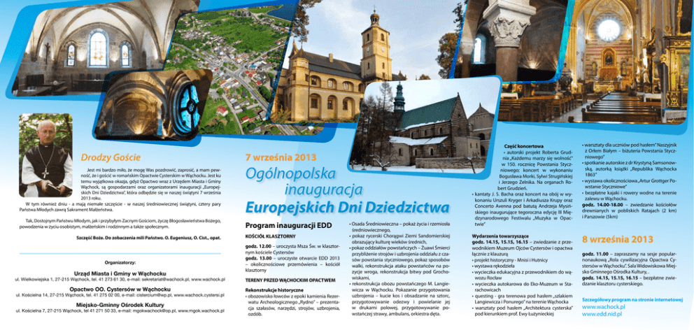 Drodzy Goście 7 września 2013 Jest mi bardzo miło, że mogę Was pozdrowić, zaprosić, a mam pewność, że i gościć w romańskim Opactwie Cysterskim w Wąchocku. Jest ku temu wyjątkowa okazja, gdyż Opactwo wraz z Urzędem Miasta i Gminy Wąchock, są gospodarzami oraz organizatorami inauguracji „Europejskich Dni Dziedzictwa”, która odbędzie się w naszej świątyni 7 września 2013 roku. W tym również dniu - a mają niemałe szczęście - w naszej średniowiecznej świątyni, cztery pary Państwa Młodych zawrą Sakrament Małżeństwa. Ogólnopolska inauguracja Europejskich Dni Dziedzictwa Tak, Dostojnym Państwu Młodym, jak i przybyłym Zacnym Gościom, życzę Błogosławieństwa Bożego, powodzenia w życiu osobistym, małżeńskim i rodzinnym a także społecznym. Program inauguracji EDD Szczęść Boże. Do zobaczenia mili Państwo. O. Eugeniusz, O. Cist., opat. Organizatorzy: Urząd Miasta i Gminy w Wąchocku ul. Wielkowiejska 1, 27-215 Wąchock, tel. 41 273 61 30, e-mail: [email protected], www.wachock.pl Opactwo OO. Cystersów w Wąchocku ul. Kościelna 14, 27-215 Wąchock, tel. 41 275 02 00, e-mail: [email protected], www.wachock.cystersi.pl Miejsko-Gminny Ośrodek Kultury ul. Kościelna 7, 27-215 Wąchock, tel 41 271 50 33, e-mail: [email protected], www.mgok.wachock.pl KOŚCIÓŁ KLASZTORNY godz. 12.00 – uroczysta Msza Św. w klasztornym kościele Cystersów godz. 13.00 – uroczyste otwarcie EDD 2013 – okolicznościowe przemówienia – kościół klasztorny TERENY PRZED WĄCHOCKIM OPACTWEM Rekonstrukcje historyczne • obozowisko łowców z epoki kamienia Rezerwatu Archeologicznego „Rydno” – prezentacja szałasów, narzędzi, strojów, uzbrojenia, ozdób. • Osada Średniowieczna – pokaż życia i rzemiosła średniowiecznego, • pokaz rycerski Chorągwi Ziemi Sandomierskiej obrazujący kulturę wieków średnich, • pokaz oddziałów powstańczych – Żuawi Śmierci przybliżenie strojów i uzbrojenia oddziału z czasów powstania styczniowego, pokaz sposobów walki, rekonstrukcja ataku powstańców na pozycje wroga, rekonstrukcja bitwy pod Grochowiskami, • rekonstrukcja obozu powstańczego M. Langiewicza w Wąchocku. Pokazanie przygotowania uzbrojenia – kucie kos i obsadzanie na sztorc, przygotowywanie odezwy i powielanie jej w drukarni polowej, przygotowywanie powstańczej strawy, ambulans, orkiestra dęta. Część koncertowa • autorski projekt Roberta Grudnia „Każdemu marzy się wolność” w 150. rocznicę Powstania Styczniowego; koncert w wykonaniu Bogusława Morki, Sylwi Strugińskiej i Jerzego Zelnika. Na organach Robert Grudzień. • kantaty J. S. Bacha oraz koncert na obój w wykonaniu Urszuli Kryger i Arkadiusza Krupy oraz Concerto Avenna pod batutą Andrzeja Mysińskiego inaugurujące tegoroczna edycję III Międzynarodowego Festiwalu „Muzyka w Opactwie” • warsztaty dla uczniów pod hasłem” Naszyjnik z Orłem Białym – biżuteria Powstania Styczniowego” • spotkanie autorskie z dr Krystyną Samsonowską, autorką książki „Republika Wąchocka 1863” • wystawa okolicznościowa „Artur Grottger Powstanie Styczniowe” • bezpłatne kajaki i rowery wodne na terenie zalewu w Wąchocku. godz. 14.00-18.00 – zwiedzanie kościołów drewnianych w pobliskich Ratajach (2 km) i Parszowie (5km) Wydarzenia towarzyszące godz. 14.15, 15.15, 16.15 – zwiedzanie z przewodnikiem Muzeum Ojców Cystersów i opactwa łącznie z klauzurą • projekt historyczny - Mnisi i Hutnicy • wystawa rękodzieła • wycieczka edukacyjna z przewodnikiem do wąwozu Rocław • wycieczka autokarowa do Eko-Muzeum w Starachowicach • questing - gra terenowa pod hasłem „szlakiem Langiewicza i Ponurego” na terenie Wąchocka • warsztaty pod hasłem „Architektura cysterska” pod kierunkiem prof. Ewy Łużynieckiej 8 września 2013 godz. 11.00 – zapraszamy na sesje popularnonaukową „Rola cywilizacyjna Opactwa Cystersów w Wąchocku”. Sala Widowiskowa Miejsko Gminnego Ośrodka Kultury, . godz. 14.15, 15.15, 16.15 – bezpłatne zwiedzanie klasztoru cysterskiego. Szczegółowy program na stronie internetowej www.wachock.pl www.edd.nid.pl między historią a humorem Na obrzeżach rozległego lasu siekierskiego, w sąsiedztwie rezerwatu przyrody „Wykus” oraz rezerwatu archeologicznego „Rydno”, nad rzeką Kamienną leży świętokrzyski Wąchock, liczący prawie 3 000 obywateli. Cała gmina, najmniejsza w powiecie starachowickim to ok. 7 000 mieszkańców oraz 98 km² powierzchni, z których 64 proc. stanowią lasy. W tym niewielkim miasteczku znajduje się klasztor OO. Cystersów, który jest jednym z najcenniejszych przykładów architektury romańskiej w Polsce i jedynym najlepiej zachowanym opactwem spośród małopolskich założeń cysterskich. Jest też ważnym obiektem na mapie utworzonego decyzją Rady Europy Szlaku Cysterskiego. Fundatorem opactwa był w 1179 r. biskup krakowski Gedeon (Gedko). Romański kościół pw. Najświętszej Maryi Panny i św. Floriana wzniesiono na przełomie XII i XIII w. Jest to znakomity przykład architektury realizującej surową regułę cysterską. W obrębie gmachu klasztornego, przekształconego w XVII w. w stylu barokowym, zachowało się wiele pomieszczeń zbudowanych jeszcze w czasach średniowiecznych – kapitularz (określany przez specjalistów jako idealnie zachowane wnętrze romańskie), armarium, fraternia oraz refektarz z bogatą kamieniarką romańską. Praktycznie wszystkie te pomieszczenia przetrwały do dnia dzisiejszego w niezmienionym kształcie od XIII w. Wąchock swój początek i rozwój zawdzięcza cystersom. Przybycie zakonników w dolinę rzeki Kamiennej zaowocowało szybkim rozwojem osady i regionu. Zaczęły powstawać młyny, kamieniołomy, warsztaty tkackie, hodowle warzyw i ziół. Przy opactwie powstała osada, w której zaczęło funkcjonować targowisko, a w 1315 r. zlokalizowana była komora celna. W 1454 r. król Kazimierz Jagiello