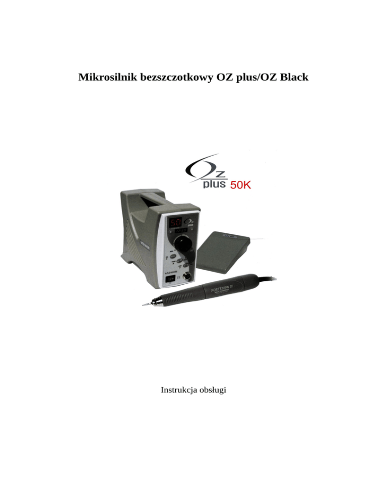 Mikrosilnik bezszczotkowy OZ plus/OZ Black Instrukcja obsługi Rysunek: 1. Zasilacz 2. Wyświetlacz obrotów 3. Zegarek 4. Regulator obrotów 5. Włącznik mikrosilnika 6. Przełącznik sterowanie ręczne/nożne 7. Przełącznik obroty lewe/prawe 8. Gniazdo mikrosilnika 9. Wyłącznik główny 10. Gniazdo rozrusznika nożnego 11. Skrzynka bezpiecznika 12. Gniazdo przewodu zasilającego 13. Przewód zasilający 14. Rozrusznik nożny 15. Podstawka pod mikrosilnik 16. Mikrosilnik 17. Klucze serwisowe Podłączenie i obsługa. 1. Upewnij się, że zasilacz jest wyłączony A – podłącz przewód zasilający do zasilacza B – podłącz rozrusznik nożny C – podłącz mikrosilnik do zasilacza 2. Ustaw regulator prędkości w pozycji „0” 3. Upewnij się, że zacisk wiertła jest zamknięty 4. Trzymając mikrosilnik w ręce włącz zasilacz. Po włączeniu zasilacza zapali się zielona lampka w przełączniku, zabrzmi sygnał dźwiękowy i wyświetlą się aktualne obroty 5. Czas ustawia się za pomocą przycisków po obu stronach zegarka. Lewy przycisk – godziny, prawy – minuty 6. Wybór sterowania ręcznego lub nożnego następuje poprzez naciśnięcie przycisku z rysunkiem dłoni i stopy. 7. Wybór obrotów lewych lub prawych następuje poprzez naciśnięcie przycisku wyboru obrotów 8. Uruchomienie i zatrzymanie mikrosilnika następuje poprzez naciśnięcie przycisku MOTOR 9. Maksymalne, fabrycznie ustawione obroty mają wartość 40 000. Aby zwiększyć obroty do 50 000 należy ustawić pokrętło w pozycji „0”, wcisnąć jednocześnie przycisk sterowanie ręczne/nożne i MOTOR. Potrójny sygnał dźwiękowy sygnalizuje, że operacja przebiegła prawidłowo. Aby wrócić do max. 40 000 czynność powtórzyć 10. W przypadku przeciążenia silnika wyświetlacz obrotów pokaże „00”, po 5 sek. zasilacz przerwie pracę i pokaże Error 1 z sygnałem dźwiękowym. Aby usunąć błąd wciśnij przycisk MOTOR lub zwolnij rozrusznik nożny. UWAGA! 1. Nie używaj urządzenia w wilgotnym miejscu 2. Warunki transportu i przechowywania: - temp. 10 - 40 °C - wilgotność 30 – 75 % - ciśnienie atm. 700 – 1060 hPa 3. Nie podłączaj mikrosilnika i rozrusznika do innych zasilaczy 4. Wiertła i frezy: - wymiary: 2,35 mm (ISO7785-2 TYPE2) - wiertło powinno być wsunięte do uchwytu na min. 10 mm - wiertło może wystawać z uchwytu na max. 35 mm - nie należy używać wierteł zardzewiałych i wygiętych – możliwość uszkodzenia łożysk - pracuj na bezpiecznych obrotach i przestrzegaj zaleceń producenta wierteł 5. Sprawdzaj wibracje wierteł przy niskich obrotach 6. 7. 8. 9. Reguluj obroty powoli i płynnie Bezpiecznik zasilacza – 220/230V – 2A Wyłączaj zasilanie przed wymianą wiertła Staraj się nie upuszczać mikrosilnika – jeśli się to zdarzy sprawdź czy wiertło nie jest wygięte oraz czy urządzenie się nie grzeje 10. Nie włączaj mikrosilnika kiedy uchwyt wierteł jest otwarty 11. Upewnij się, że zasilacz jest wyłączony zanim włożysz wtyczkę do gniazdka 12. Mikrosilnik posiada zabezpieczenie przed przeciążeniem 13. Nie otwieraj uchwytu wierteł w trakcie pracy 14. Nie odkładaj mikrosilnika zanim się całkowicie nie zatrzyma 15. Używaj akcesoriów dedykowanych do danego urządzenia 16. Pracuj w ubraniu ochronnym, masce i okularach ochronnych. Używaj wyciągów protetycznych 17. Ze względów bezpieczeństwa utrzymuj swoje miejsce pracy w czystości Wykres maksymalnych bezpiecznych obrotów w zależności od wielkości wiertla (wartości orientacyjne, mogą się różnić w zależności od typu wiertła i materiału, z którego zostało wyprodukowane). Wymiana uchwytu wierteł Klucze Wprowadź klucz 1 w szczelinę uchwytu - aby dopasować należy kręcić wiertłem Trzymając za klucz otwórz uchwyt Odkręć uchwyt drugim kluczem Wyjmij uchwyt, wymień na nowy i dokręć w odwrotnej kolejności UWAGI 1. Utrzymuj miejsce pracy wolne od pyłu i brudu 2. Czyść mikrosilnik ściereczką z alkoholem izopropylowym unikając dostania się wilgoci do wnętrza. Nie używaj oleju, wody ani smaru Dane techniczne Mikrosilnik Maksymalne obroty/min. Waga Moment obrotowy Moc Długość całkowita Forte100α-III 50000 254g 7,8 N.cm 230 W 171 mm Gwarancja Mikrosilniki OZ objęte są 12-miesięcznym okresem gwarancji. Gwarancja nie dotyczy: - szczotek - łożysk - przewodów - obudowy oraz wad wynikających z winy użytkownika (upadek, smarowanie itp.)