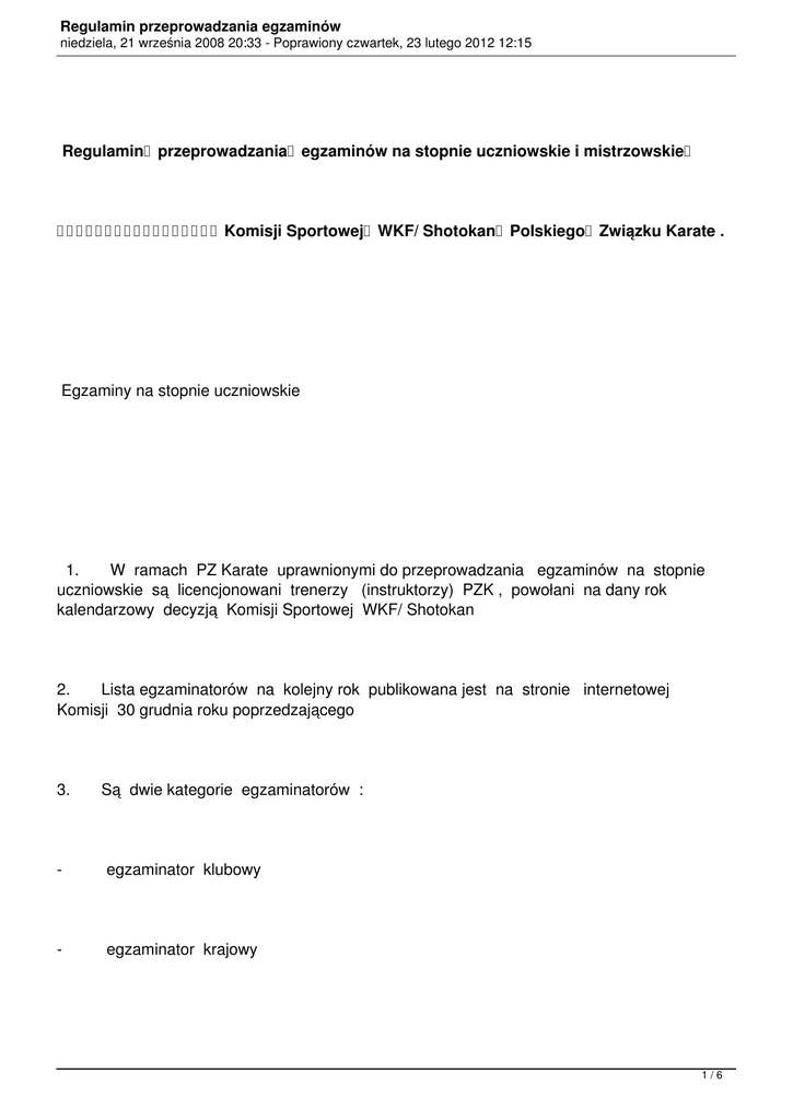 Regulamin przeprowadzania egzaminów niedziela, 21 września 2008 20:33 - Poprawiony czwartek, 23 lutego 2012 12:15 Regulamin przeprowadzania egzaminów na stopnie uczniowskie i mistrzowskie Komisji Sportowej WKF/ Shotokan Polskiego Związku Karate . Egzaminy na stopnie uczniowskie 1. W ramach PZ Karate uprawnionymi do przeprowadzania egzaminów na stopnie uczniowskie są licencjonowani trenerzy (instruktorzy) PZK , powołani na dany rok kalendarzowy decyzją Komisji Sportowej WKF/ Shotokan 2. Lista egzaminatorów na kolejny rok publikowana jest na stronie internetowej Komisji 30 grudnia roku poprzedzającego 3. Są dwie kategorie egzaminatorów : - egzaminator klubowy - egzaminator krajowy 1/6 Regulamin przeprowadzania egzaminów niedziela, 21 września 2008 20:33 - Poprawiony czwartek, 23 lutego 2012 12:15 4. Warunki uzyskania uprawnień i ich zakres : - przeprowadzenie w roku poprzedzającym uzyskanie uprawnień , od 1 do 3 egzaminów, z łącznie przeegzaminowanymi - min. 50 osobami - w skali roku. - prawidłowe wypełnienie protokołu egzaminacyjnego i przesłanie e-mailem w terminie 1 tygodnia do Biura Komisji Sportowej WKF/ Shotokan - po zwrotnym otrzymaniu e-mailem z Komisji rachunku pro – forma › sprawdzenie zgodności oraz dokonanie przelewu w terminie 1 tygodnia . Po jego wykonaniu , listownie przesyłane są dyplomy i publikowany stopień danej osoby na stronie Komisji Spełnienie powyższych warunków skutkuje automatycznym wpisaniem na listę egzaminatorów na dany rok kalendarzowy , niespełnienie powoduje wykreślenie. 5. Zakres uprawnień : - egzaminator klubowy - stopnie od 9 do 4 kyu - nadają trenerzy (instruktorzy) z ukończonym 23 rokiem życia, posiadający min. stopień I-II Dan PZK - egzaminator krajowy - stopnie od 3 do 1 kyu – nadają trenerzy (instruktorzy) z ukończonym 27 rokiem życia , posiadający stopień min. III - IV Dan PZK 6. Warunki i procedura przeprowadzania egzaminu - zadbać by egzamin odbywał się odpowiednich warunkach, szczególnie dot. bezpieczeństwa 2/6 Regulamin przeprowadzania egzaminów niedziela, 21 września 2008 20:33 - Poprawiony czwartek, 23 lutego 2012 12:15 - sprawdzić posiadany stopień PZK egzaminowanego oraz zachowania limitu czasowego warunkującego przystąpienia do egzaminu – min. 4 m-ce od poprzedniego - przeprowadzić egzamin, zgodnie z wymogami szkoleniowymi na każdy stopień określonymi w przepisach szczegółowych Egzaminator może podjąć decyzje o awansie egzaminowanego o 2 stopnie szkoleniowe -musi jednak wtedy zostać zachowany podwójny limit czasowy ( 8 m-cy) oraz wpłacona podwójna opłata egzaminacyjna - weryfikacja stopni uzyskanych poza PZK jest możliwa, gdy egzaminowany spełnia posiada umiejętności techniczne i cechy motoryczne , w zakresie stopni 9- 4 kyu oraz przedstawi dyplom organizacji spoza PZK - opłata weryfikacyjna wynosi 50 zł za każdy stopień - po egzaminie przesłać protokół do Komisji wg wskazań z pkt 4. 7. Opłaty egzaminacyjne – na rzecz PZK : - 15 zł - stopnie 9.1› 4.3. kyu - poniżej 14 lat - 30 zł - stopnie 9 › 1 kyu - powyżej 14 lat 8. Rzeczywistą wys. opłaty egzaminacyjnej - ustala egzaminator – uwzględniając : - koszty ponoszone na rzecz PZK, tytułem opłaty egzaminacyjnej 3/6 Regulamin przeprowadzania egzaminów niedziela, 21 września 2008 20:33 - Poprawiony czwartek, 23 lutego 2012 12:15 - koszty organizacyjne : wynagrodzenie , wynajem obiektu , ew. dojazd, czas trwania egzaminu, uwarunkowania środowiskowe (miasto, wieś ), etc. 9. Regulamin wchodzi w życie z dniem 20 września 2008 r. Egzaminy na stopnie Dan 1. Stopnie mistrzowskie I – V Dan nadają osoby, które ukończyły 40 rok życia, posiadające licencję trenera PZK i stopień mistrzowski min. 5 Dan , powołane każdorazowo do Komisji Egzaminacyjnej PZK, przez Komisję Sportową WKF/ Shotokan 2. Egzamin odbywa się na zakończenie corocznych centralnych szkoleń trenerskich, organizowanych przez Komisję Sportową WKF/ Shotokan 4/6 Regulamin przeprowadzania egzaminów niedziela, 21 września 2008 20:33 - Poprawiony czwartek, 23 lutego 2012 12:15 3. Warunki przystąpienia do egzaminu : - posiadanie stopnia PZK - zachowanie niezbędnego limitu czasowego miedzy egzaminami : 1 kyu › 1 dan - 1 rok 1 dan › 2 dan – 2 lata 2 dan › 3 dan – 3 lata 3 dan › 4 dan - 4 lata 4 dan › 5 dan - 5 lat - ukończone 18 lat (egzamin na 1 dan) - zgoda macierzystego klubu - uiszczenie stosownej opłaty - 300 zł - dwa zdjęcia dowodowe 4. Komisja Egzaminacyjna przeprowadza egzamin zgodnie z wymogami szkoleniowymi na każdy stopień , określonymi w przepisach szczegółowych 4. Możliwe jest przystąpienie do egzaminu na stopień mistrzowski osób, które uzyskały stopień mistrzowski poza PZK, po spełnieniu następujących warunków : 5/6 Regulamin przeprowadzania egzaminów niedziela, 21 września 2008 20:33 - Poprawiony czwartek, 23 lutego 2012 12:15 - zainteresowany przesyła do Biura Komisji ksero stopnia uzyskanego poza PZK wraz z krótkim opisem warunków w jakich go uzyskał , celem sprawdzenia jego wiarygodności - po pozytywnym zaopiniowaniu przez Komisję, dokonuje opłaty weryfikacyjnej w wys. 500 zł - za każdy stopień - przed egzaminem (wpłaty - przelewem, na konto PZK – konieczny dokument do okazania przy egzaminie- lub gotówką) - podczas egzaminu przedstawia oryginał dyplomu. 5. Członkowie Komisji Egzaminacyjnej pobierają wynagrodzenie na zasadach ustalonych przez Komisję Sportową WKF/ Shotokan 6. Komisja Sportową WKF/ Shotokan wnioskuje do władz WKF o nadanie wyższych stopni mistrzowskich V- IX Dan 7. Regulamin wchodzi w życie z dniem 20 września 2008 r. 6/6