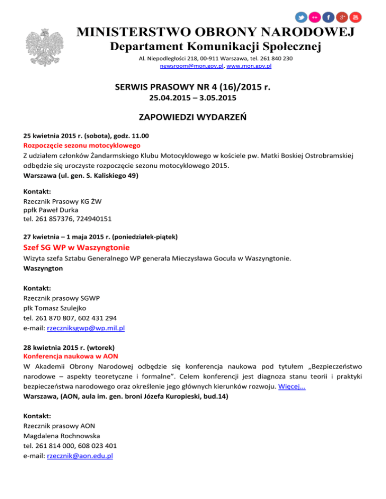 MINISTERSTWO OBRONY NARODOWEJ Departament Komunikacji Społecznej Al. Niepodległości 218, 00-911 Warszawa, tel. 261 840 230 [email protected], www.mon.gov.pl SERWIS PRASOWY NR 4 (16)/2015 r. 25.04.2015 – 3.05.2015 ZAPOWIEDZI WYDARZEŃ 25 kwietnia 2015 r. (sobota), godz. 11.00 Rozpoczęcie sezonu motocyklowego Z udziałem członków Żandarmskiego Klubu Motocyklowego w kościele pw. Matki Boskiej Ostrobramskiej odbędzie się uroczyste rozpoczęcie sezonu motocyklowego 2015. Warszawa (ul. gen. S. Kaliskiego 49) Kontakt: Rzecznik Prasowy KG ŻW ppłk Paweł Durka tel. 261 857376, 724940151 27 kwietnia – 1 maja 2015 r. (poniedziałek-piątek) Szef SG WP w Waszyngtonie Wizyta szefa Sztabu Generalnego WP generała Mieczysława Gocuła w Waszyngtonie. Waszyngton Kontakt: Rzecznik prasowy SGWP płk Tomasz Szulejko tel. 261 870 807, 602 431 294 e-mail: [email protected] 28 kwietnia 2015 r. (wtorek) Konferencja naukowa w AON W Akademii Obrony Narodowej odbędzie się konferencja naukowa pod tytułem „Bezpieczeństwo narodowe – aspekty teoretyczne i formalne”. Celem konferencji jest diagnoza stanu teorii i praktyki bezpieczeństwa narodowego oraz określenie jego głównych kierunków rozwoju. Więcej... Warszawa, (AON, aula im. gen. broni Józefa Kuropieski, bud.14) Kontakt: Rzecznik prasowy AON Magdalena Rochnowska tel. 261 814 000, 608 023 401 e-mail: [email protected] 29 kwietnia 2015 r. (środa), godz. 13.30 Wieniec przed GNŻ Przed Grobem Nieznanego Żołnierza wieniec złoży przewodniczący Rady Najwyższej Ukrainy Wołodymyr Hrojsman. Warszawa, (pl. Marszałka Józefa Piłsudskiego) Kontakt: Rzecznik prasowy DGW ppłk Joanna Klejszmit-Bodziuch tel. 261 879102; 721810749 e-mail: [email protected] 1 maja 2015 r. (piątek), godz. 19.00 11. rocznica przystąpienia Polski do UE Z okazji 11. rocznicy wstąpienia Polski do Unii Europejskiej odbędzie się uroczysty koncert Orkiestry Reprezentacyjnej Wojska Polskiego oraz Orkiestry Reprezentacyjnej Sił Powietrznych z Poznania. Warszawa (dziedziniec Pałacu Prezydenckiego) Kontakt: Rzecznik prasowy DGW ppłk Joanna Klejszmit-Bodziuch tel.: 261 879 102, 721 810 749 e-mail: [email protected] 2 maja 2015 r. (sobota), godz. 9.30 Dzień Flagi Z udziałem władz państwowych oraz przedstawicieli wojska odbędzie się uroczyste podniesienie flagi RP na wieży zegarowej Zamku Królewskiego. Szczegóły w oddzielnym komunikacie. Warszawa, plac Zamkowy Kontakt: Rzecznik prasowy DGW ppłk Joanna Klejszmit-Bodziuch tel.: 261 879 102, 721 810 749 e-mail: [email protected] 2 maja 2015 r. (sobota), godz. 10.00 Promocja oficerów rezerwy Na placu Marszałka Józefa Piłsudskiego odbędzie się uroczysta promocja na pierwszy stopień oficerski żołnierzy rezerwy. 1.05. godz. 13.00 - próba generalna do uroczystej promocji. Warszawa Kontakt: Rzecznik prasowy DGW ppłk Joanna Klejszmit-Bodziuch tel.: 261 879 603, 721 810 749 e-mail: [email protected] 2 maja 2015 r. (sobota), godz. 14.30 III Bieg Flagi Pod honorowym patronatem ministra obrony narodowej, odbędzie się impreza biegowa z okazji Dnia Flagi. Więcej… Cytadela Warszawska Kontakt: Departament Komunikacji Społecznej tel. 261 840 230 e-mail: [email protected] 2 maja 2015 r. (sobota), godz. 15.45 Obchody 100. rocznicy bitwy pod Gorlicami Podsekretarz stanu w MON Maciej Jankowski weźmie udział w obchodach 100. rocznicy bitwy pod Gorlicami. Więcej… Łużna Kontakt: Departament Komunikacji Społecznej tel. 261 840 230 e-mail: [email protected] 3 maja 2015 r. (niedziela), godz. 12.00 Uroczystości z okazji Święta Narodowego 3 Maja Msza święta za Ojczyznę, wręczenia przez Prezydenta Rzeczypospolitej Polskiej odznaczeń państwowych, koncert Orkiestry Wojskowej z Siedlec to wydarzenia towarzyszące obchodom centralnym, które rozpoczną się o godz. 12.00 na placu Zamkowym. Szczegółowy plan uroczystości i uroczystości towarzyszących w odrębnym komunikacie. 30.04. godz. 12.00 - próba generalna do uroczystości z okazji Święta Narodowego 3 Maja. Warszawa, Plac Zamkowy Kontakt: Rzecznik prasowy DGW ppłk Joanna Klejszmit-Bodziuch tel.: 261 879 102, 721 810 749 e-mail: [email protected] 3 maja 2015 r. (niedziela), godz. 12.30 Wiceminister Maciej Jankowski w Białymstoku Podsekretarz stanu w MON Maciej Jankowski weźmie udział w wojewódzkich obchodach Narodowego Święta 3 Maja. Białystok Kontakt: Departament Komunikacji Społecznej tel. 261 840 230 e-mail: [email protected] KRONIKA 23 kwietnia 2015 r. (czwartek) Spotkanie ministrów obrony V4 Nasze praktyczne działania wzmacniają nasze zdolności obronne. Uznaliśmy dziś, że te działania muszą wpisywać się w to, co robi Sojusz Północnoatlantycki i Unia Europejska - powiedział wicepremier Tomasz Siemoniak po spotkaniu ministrów obrony państw Grupy Wyszehradzkiej (V4), które odbyło się na Słowacji. Więcej … 23 kwietnia 2015 r. (czwartek) Komunikat MON W nawiązaniu do upublicznionych przez Prezesa WSK „PZL-Świdnik” S.A. w mediach społecznościowych informacji dotyczących spełnienia przez jego firmę warunków dostaw śmigłowców dla Ministerstwa Obrony Narodowej stwierdzam, że są one nieprawdziwe. Więcej … 21 kwietnia 2015 r. (wtorek) Konferencja: Wyzwania polityki antykorupcyjnej w resorcie ON We wtorek podsekretarz stanu Beata Oczkowicz uczestniczyła w konferencji pt.: „Wyzwania polityki antykorupcyjnej w resorcie obrony narodowej”. Organizatorami konferencji było Biuro ds. Procedur Antykorupcyjnych MON, Fundacja im. Stefana Batorego oraz Transparency International UK. Więcej … 21 kwietnia 2015 r. (wtorek) EC-725 CARACAL w kolejnej fazie postępowania W postępowaniu na śmigłowce wielozadaniowe dla Sił Zbrojnych RP, po przeanalizowaniu złożonych ofert, ministerstwo obrony narodowej zakwalifikowało do sprawdzeń weryfikacyjnych śmigłowiec oferowany przez konsorcjum „Program EC-725 CARACAL-Polska”. Więcej … 21 kwietnia 2015 r. (wtorek) Program Wisła w trybie umowy międzyrz