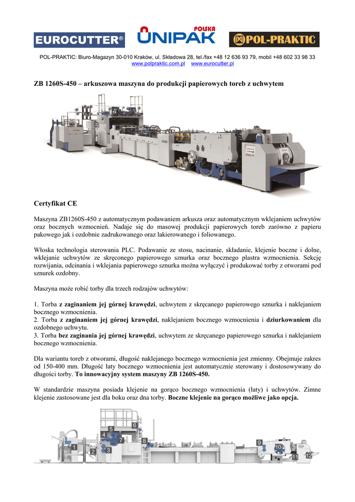 POL-PRAKTIC: Biuro-Magazyn 30-010 Kraków, ul. Składowa 28, tel./fax +48 12 636 93 79, mobil +48 602 33 98 33 www.polpraktic.com.pl www.eurocutter.pl ZB 1260S-450 – arkuszowa maszyna do produkcji papierowych toreb z uchwytem Certyfikat CE Maszyna ZB1260S-450 z automatycznym podawaniem arkusza oraz automatycznym wklejaniem uchwytów oraz bocznych wzmocnień. Nadaje się do masowej produkcji papierowych toreb zarówno z papieru pakowego jak i ozdobnie zadrukowanego oraz lakierowanego i foliowanego. Włoska technologia sterowania PLC. Podawanie ze stosu, nacinanie, składanie, klejenie boczne i dolne, wklejanie uchwytów ze skręconego papierowego sznurka oraz bocznego plastra wzmocnienia. Sekcję rozwijania, odcinania i wklejania papierowego sznurka można wyłączyć i produkować torby z otworami pod sznurek ozdobny. Maszyna może robić torby dla trzech rodzajów uchwytów: 1. Torba z zaginaniem jej górnej krawędzi, uchwytem z skręcanego papierowego sznurka i naklejaniem bocznego wzmocnienia. 2. Torba z zaginaniem jej górnej krawędzi, naklejaniem bocznego wzmocnienia i dziurkowaniem dla ozdobnego uchwytu. 3. Torba bez zaginania jej górnej krawędzi, uchwytem ze skręcanego papierowego sznurka i naklejaniem bocznego wzmocnienia. Dla wariantu toreb z otworami, długość naklejanego bocznego wzmocnienia jest zmienny. Obejmuje zakres od 150-400 mm. Długość łaty bocznego wzmocnienia jest automatycznie sterowany i dostosowywany do długości torby. To innowacyjny system maszyny ZB 1260S-450. W standardzie maszyna posiada klejenie na gorąco bocznego wzmocnienia (łaty) i uchwytów. Zimne klejenie zastosowane jest dla boku oraz dna torby. Boczne klejenie na gorąco możliwe jako opcja. Specyfikacja: 1. 2. 3. 4. 5. 6. 7. 8. 9. 10. 11. 12. Podajnik - podawanie non-stop Przednie i boczne prowadnice systemu pozycjonowania System nacinania System wklejania bocznego wzmocnienia torby System wklejania uchwytu Sekcja odcięcia dla łaty bocznego wzmocnienia System automatycznego zaginania górnej krawędzi torby System automatycznego klejenia bocznej krawędzi torby System zgniatania i dziurkowania torby System dociskania zagięć dna torby System zwalniania stosu toreb Automatyczny system zliczania Specyfikacja dla trzech rodzajów toreb: Max. rozmiar arkusza Min. rozmiar arkusza Gramatura papieru Wysokość torby Szerokość torby (front) Szerokość dna torby Głębokość górnego zagięcia Długość wzmocnienia (łaty) Szerokość wzmocnienia (łaty) Gramatura papieru uchwytu Średnica rolki uchwytu (łaty) Szerokość rolki (łaty) Średnica (grubość) uchwytu Wysokość uchwytu Prędkość (wydajność) mm mm g/m2 mm mm mm mm mm mm g/m2 mm mm mm mm sztuk/min 1200 x 600 620 x 350 100 - 190 250 - 490 220 - 450 80 - 170 40 - 60 188,5 35 - 55 100 - 300 1000 70 - 110 4-6 170 - 195 40 - 70 1200 x 600 620 x 350 100 - 190 250 - 490 200 - 450 80 - 170 40 - 60 150 - 400 35 - 55 100 - 300 1000 70 - 110 --40 - 70 Moc maszyny: 25 kW Całkowita waga: 22000 kg Wymiary maszyny (długość, szerokość, wysokość) w mm: 16100 x 5300 x 3100 W opcji (dla klejenia bocznego) maszyna może być wyposażona w system klejenia na gorąco. 1200 x 600 620 x 350 100 - 230 260 - 540 220 - 450 80 - 170 Bez zagięcia 188,5 35 - 55 100 - 300 1000 70 - 110 4-6 170 - 195 40 - 70