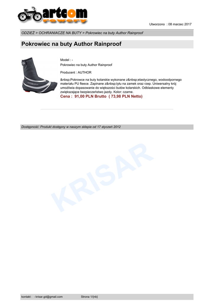 Utworzono : 08 marzec 2017 ODZIEŻ > OCHRANIACZE NA BUTY > Pokrowiec na buty Author Rainproof Pokrowiec na buty Author Rainproof Model : Pokrowiec na buty Author Rainproof Producent : AUTHOR Pokrowce na buty kolarskie wykonane z elastycznego, wodoodpornego materiału PU fleece. Zapinane z tyłu na zamek oraz rzep. Uniwersalny krój umożliwia dopasowanie do większości butów kolarskich. Odblaskowe elementy zwiększające bezpieczeństwo jazdy. Kolor: czarne. Cena : 91,00 PLN Brutto ( 73,98 PLN Netto) Dostępność: Produkt dostępny w naszym sklepie od 17 styczeń 2012 R A K kontakt : - [email protected] S I R Strona 1/{nb}