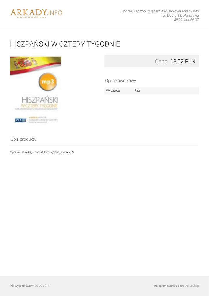 Dobra28 sp zoo. księgarnia wysyłkowa arkady.info ul. Dobra 28, Warszawa +48 22 444 86 97 HISZPAŃSKI W CZTERY TYGODNIE Cena: 13,52 PLN Opis słownikowy Wydawca Rea Opis produktu Oprawa miękka, Format 13x17,5cm, Stron 252 Plik wygenerowano: 08-03-2017 Powered by TCPDF (www.tcpdf.org) Oprogramowanie sklepu: AptusShop