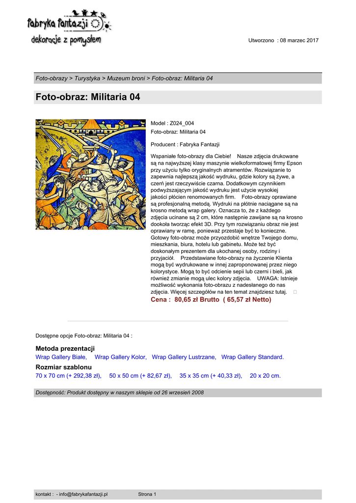 Utworzono : 08 marzec 2017 Foto-obrazy > Turystyka > Muzeum broni > Foto-obraz: Militaria 04 Foto-obraz: Militaria 04 Model : Z024_004 Foto-obraz: Militaria 04 Producent : Fabryka Fantazji Wspaniałe foto-obrazy dla Ciebie! Nasze zdjęcia drukowane są na najwyższej klasy maszynie wielkoformatowej firmy Epson przy użyciu tylko oryginalnych atramentów. Rozwiązanie to zapewnia najlepszą jakość wydruku, gdzie kolory są żywe, a czerń jest rzeczywiście czarna. Dodatkowym czynnikiem podwyższającym jakość wydruku jest użycie wysokiej jakości płócien renomowanych firm. Foto-obrazy oprawiane są profesjonalną metodą. Wydruki na płótnie naciągane są na krosno metodą wrap galery. Oznacza to, że z każdego zdjęcia ucinane są 2 cm, które następnie zawijane są na krosno dookoła tworząc efekt 3D. Przy tym rozwiązaniu obraz nie jest oprawiany w ramę, ponieważ przestaje być to konieczne. Gotowy foto-obraz może przyozdobić wnętrze Twojego domu, mieszkania, biura, hotelu lub gabinetu. Może też być doskonałym prezentem dla ukochanej osoby, rodziny i przyjaciół. Przedstawiane foto-obrazy na życzenie Klienta mogą być wydrukowane w innej zaproponowanej przez niego kolorystyce. Mogą to być odcienie sepii lub czerni i bieli, jak również zmianie mogą ulec kolory zdjęcia. UWAGA: Istnieje możliwość wykonania foto-obrazu z nadesłanego do nas zdjęcia. Więcej szczegółów na ten temat znajdziesz tutaj. � Cena : 80,65 zł Brutto ( 65,57 zł Netto) Dostępne opcje Foto-obraz: Militaria 04 : Metoda prezentacji Wrap Gallery Białe, Wrap Gallery Kolor, Wrap Gallery Lustrzane, Wrap Gallery Standard. Rozmiar szablonu 70 x 70 cm (+ 292,38 zł), 50 x 50 cm (+ 82,67 zł), 35 x 35 cm (+ 40,33 zł), Dostępność: Produkt dostępny w naszym sklepie od 26 wrzesień 2008 kontakt : - [email protected] Strona 1 20 x 20 cm.