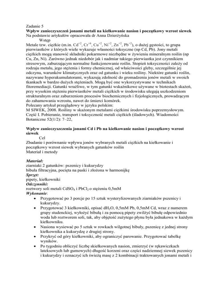 Zadanie 5 Wpływ zanieczyszczeń jonami metali na kiełkowanie