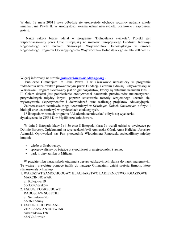 W dniu 18 maja 20011 roku odbędzie się uroczystość obchodu rocznicy nadania szkole imienia Jana Pawła II. W uroczystości wezmą udział nauczyciele, uczniowie i zaproszeni goście. Nasza szkoła bierze udział w programie "Dolnośląska e-szkoła". Projekt jest współfinansowany przez Unię Europejską ze środków Europejskiego Funduszu Rozwoju Regionalnego oraz budżetu Samorządu Województwa Dolnośląskiego w ramach Regionalnego Programu Operacyjnego dla Województwa Dolnośląskiego na lata 2007-2013. Więcej informacji na stronie gimcieszkowsmok.edupage.org . Publiczne Gimnazjum im. Jana Pawła II w Cieszkowie uczestniczy w programie "Akademia uczniowska" prowadzonym przez Fundację Centrum Edukacji Obywatelskiej w Warszawie. Program skierowany jest do gimnazjalistów, którzy są aktualnie uczniami klas I i II. Celem działań jest podniesienie efektywności nauczania przedmiotów matematycznoprzyrodniczych między innymi poprzez stosowanie metody wzajemnego uczenia się, wykonywanie eksperymentów i doświadczeń oraz realizację projektów edukacyjnych. Zainteresowani uczniowie mogą uczestniczyć w Szkolnych Kołach Naukowych z fizyki i biologii oraz uczestniczyć w wycieczkach edukacyjnych. 18 listopada w ramach programu "Akademia uczniowska" odbyła się wycieczka dydaktyczna do CEE i K w Myśliborzu koło Jawora. W dniu 3 listopada klasy 3a i 3c oraz 8 listopada klasa 3b wzięli udział w wycieczce po Dolinie Baryczy. Opiekunami na wycieczkach byli Agnieszka Góral, Anna Halicka i Jarosław Adamski. Oprowadzał nas Pan przewodnik Włodzimierz Ranoszek, zwiedziliśmy między innymi:    wieżę w Grabownicy, spacerowaliśmy po ścieżce przyrodniczej w miejscowości Stawno, park i ruiny zamku w Miliczu. W październiku nasza szkoła otrzymała zestaw edukacyjnych plansz do nauki matematyki. Te ważne i przydatne pomoce trafiły do naszego Gimnazjum dzięki sześciu firmom, które sfinansowały ich zakup: 1. WARSZTAT SAMOCHODOWY BLACHARSTWO LAKIERNICTWO POJAZDOWE MARCIN NOWAK ul. Kolejowa 19 56-330 Cieszków 2. USŁUGI POGRZEBOWE RADOSŁAW SOLECKI ul. Sieniutowa 9B 63-760 Zduny 3. USŁUGI BUDOWLANE ZDZISŁAW ANTKOWIAK Szkarładowo 128 63-930 Jutrosin 4. USŁUGI OGÓLNOBUDOWLANE JANUSZ ELIAS ul. Kościuszki 25 56-330 Cieszków 5. BIURO RACHUNKOWE DOMINIK TRZECIAK ul. Żmigrodzka 26 56-300 Milicz 6. ROBOTY ZIEMNE ZDZISŁAW KRUCHOWSKI ul. Kolejowa 23/3 56-330 Cieszków W dniu 26 października odbył sie dzień kociaka zorganizowany przez klasę 3c i 3b. Impreza miała na celu przyjęcie w poczet społeczności uczniowskiej uczniów klas pierwszych. Do rywalizacji stanęły dwie klasy pierwsze, wykonując przeróżne konkurencje np.:     łowienie kiełbasek w kisielu, dmuchanie mąki, śpiewanie wierszy, i inne. 7 października odbyło sie ognisko integracyjne klas pierwszych. W którym wzięły udział klasy pierwsze wychowawczynie Panie Małgorzata Szprync i Agnieszka Góral oraz Pani pedagog Anna Halicka. W dniach 4-5 października uczniowie klasy 1a, 2a, 2b wzięli udział w wycieczce edukacyjnej związanej z programem "Dolnośląska e-szkoła" do Śnieżnickiego Parku Krajobrazowego. Program wycieczki został opracowany przez biuro podróży i zatwierdzony przez DODN we Wrocławiu. Młodzieżą opiekowali się Agnieszka Góral i Mariusz Smółka. Zwiedziliśmy między innymi:            krzywą wieżę w Ząbkowicach Śląskich, bazylikę w Bardzie Śląskim, miniaturę mostu Karola z Pragi w Kłodzku, twierdzę w Kłodzku, kopalnię złota w Złotym Stoku, park zdrojowy w Lądku Zdroju, jaskinię niedźwiedzią, muzeum filumenistyczne w Bystrzycy Kłodzkiej, ogród bajek, Wodospad Wilczki, Śnieżnik. Nocleg zapewniła nam willa Ewa - Królikówka w Nowej Morawie.