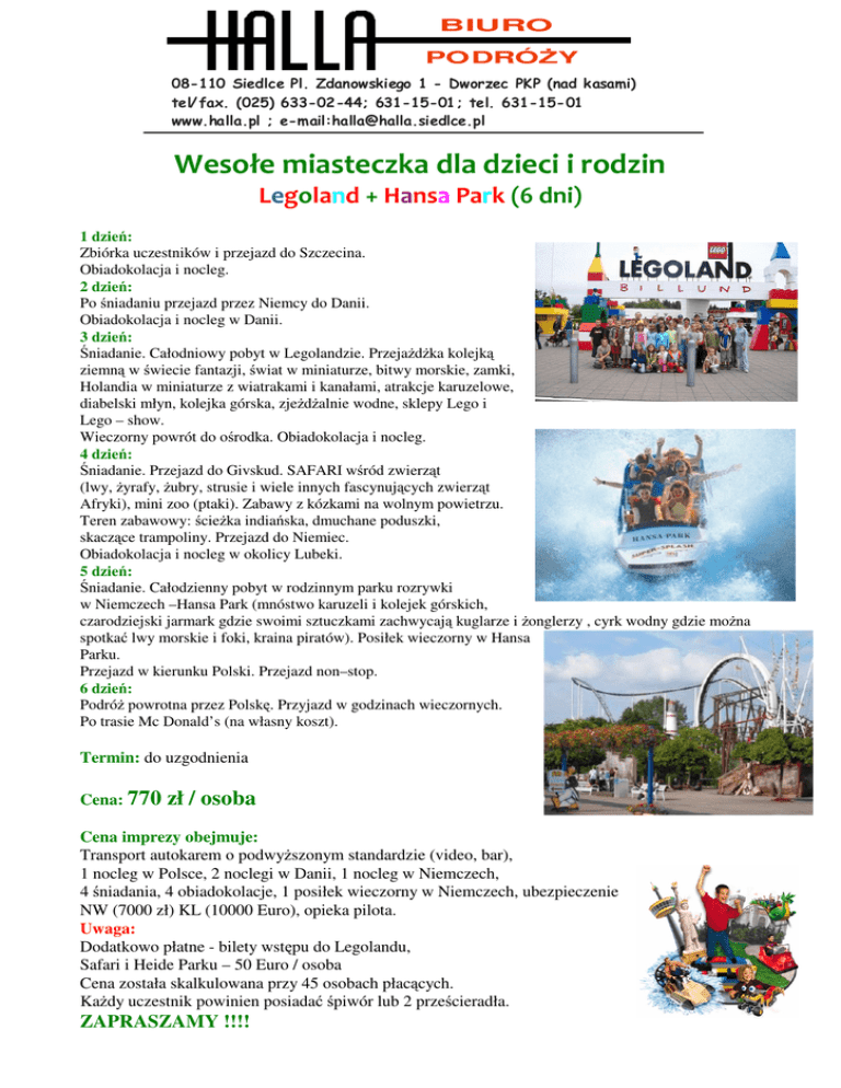 BIURO PODRÓŻY 08-110 Siedlce Pl. Zdanowskiego 1 - Dworzec PKP (nad kasami) tel/ fax. (025) 633-02-44; 631-15-01; tel. 631-15-01 www.halla.pl ; e-mail:[email protected] Wesołe miasteczka dla dzieci i rodzin Legoland + Hansa Park (6 dni) 1 dzień: Zbiórka uczestników i przejazd do Szczecina. Obiadokolacja i nocleg. 2 dzień: Po śniadaniu przejazd przez Niemcy do Danii. Obiadokolacja i nocleg w Danii. 3 dzień: Śniadanie. Całodniowy pobyt w Legolandzie. Przejażdżka kolejką ziemną w świecie fantazji, świat w miniaturze, bitwy morskie, zamki, Holandia w miniaturze z wiatrakami i kanałami, atrakcje karuzelowe, diabelski młyn, kolejka górska, zjeżdżalnie wodne, sklepy Lego i Lego – show. Wieczorny powrót do ośrodka. Obiadokolacja i nocleg. 4 dzień: Śniadanie. Przejazd do Givskud. SAFARI wśród zwierząt (lwy, żyrafy, żubry, strusie i wiele innych fascynujących zwierząt Afryki), mini zoo (ptaki). Zabawy z kózkami na wolnym powietrzu. Teren zabawowy: ścieżka indiańska, dmuchane poduszki, skaczące trampoliny. Przejazd do Niemiec. Obiadokolacja i nocleg w okolicy Lubeki. 5 dzień: Śniadanie. Całodzienny pobyt w rodzinnym parku rozrywki w Niemczech –Hansa Park (mnóstwo karuzeli i kolejek górskich, czarodziejski jarmark gdzie swoimi sztuczkami zachwycają kuglarze i żonglerzy , cyrk wodny gdzie można spotkać lwy morskie i foki, kraina piratów). Posiłek wieczorny w Hansa Parku. Przejazd w kierunku Polski. Przejazd non–stop. 6 dzień: Podróż powrotna przez Polskę. Przyjazd w godzinach wieczornych. Po trasie Mc Donald’s (na własny koszt). Termin: do uzgodnienia Cena: 770 zł / osoba Cena imprezy obejmuje: Transport autokarem o podwyższonym standardzie (video, bar), 1 nocleg w Polsce, 2 noclegi w Danii, 1 nocleg w Niemczech, 4 śniadania, 4 obiadokolacje, 1 posiłek wieczorny w Niemczech, ubezpieczenie NW (7000 zł) KL (10000 Euro), opieka pilota. Uwaga: Dodatkowo płatne - bilety wstępu do Legolandu, Safari i Heide Parku – 50 Euro / osoba Cena została skalkulowana przy 45 osobach płacących. Każdy uczestnik powinien posiadać śpiwór lub 2 prześcieradła. ZAPRASZAMY !!!!