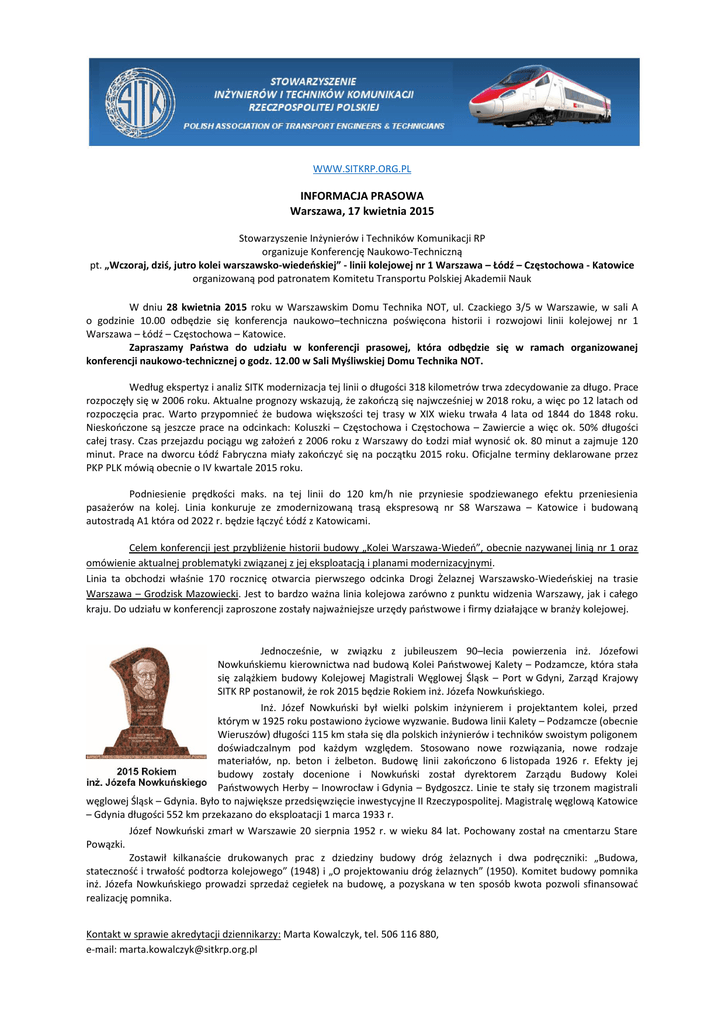 WWW.SITKRP.ORG.PL INFORMACJA PRASOWA Warszawa, 17 kwietnia 2015 Stowarzyszenie Inżynierów i Techników Komunikacji RP organizuje Konferencję Naukowo-Techniczną pt. „Wczoraj, dziś, jutro kolei warszawsko-wiedeńskiej” - linii kolejowej nr 1 Warszawa – Łódź – Częstochowa - Katowice organizowaną pod patronatem Komitetu Transportu Polskiej Akademii Nauk W dniu 28 kwietnia 2015 roku w Warszawskim Domu Technika NOT, ul. Czackiego 3/5 w Warszawie, w sali A o godzinie 10.00 odbędzie się konferencja naukowo–techniczna poświęcona historii i rozwojowi linii kolejowej nr 1 Warszawa – Łódź – Częstochowa – Katowice. Zapraszamy Państwa do udziału w konferencji prasowej, która odbędzie się w ramach organizowanej konferencji naukowo-technicznej o godz. 12.00 w Sali Myśliwskiej Domu Technika NOT. Według ekspertyz i analiz SITK modernizacja tej linii o długości 318 kilometrów trwa zdecydowanie za długo. Prace rozpoczęły się w 2006 roku. Aktualne prognozy wskazują, że zakończą się najwcześniej w 2018 roku, a więc po 12 latach od rozpoczęcia prac. Warto przypomnieć że budowa większości tej trasy w XIX wieku trwała 4 lata od 1844 do 1848 roku. Nieskończone są jeszcze prace na odcinkach: Koluszki – Częstochowa i Częstochowa – Zawiercie a więc ok. 50% długości całej trasy. Czas przejazdu pociągu wg założeń z 2006 roku z Warszawy do Łodzi miał wynosić ok. 80 minut a zajmuje 120 minut. Prace na dworcu Łódź Fabryczna miały zakończyć się na początku 2015 roku. Oficjalne terminy deklarowane przez PKP PLK mówią obecnie o IV kwartale 2015 roku. Podniesienie prędkości maks. na tej linii do 120 km/h nie przyniesie spodziewanego efektu przeniesienia pasażerów na kolej. Linia konkuruje ze zmodernizowaną trasą ekspresową nr S8 Warszawa – Katowice i budowaną autostradą A1 która od 2022 r. będzie łączyć Łódź z Katowicami. Celem konferencji jest przybliżenie historii budowy „Kolei Warszawa-Wiedeń”, obecnie nazywanej linią nr 1 oraz omówienie aktualnej problematyki związanej z jej eksploatacją i planami modernizacyjnymi. Linia ta obchodzi właśnie 170 rocznicę otwarcia pierwszego odcinka Drogi Żelaznej Warszawsko-Wiedeńskiej na trasie Warszawa – Grodzisk Mazowiecki. Jest to bardzo ważna linia kolejowa zarówno z punktu widzenia Warszawy, jak i całego kraju. Do udziału w konferencji zaproszone zostały najważniejsze urzędy państwowe i firmy działające w branży kolejowej. Jednocześnie, w związku z jubileuszem 90–lecia powierzenia inż. Józefowi Nowkuńskiemu kierownictwa nad budową Kolei Państwowej Kalety – Podzamcze, która stała się zalążkiem budowy Kolejowej Magistrali Węglowej Śląsk – Port w Gdyni, Zarząd Krajowy SITK RP postanowił, że rok 2015 będzie Rokiem inż. Józefa Nowkuńskiego. Inż. Józef Nowkuński był wielki polskim inżynierem i projektantem kolei, przed którym w 1925 roku postawiono życiowe wyzwanie. Budowa linii Kalety – Podzamcze (obecnie Wieruszów) długości 115 km stała się dla polskich inżynierów i techników swoistym poligonem doświadczalnym pod każdym względem. Stosowano nowe rozwiązania, nowe rodzaje materiałów, np. beton i żelbeton. Budowę linii zakończono 6 listopada 1926 r. Efekty jej budowy zostały docenione i Nowkuński został dyrektorem Zarządu Budowy Kolei Państwowych Herby – Inowrocław i Gdynia – Bydgoszcz. Linie te stały się trzonem magistrali węglowej Śląsk – Gdynia. Było to największe przedsięwzięcie inwestycyjne II Rzeczypospolitej. Magistralę węglową Katowice – Gdynia długości 552 km przekazano do eksploatacji 1 marca 1933 r. Józef Nowkuński zmarł w Warszawie 20 sierpnia 1952 r. w wieku 84 lat. Pochowany został na cmentarzu Stare Powązki. Zostawił kilkanaście drukowanych prac z dziedziny budowy dróg żelaznych i dwa podręczniki: „Budowa, stateczność i trwałość podtorza kolejowego” (1948) i „O projektowaniu dróg żelaznych” (1950). Komitet budowy pomnika inż. Józefa Nowkuńskiego prowadzi sprzedaż cegiełek na budowę, a pozyskana w ten sposób kwota pozwoli sfinansować realizację pomnika. Kontakt w sprawie akredytacji dziennikarzy: Marta Kowalczyk, tel. 506 116 880, e-mail: [email protected]