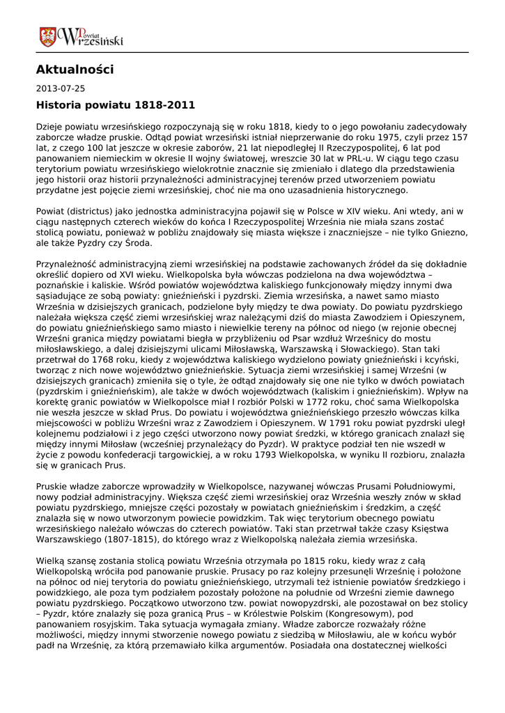 Aktualności 2013-07-25 Historia powiatu 1818-2011 Dzieje powiatu wrzesińskiego rozpoczynają się w roku 1818, kiedy to o jego powołaniu zadecydowały zaborcze władze pruskie. Odtąd powiat wrzesiński istniał nieprzerwanie do roku 1975, czyli przez 157 lat, z czego 100 lat jeszcze w okresie zaborów, 21 lat niepodległej II Rzeczypospolitej, 6 lat pod panowaniem niemieckim w okresie II wojny światowej, wreszcie 30 lat w PRL-u. W ciągu tego czasu terytorium powiatu wrzesińskiego wielokrotnie znacznie się zmieniało i dlatego dla przedstawienia jego historii oraz historii przynależności administracyjnej terenów przed utworzeniem powiatu przydatne jest pojęcie ziemi wrzesińskiej, choć nie ma ono uzasadnienia historycznego. Powiat (districtus) jako jednostka administracyjna pojawił się w Polsce w XIV wieku. Ani wtedy, ani w ciągu następnych czterech wieków do końca I Rzeczypospolitej Września nie miała szans zostać stolicą powiatu, ponieważ w pobliżu znajdowały się miasta większe i znaczniejsze – nie tylko Gniezno, ale także Pyzdry czy Środa. Przynależność administracyjną ziemi wrzesińskiej na podstawie zachowanych źródeł da się dokładnie określić dopiero od XVI wieku. Wielkopolska była wówczas podzielona na dwa województwa – poznańskie i kaliskie. Wśród powiatów województwa kaliskiego funkcjonowały między innymi dwa sąsiadujące ze sobą powiaty: gnieźnieński i pyzdrski. Ziemia wrzesińska, a nawet samo miasto Września w dzisiejszych granicach, podzielone były między te dwa powiaty. Do powiatu pyzdrskiego należała większa część ziemi wrzesińskiej wraz należącymi dziś do miasta Zawodziem i Opieszynem, do powiatu gnieźnieńskiego samo miasto i niewielkie tereny na północ od niego (w rejonie obecnej Wrześni granica między powiatami biegła w przybliżeniu od Psar wzdłuż Wrześnicy do mostu miłosławskiego, a dalej dzisiejszymi ulicami Miłosławską, Warszawską i Słowackiego). Stan taki przetrwał do 1768 roku, kiedy z województwa kaliskiego wydzielono powiaty gnieźnieński i kcyński, tworząc z nich nowe województwo gnieźnieńskie. Sytuacja ziemi wrzesińskiej i samej Wrześni (w dzisiejszych granicach) zmieniła się o tyle, że odtąd znajdowały się one nie tylko w dwóch powiatach (pyzdrskim i gnieźnieńskim), ale także w dwóch województwach (kaliskim i gnieźnieńskim). Wpływ na korektę granic powiatów w Wielkopolsce miał I rozbiór Polski w 1772 roku, choć sama Wielkopolska nie weszła jeszcze w skład Prus. Do powiatu i województwa gnieźnieńskiego przeszło wówczas kilka miejscowości w pobliżu Wrześni wraz z Zawodziem i Opieszynem. W 1791 roku powiat pyzdrski uległ kolejnemu podziałowi i z jego części utworzono nowy powiat średzki, w którego granicach znalazł się między innymi Miłosław (wcześniej przynależący do Pyzdr). W praktyce podział ten nie wszedł w życie z powodu konfederacji targowickiej, a w roku 1793 Wielkopolska, w wyniku II rozbioru, znalazła się w granicach Prus. Pruskie władze zaborcze wprowadziły w Wielkopolsce, nazywanej wówczas Prusami Południowymi, nowy podział administracyjny. Większa część ziemi wrzesińskiej oraz Września weszły znów w skład powiatu pyzdrskiego, mniejsze części pozostały w powiatach gnieźnieńskim i średzkim, a część znalazła się w nowo utworzonym powiecie powidzkim. Tak więc terytorium obecnego powiatu wrzesińskiego należało wówczas do czterech powiatów. Taki stan przetrwał także czasy Księstwa Warszawskiego (1807-1815), do którego wraz z Wielkopolską należała ziemia wrzesińska. Wielką szansę zostania stolicą powiatu Września otrzymała po 1815 roku, kiedy wraz z całą Wielkopolską wróciła pod panowanie pruskie. Prusacy po raz kolejny przesunęli Wrześnię i położone na północ od niej terytoria do powiatu gnieźnieńskiego, utrzymali też istnienie powiatów średzkiego i powidzkiego, ale poza tym podziałem pozostały położone na południe od Wrześni ziemie dawnego powiatu pyzdrskiego. Początkowo utworzono tzw. powiat nowopyzdrski, ale pozostawał on bez stolicy – Pyzdr, które znalazły się poza granicą Prus – w Królestwie Polskim (Kongresowym), pod panowaniem rosyjskim. Taka sytuacja wymagała zmiany. Władze zaborcze rozważały różne możliwości, między innymi stworzenie nowego powiatu z siedzibą w Miłosławiu, ale w końcu wybór padł na Wrześnię, za którą przemawiało kilka argumentów. Posiadała ona dostatecznej wielkości budynki, które można by przeznaczyć na urzędy (nie miał ich Miłosław), była czwartym co do wielkości miastem (2.341 mieszkańców) w rejencji bydgoskiej (jednej z dwóch, obok poznańskiej, na które Prusacy podzielili Wielkopolskę) i wreszcie miała korzystniejsze, bo w pewnym oddaleniu od granicy państwa, położenie. 12 marca 1818 roku, decyzją pruskich władz zaborczych, utworzono nowy powiat, a ostatecznego wyboru jego stolicy we Wrześni dokonano 10 sierpnia 1819 roku. W granicach tego „pierwszego” powiatu wrzesińskiego znalazły się trzy miasta – oprócz Wrześni także Miłosław i Żerków oraz 143 wsie. Jego obszar liczył około 730 km. Pierwszym landratem wrzesińskim (niemieckim odpowiednikiem starosty) został Polak – Adam Moszczeński, później jednak urząd ten obejmowali tylko Niemcy. Poważnym zmianom granice powiatu wrzesińskiego uległy w roku 1886, ponieważ w Wielkopolsce utworzono wówczas kilka nowych powiatów. Po odłączeniu ziem położonych na południe od Warty, czyli rejonu Żerkowa, obszar powiatu wrzesińskiego zmniejszył się do 562 km. Pozostały w nim dwa miasta (Września i Miłosław) oraz 84 gminy wiejskie i 74 obszary dworskie. Kształt terytorialny nadany wówczas powiatowi wrzesińskiemu przetrwał ponad 30 lat, aż do czasu odrodzenia się niepodległego państwa polskiego. W całym omawianym okresie (1818-1918) powiat wrzesiński był powiatem przygranicznym