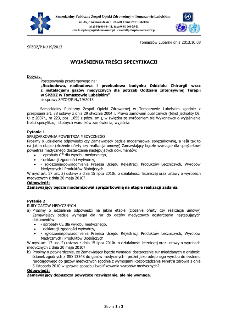 Samodzielny Publiczny Zespół Opieki Zdrowotnej w Tomaszowie Lubelskim ul. Aleje Grunwaldzkie 1, 22-600 Tomaszów Lubelski tel: (0 84) 664-44-11, fax: (0 84) 664-25-21, email: [email protected], www: http://szpital-tomaszow.pl Tomaszów Lubelski dnia 2013.10.08 SPZOZ/P.N./19/2013 WYJAŚNIENIA TREŚCI SPECYFIKACJI Dotyczy: Postępowania przetargowego na: „Rozbudowa, nadbudowa i przebudowa budynku Oddziału Chirurgii wraz z instalacjami gazów medycznych dla potrzeb Oddziału Intensywnej Terapii w SPZOZ w Tomaszowie Lubelskim” nr sprawy SPZOZ/P.N./19/2013 Samodzielny Publiczny Zespół Opieki Zdrowotnej w Tomaszowie Lubelskim zgodnie z przepisami art. 38 ustawy z dnia 29 stycznia 2004 r. Prawo zamówień publicznych (tekst jednolity Dz. U. z 2007r., nr 223, poz. 1655 z późn. zm.), w związku ze zwróceniem się Wykonawcy o wyjaśnienie treści specyfikacji istotnych warunków zamówienia, wyjaśnia: Pytanie 1 SPRĘŻARKOWNIA POWIETRZA MEDYCZNEGO Prosimy o udzielenie odpowiedzi czy Zamawiający będzie modernizował sprężarkownię, a jeśli tak to na jakim etapie (złożenie oferty czy realizacja umowy) Zamawiający będzie wymagał dla sprężarkowi powietrza medycznego dostarczenia następujących dokumentów: - aprobaty CE dla wyrobu medycznego, - deklaracji zgodności wytwórcy, - zgłoszenia/powiadomienia Prezesa Urzędu Rejestracji Produktów Leczniczych, Wyrobów Medycznych i Produktów Biobójczych W myśl art. 17 ust. 2) ustawy z dnia 15 lipca 2010r. o działalności leczniczej oraz ustawy o wyrobach medycznych z dnia 20 maja 2010? Odpowiedź: Zamawiający będzie modernizował sprężarkownię na etapie realizacji zadania. Pytanie 2 RURY GAZÓW MEDYCZNYCH a) Prosimy o udzielenie odpowiedzi na jakim etapie (złożenie oferty czy realizacja umowy) Zamawiający będzie wymagał dla rur do gazów medycznych dostarczenia następujących dokumentów: - aprobaty CE dla wyrobu medycznego, - deklaracji zgodności wytwórcy, - zgłoszenia/powiadomienia Prezesa Urzędu Rejestracji Produktów Leczniczych, Wyrobów Medycznych i Produktów Biobójczych W myśl art. 17 ust. 2) ustawy z dnia 15 lipca 2010r. o działalności leczniczej oraz ustawy o wyrobach medycznych z dnia 20 maja 2010? b) Prosimy o potwierdzenie, że Zamawiający będzie wymagał dostarczenie rur miedzianych o grubości ścianek zgodnych z ISO 13348 do gazów medycznych i próżni jako odrębnego wyrobu do systemu rurociągowego do gazów medycznych zgodnie z wymogami Rozporządzenia Ministra zdrowia z dnia 5 listopada 2010 w sprawie sposobu kwalifikowania wyrobów medycznych? Odpowiedź: Zamawiający dopuszcza powyższe rozwiązanie, ale nie wymaga. Strona 1 z 3 Samodzielny Publiczny Zespół Opieki Zdrowotnej w Tomaszowie Lubelskim ul. Aleje Grunwaldzkie 1, 22-600 Tomaszów Lubelski tel: (0 84) 664-44-11, fax: (0 84) 664-25-21, email: [email protected], www: http://szpital-tomaszow.pl Pytanie 3 Czy Zamawiający będzie wymagał pokrycia, popychaczy w panelach nadłóżkowych, kolumnach i innych urządzeniach wyposażonych w punkty poboru (do swojego podstawowego działania wymaga się częstego ich dotykania przez personel) przez miedź drobnoustrojową, która jest dzisiaj standardem zabijającym 99,9% bakterii na swojej powierzchni? Czy Zamawiający będzie wymagał dostarczenia potwierdzenia w postaci certyfikatu dla miedzi Cu+ oraz dopuszczenia EPA dla stałego zwalczania bakterii? Odpowiedź: Zamawiający dopuszcza powyższe rozwiązanie, ale nie wymaga. Pytanie 4 Instalacje gazów medycznych. W związku z spisem SIWZ, który mówi że: „Zakres zamówienia obejmuje również uzyskanie certyfikatu instalacji gazów medycznych uprawniającej oznakowanie ich znakiem CE dla wyrobów medycznych”, prosimy o potwierdzenie że do oferty należy załączyć certyfikat upoważniający wykonawcę do wykonywania instalacji gazów medycznych. Odpowiedź: Zamawiający nie wymaga załączenia do oferty certyfikatu upoważniającego Wykonawcę do wykonywania instalacji gazów medycznych. Pytanie 5 Instalacje gazów medycznych. Zgodnie z projektem instalacji gazów medycznych (rys. 1 Rzut piwnic oraz opis punkt 5.1 Stacja sprężonego powietrza) napisano „ w układzie instalacji sprężonego powietrza medycznego projektuje się stanowisko awaryjne baterii butlowej BP 1/5 wyposażonej w reduktor RBPS 2/100 i zawór kulowy odcinający ..’’ W przedmiarze robót brak jest ww. elementów. Prosimy o uzupełnienie. Odpowiedź: W przedmiarze robót „Przedmiar 1355 SPZOZ Tomaszów Przebudowa Gazy medyczne.pdf” w dziale 2 „Stacja sprężonego powietrza” po pozycji nr 10 wprowadza się pozycję nr 10a o następującym brzmieniu: Lp. 10a d.2 Podstawa Analiza własna Nr spec. techn. S.04 Opis i wyliczenia Analiza własna - dostawa i montaż stanowiska awaryjnej baterii butlowej BP 1/5 wyposażonej w reduktor RBPS 2/100 i zawór kulowy odcinający j.m. Poszcz. Razem kpl. 1,000 1,000 Pytanie 6 Instalacja wentylacji mechanicznej. Przedmiar robót „ Przedmiar 1354 Tomaszów Przebudowa Wentylacjiap.pdf” nie uwzględnia płaszcza z blachy na izolacji rurociągów wody lodowej na dachu, montażu kompensatorów przy agregacie chłodniczym oraz armatury przy chłodnicy centrali wentylacyjnej. Prosimy o dodanie pozycji do przedmiaru robót: - Płaszcz ochronny z blachy stalowej ocynkowanej - 4,92 m2 - Kompensator drgań Dn 40 mm- 2szt. - Zawory kulowe Dn 40 mm – 2 szt. - Zawory kulowe Dn 15 mm – 2 szt. - Zawory spustowe Dn 15 mm – 2 szt. - odpowietrzniki automatyczne Dn 15 mm – 2 szt. - Manometry – 2 szt. - Termometry 2 szt. Strona 2 z 3 Samodzielny Publiczny Zespół Opieki Zdrowotnej w Tomaszowie Lubelskim ul. Aleje Grunwaldzkie 1, 22-600 Tomaszów Lubelski tel: (0 84) 664-44-11, fax: (0 84) 664-25-21, email: [email protected], www: http://szpital-tomaszow.pl Odpowiedź: W przedmiarze robót „Przedmiar 1354 SPZOZ Tomaszów Przebudowa Wentylacja .pdf” w dziale 1.2 „Agregat wody lodowej” po pozycji nr 1.2.15 wp