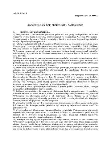 AF.26.51.2016 Załącznik nr 1 do SIWZ SZCZEGÓŁOWY OPIS PRZEDMIOTU ZAMÓWIENIA 1. PRZEDMIOT ZAMÓWIENIA 1) Przygotowanie i dostarczenie gotowych posiłków dla grupy maksymalnie 21 dzieci w różnym wieku, także niemowląt, przebywających w Regionalnej Placówce OpiekuńczoTerapeutycznej w Ignatkach Osiedle, stanowiącej Dział w strukturze Regionalnego Ośrodka Polityki Społecznej w Białymstoku. 2) Należy uwzględnić fakt, iż liczba dzieci w Placówce może się zmieniać, w związku z czym Zamawiający zastrzega sobie prawo do zamawiania nawet niewielkiej ilości posiłków. O każdej zmianie w zapotrzebowaniu Placówki na wyżywienie Zamawiający poinformuje Wykonawcę najpóźniej na dzień przed planowaną zmianą ilości zamawianych pakietów całodziennego wyżywienia. W Placówce maksymalnie przebywać będzie 21 dzieci w wieku od 0 do 18 lat. 3) Usługa cateringowa w zakresie przygotowania posiłków obejmuje przygotowanie diety ogólnej oraz diet specjalnych, w tym diety uzupełniającej dla niemowląt, jeśli zaistnieje taka potrzeba, zgodnie z zaleceniami intendenta/dietetyka Placówki i wcześniejszymi ustaleniami z upoważnionym przedstawicielem Wykonawcy. 4) Przez dietę specjalną rozumie się modyfikacje głównego jadłospisu zależnie od potrzeb dziecka, np. wykluczenie produktów alergizujących dla uczulonego dziecka lub dieta bezglutenowa dla dziecka z celiakią. 5) Placówka nie jest placówką oświatową, w związku z tym nie jest wymagane przestrzeganie Rozporządzenia Ministra Zdrowia z dnia 26 sierpnia 2015 r. w sprawie grup środków spożywczych przeznaczonych do sprzedaży dzieciom i młodzieży w jednostkach systemu oświaty oraz wymagań, jakie muszą spełniać środki spożywcze stosowane w ramach żywienia zbiorowego dzieci i młodzieży w tych jednostkach. 6) Jadłospis w diecie ogólnej obejmować będzie 3 główne posiłki (śniadanie, obiad, kolację) i 2 dodatkowe (II śniadanie, podwieczorek). 7) Jadłospis uzupełniający dla niemowląt obejmować będzie przygotowanie 1-3 posiłków dziennie, zależnie od wieku dziecka. Posiłki te złożone będą z prostych składników, jednakże Wykonawca ma obowiązek zadbać o ich najwyższą jakość. Znaczy to, iż produkty przeznaczone do żywienia niemowląt powinny pochodzić z zaufanych źródeł, nie mogą być zanieczyszczone pestycydami i innymi toksynami. 8) Wszystkie posiłki powinny być wyporcjowane i zapakowane w odpowiednie opakowania jednorazowe. Do każdego posiłku powinien być dołączony odpowiedni zestaw sztućców jednorazowych. 9) W przypadku, gdy Zamawiający zamawiał będzie różne diety Wykonawca ma obowiązek odpowiednio oznaczyć opakowania z posiłkami. Różnice w zamawianych posiłkach dla różnych dzieci dotyczyć mogą kaloryczności, ale także braku lub dodatku niektórych produktów spożywczych, zależnie od potrzeb dziecka. 10) Jadłospis ustalany będzie, w porozumieniu z Wykonawcą, na okres 14 dni i dostarczany Wykonawcy najpóźniej na 3 dni przed okresem jego obowiązywania. Przed rozpoczęciem okresu obowiązywania danego jadłospisu Wykonawca ma prawo wnioskować o ewentualne zmiany w posiłkach, natomiast w czasie obowiązywania danego jadłospisu Wykonawca nie ma prawa do dokonywania w nim jakichkolwiek zmian bez wcześniejszego skontaktowania się z osobą upoważnioną przez Zamawiającego do kontaktu z Wykonawcą. 11) Wykonawca ma obowiązek zapewnić świeżość użytych produktów i najwyższą jakość oraz estetykę posiłków, a także transport wyporcjowanych posiłków w odpowiednich, jednorazowych opakowaniach przeznaczonych do kontaktu z żywnością. Transport posiłków powinien odbywać się z zachowaniem zasad higieny i odpowiedniej do rodzaju posiłku temperatury w celu utrzymania wysokiej jakości posiłków. Posiłki nie mogą być przygotowywane z półproduktów. 12) Usługa cateringowa w zakresie dostarczenia posiłków obejmuje dostarczanie ich własnym transportem 2 razy dziennie (pierwszy transport: śniadanie + II śniadanie, drugi transport: obiad, podwieczorek i kolacja) każdego dnia w tygodniu (od poniedziałku do niedzieli) w godzinach ustalonych z Zamawiającym (pierwszy transport około godziny 6.45-7.00, drugi transport około godziny 12.45-13.00) oraz dołączenie do każdego posiłku zestawu niezbędnych sztućców jednorazowych. 13) W przypadku, gdy Wykonawca nie jest w stanie dostarczać posiłków 2 razy dziennie dopuszcza się ich dostarczanie raz dziennie po wcześniejszym ustaleniu tego faktu z Zamawiającym. 14) Usługa obejmuje również dostarczanie posiłków we wszystkie święta i dni wolne od pracy. 15) Wykonawca jest zobowiązany do zachowania norm bezpieczeństwa zgodnych ze standardami Dobrej Praktyki Higienicznej (GHP), Dobrej Praktyki Produkcyjnej (GMP) oraz systemu Analizy Zagrożeń i Krytycznych Punktów Kontroli (HACCP). Wykonawca jest zobowiązany do przechowywania próbek posiłków do celów sanitarno-epidemiologicznych zgodnie z obowiązującymi w tym zakresie przepisami. 16) Do obowiązków Zamawiającego, realizowanych za pomocą personelu własnego, należeć będzie wydawanie posiłków, sprzątanie oraz ponoszenie kosztów środków czystości i higienicznych zużywanych do sprzątania po posiłku. Do obowiązków Wykonawcy należeć będzie zabieranie z Placówki odpadów pokonsumpcyjnych oraz dokonywanie comiesięcznych rozliczeń z Zamawiającym za dostarczone posiłki. 17) Rozliczenia finansowe Wykonawcy z Zamawiającym odbywać się będą na podstawie faktycznie dostarczonych posiłków i ceny brutto jednodniowego pakietu wyżywienia dla jednego dziecka. 18) Przez pakiet jednodniowego wyżywienia rozumie się porcje 5 posiłków (śniadanie, II śniadanie, obiad, podwieczorek, kolacja) przeznaczone dla jednego dziecka. Zamawiający zastrzega sobie prawo do pomniejszenia pakietu o dowolną ilość posiłków, tzn. może zamówić pakiet składający się np. tylko ze śniad