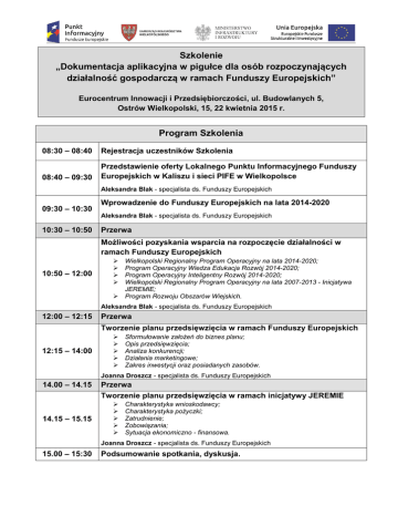 Szkolenie „Dokumentacja aplikacyjna w pigułce dla osób rozpoczynających działalność gospodarczą w ramach Funduszy Europejskich” Eurocentrum Innowacji i Przedsiębiorczości, ul. Budowlanych 5, Ostrów Wielkopolski, 15, 22 kwietnia 2015 r. Program Szkolenia 08:30 – 08:40 Rejestracja uczestników Szkolenia 08:40 – 09:30 Przedstawienie oferty Lokalnego Punktu Informacyjnego Funduszy Europejskich w Kaliszu i sieci PIFE w Wielkopolsce Aleksandra Blak - specjalista ds. Funduszy Europejskich 09:30 – 10:30 Wprowadzenie do Funduszy Europejskich na lata 2014-2020 Aleksandra Blak - specjalista ds. Funduszy Europejskich 10:30 – 10:50 Przerwa Możliwości pozyskania wsparcia na rozpoczęcie działalności w ramach Funduszy Europejskich 10:50 – 12:00 Wielkopolski Regionalny Program Operacyjny na lata 2014-2020; Program Operacyjny Wiedza Edukacja Rozwój 2014-2020; Program Operacyjny Inteligentny Rozwój 2014-2020; Wielkopolski Regionalny Program Operacyjny na lata 2007-2013 - Inicjatywa JEREMIE; Program Rozwoju Obszarów Wiejskich. Aleksandra Blak - specjalista ds. Funduszy Europejskich 12:00 – 12:15 Przerwa Tworzenie planu przedsięwzięcia w ramach Funduszy Europejskich 12:15 – 14:00 Sformułowanie założeń do biznes planu; Opis przedsięwzięcia; Analiza konkurencji; Działania marketingowe; Zakres inwestycji oraz posiadanych zasobów. Joanna Droszcz - specjalista ds. Funduszy Europejskich 14.00 – 14.15 14.15 – 15.15 Przerwa Tworzenie planu przedsięwzięcia w ramach inicjatywy JEREMIE Charakterystyka wnioskodawcy; Charakterystyka pożyczki; Zatrudnienie; Zobowiązania; Sytuacja ekonomiczno - finansowa. Joanna Droszcz - specjalista ds. Funduszy Europejskich 15.00 – 15:30 Podsumowanie spotkania, dyskusja.