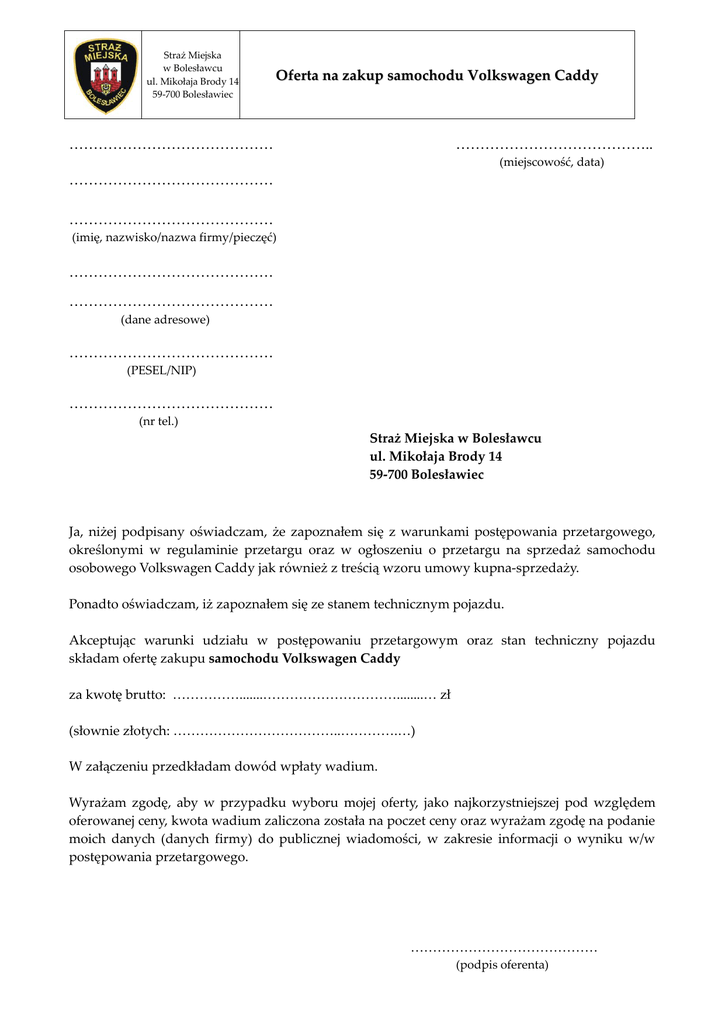 Straż Miejska w Bolesławcu ul. Mikołaja Brody 14 59-700 Bolesławiec Oferta na zakup samochodu Volkswagen Caddy …………………………………… ………………………………….. (miejscowość, data) …………………………………… …………………………………… (imię, nazwisko/nazwa firmy/pieczęć) …………………………………… …………………………………… (dane adresowe) …………………………………… (PESEL/NIP) …………………………………… (nr tel.) Straż Miejska w Bolesławcu ul. Mikołaja Brody 14 59-700 Bolesławiec Ja, niżej podpisany oświadczam, że zapoznałem się z warunkami postępowania przetargowego, określonymi w regulaminie przetargu oraz w ogłoszeniu o przetargu na sprzedaż samochodu osobowego Volkswagen Caddy jak również z treścią wzoru umowy kupna-sprzedaży. Ponadto oświadczam, iż zapoznałem się ze stanem technicznym pojazdu. Akceptując warunki udziału w postępowaniu przetargowym oraz stan techniczny pojazdu składam ofertę zakupu samochodu Volkswagen Caddy za kwotę brutto: …………….......…………………………........… zł (słownie złotych: ………………………………..………….…) W załączeniu przedkładam dowód wpłaty wadium. Wyrażam zgodę, aby w przypadku wyboru mojej oferty, jako najkorzystniejszej pod względem oferowanej ceny, kwota wadium zaliczona została na poczet ceny oraz wyrażam zgodę na podanie moich danych (danych firmy) do publicznej wiadomości, w zakresie informacji o wyniku w/w postępowania przetargowego. …………………………………… (podpis oferenta)