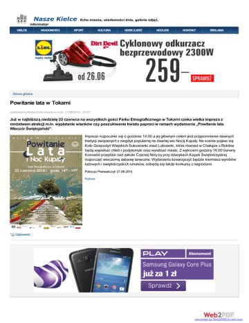 Nasze Kielce Echo miasta, wiadomości dnia, galeria zdjęć, informator KIELCE WIADOMOŚCI SPORT KULTURA GDZIE ZJEŚĆ NOCLEGI KONTAKT REKLAMA Strona główna Powitanie lata w Tokarni published by Kielce Echo miasta on sob., 21/06/2014 - 23:47 Już w najbliższą niedzielę 22 czerwca na wszystkich gości Parku Etnograficznego w Tokarni czeka wielka impreza z mnóstwem atrakcji m.in. wyplatanie wianków czy poszukiwanie kwiatu paproci w ramach wydarzenia „Powitanie lata. Wieczór Świętojański". Impreza rozpocznie się o godzinie 14.00 a jej głównym celem jest przypomnienie dawnych tradycji związanych z niegdyś popularną na dawnej wsi Nocą Kupały. Na scenie pojawi się Koło Gospodyń Wiejskich Sukowianki znad Lubrzanki, które również w Chałupie z Rokitna będą wypiekać chleb i podpłomyki oraz wyrabiać masło. Z wybiciem godziny 16.00 barwny Korowód przejdzie nad zakole Czarnej Nidy by przy dźwiękach Kapeli Świętokrzyskiej rozpocząć wieczorną zabawę taneczna. Wydarzeniu towarzyszyć będzie kiermasz wyrobów ludowych i świętokrzyskich smaków, odbędą się także konkursy z nagrodami. Patrycja Piwowarczyk 21.06.2014 Kultura Odpowiedz converted by Web2PDFConvert.com Redakcja serwisu nie ponosi odpowiedzialności za treść opublikowanych komentarzy. Osoby zamieszczające wypowiedzi naruszające prawo lub prawem chronione dobra osób trzecich mogą z tego tytułu ponieść odpowiedzialność cywilną lub karną. Ponadto redakcja zastrzega sobie prawo do usuwania komentarzy wulgarnych itp. --------------------------------------------------------------------------------------------------------------------------------------------- Przeczytaj najnowsze artykuły Pomalowali kolejny przystanek - zdjęcia Koroniarze jadą na zgrupowanie Powitanie lata w Tokarni Rozpoczął się wyścig o fotel prezydenta Kielc Zobacz najnowsze filmy Na skróty czyli spis treści: ARTYKUŁY TEMATYCZNE: AKTUALNOŚCI, KULTURA, SPORT, WYDARZENIE, AKCJA, RECENZJA, RELACJA, WARTO ZWIEDZIĆ, GDZIE ZJEŚĆ, PORADNIK, KONKURS, W ramach naszej witryny stosujemy pliki cookies. Korzystanie z witryny bez zmiany ustawień dotyczących OK cookies oznacza, że będą one zamieszczane Państwa urządzeniu końcowym. Możecie Państwo STRONA GŁÓWNA KONTAKT REKLAMA DOŁĄCZ DOwNAS AUTOBUSY RESTAURACJE HOTELE KLUBY PIZZERIE KAWIARNIE GALERIA ZDJĘĆ REPERTUAR KINOWY dokonać w każdym czasie zmiany ustawień dotyczących cookies. Polityka Cookies Copyright © Nasze Kielce www.naszekielce.com Wszelkie prawa zastrzeżone 2011-2014. POLITYKA PRYWATNOŚCI converted by Web2PDFConvert.com