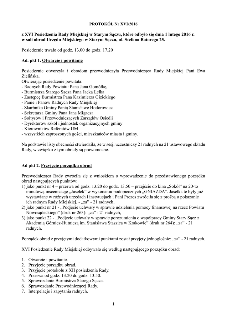 PROTOKÓŁ Nr XVI/2016 z XVI Posiedzenia Rady Miejskiej w Starym Sączu, które odbyło się dnia 1 lutego 2016 r. w sali obrad Urzędu Miejskiego w Starym Sączu, ul. Stefana Batorego 25. Posiedzenie trwało od godz. 13.00 do godz. 17.20 Ad. pkt 1. Otwarcie i powitanie Posiedzenie otworzyła i obradom przewodniczyła Przewodnicząca Rady Miejskiej Pani Ewa Zielińska. Otwierając posiedzenie powitała: - Radnych Rady Powiatu: Pana Jana Gomółkę, - Burmistrza Starego Sącza Pana Jacka Lelka - Zastępcę Burmistrza Pana Kazimierza Gizickiego - Panie i Panów Radnych Rady Miejskiej - Skarbnika Gminy Panią Stanisławę Hodorowicz - Sekretarza Gminy Pana Jana Migacza - Sołtysów i Przewodniczących Zarządów Osiedli - Dyrektorów szkół i jednostek organizacyjnych gminy - Kierowników Referatów UM - wszystkich zaproszonych gości, mieszkańców miasta i gminy. Na podstawie listy obecności stwierdziła, że w sesji uczestniczy 21 radnych na 21 ustawowego składu Rady, w związku z tym obrady są prawomocne. Ad pkt 2. Przyjęcie porządku obrad Przewodnicząca Rady zwróciła się z wnioskiem o wprowadzenie do przedstawionego porządku obrad następujących punktów: 1) jako punkt nr 4 – przerwa od godz. 13.20 do godz. 13.50 – przejście do kina „Sokół” na 20-to minutową inscenizację „Jasełek” w wykonaniu podopiecznych „GNIAZDA”. Jasełka te były już wystawiane w różnych urzędach i instytucjach i Pani Prezes zwróciła się z prośbą o pokazanie ich radnym Rady Miejskiej. - „za” - 21 radnych, 2) jako punkt nr 21 - „Podjęcie uchwały w sprawie udzielenia pomocy finansowej na rzecz Powiatu Nowosądeckiego” (druk nr 263): „za” - 21 radnych, 3) jako punkt 22 - „Podjęcie uchwały w sprawie porozumienia o współpracy Gminy Stary Sącz z Akademią Górnicz-Hutniczą im. Stanisława Staszica w Krakowie” (druk nr 264): „za” - 21 radnych. Porządek obrad z przyjętymi dodatkowymi punktami został przyjęty jednogłośnie: „za” - 21 radnych. XVI Posiedzenie Rady Miejskiej odbywało się według następującego porządku obrad: 1. 2. 3. 4. 5. 6. 7. Otwarcie i powitanie. Przyjęcie porządku obrad. Przyjęcie protokołu z XII posiedzenia Rady. Przerwa od godz. 13.20 do godz. 13.50. Sprawozdanie Burmistrza Starego Sącza. Sprawozdanie Przewodniczącej Rady. Interpelacje i zapytania radnych. 1 8. Zapytania Sołtysów i Przewodniczących Zarządów Osiedli oraz odpowiedzi. 9. Podjęcie uchwały w sprawie zmian uchwały budżetowej Nr XIV/228/2015 Rady Miejskiej w Starym Sączu z dnia 22 grudnia 2015 r. w sprawie uchwalenia budżetu Gminy Stary Sącz na 2016 r. (druk nr 255). 10. Podjęcie uchwały w sprawie odpłatnego nabycia nieruchomości położonej w Starym Sączu (druk nr 251). 11. Podjęcie uchwały w sprawie określenia kryteriów oraz punktów branych pod uwagę w postępowaniu rekrutacyjnym do szkoły podstawowej i gimnazjum, prowadzonych przez Gminę Stary Sącz oraz określenia dokumentów niezbędnych do potwierdzenia tych kryteriów (druk nr 252). 12. Podjęcie uchwały w sprawie zmiany „Miejscowego planu zagospodarowania przestrzennego PRZYSIETNICA” przyjętego uchwałą Nr XXXVI/443/09 RM w Starym Sączu dnia 6 marca 2009 r. (druk nr 253). 13. Podjęcie uchwały w sprawie miany „Miejscowego planu zagospodarowania przestrzennego GOŁKOWICE GÓRNE 10” przyjętego uchwałą Nr LI/62/2002 RM w Starym Sączu dnia 6 września 2002 r. (druk nr 254). 14. Podjęcie uchwały w sprawie zawarcia przez Gminę Stary Sącz umowy partnerskiej z Wojewodą Małopolskim w sprawie realizacji projektu pn. „Rewaloryzacja wybranych cmentarzy z I wojny światowej położonych na terenie Gorlic, Limanowej oraz powiatów gorlickiego, limanowskiego i nowosądeckiego jako zespołu dziedzictwa o znaczeniu międzynarodowym” (druk nr 256). 15. Podjęcie uchwały w sprawie zmiany uchwały RM w Starym Sączu Nr X/160/2015 z dnia 31 sierpnia 2015 r. dotyczącej ustalenia wzorów deklaracji o wysokości opłaty za gospodarowanie odpadami komunalnymi składanych przez właścicieli nieruchomości położonych na terenie Gminy Stary Sącz (druk nr 257). 16. Podjęcie uchwały w sprawie zarządzenia przeprowadzenia wyboru Przewodniczącego Zarządu Osiedla „Zachód” (druk nr 258). 17. Podjęcie uchwały w sprawie zatwierdzenia planu pracy Komisji Rewizyjnej (druk nr 259). 18. Podjęcie uchwały w sprawie zatwierdzenia planów pracy Komisji Rady (druk nr 260). 19. Podjęcie uchwały w sprawie udzielenia pełnomocnictwa do prowadzenia spraw przed sądami administracyjnymi (druk nr 261). 20. Podjęcie uchwały w sprawie wydzierżawienia nieruchomości położonych w Starym Sączu (druk nr 262). 21. „Podjęcie uchwały w sprawie udzielenia pomocy finansowej na rzecz Powiatu Nowosądeckiego” (druk nr 263). 22. „Podjęcie uchwały w sprawie porozumienia o współpracy Gminy Stary Sącz z Akademią Górnicz-Hutniczą im. Stanisława Staszica w Krakowie” (druk nr 264) 23. Sprawozdanie z działalności Komisji Rewizyjnej za rok 2015. 24. Sprawozdania z działalności Komisji Rady za rok 2015. 25. Odpowiedzi na interpelacje i zapytania. 26. Wolne wnioski, zakończenie. Ad pkt 3. Przyjęcie protokołu z XII posiedzenia Rady Na wniosek radnej Janiny Bawełkiewicz i radnego Grzegorza Farona Protokół Nr XII/2015 z posiedzenia Rady Miejskiej w dniu 28 października 2015 r. został przyjęty jednogłośnie bez czytania: „za” - 21 radnych. Ad pkt 4. Przerwa od godz. 13.20 do godz. 13.50 Podczas przerwy radni w sali kina „Sokół” obejrzeli „Jasełka” w wykonaniu podopiecznych Stowarzyszenia „GNIAZDO” w Starym Sączu. 2 Ad pkt 5. Sprawozdanie Burmistrza Starego Sącza. Burmistrz Jacek Lelek złożył w wersji elektronicznej sprawozdanie z działalności za okres międzysesyjny. Poinformował w nim o: Koncercie Noworocznym w wykonaniu Miejskiej Orkiestry Stary Sącz, spotkaniu z przedsiębiorcami, które odbyło się 15 stycznia w Barcicach, posie