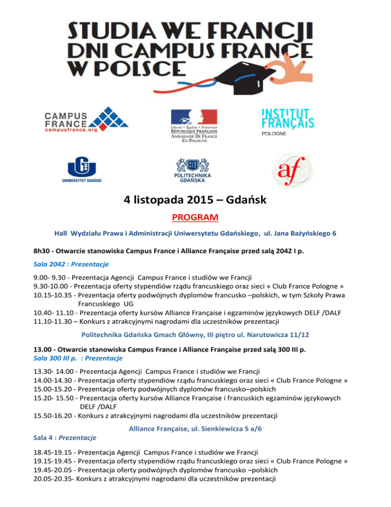 4 listopada 2015 – Gdaosk PROGRAM Hall Wydziału Prawa i Administracji Uniwersytetu Gdaoskiego, ul. Jana Bażyoskiego 6 8h30 - Otwarcie stanowiska Campus France i Alliance Française przed salą 2042 I p. Sala 2042 : Prezentacje 9.00- 9.30 - Prezentacja Agencji Campus France i studiów we Francji 9.30-10.00 - Prezentacja oferty stypendiów rządu francuskiego oraz sieci « Club France Pologne » 10.15-10.35 - Prezentacja oferty podwójnych dyplomów francusko –polskich, w tym Szkoły Prawa Francuskiego UG 10.40- 11.10 - Prezentacja oferty kursów Alliance Française i egzaminów językowych DELF /DALF 11.10-11.30 – Konkurs z atrakcyjnymi nagrodami dla uczestników prezentacji Politechnika Gdaoska Gmach Główny, III piętro ul. Narutowicza 11/12 13.00 - Otwarcie stanowiska Campus France i Alliance Française przed salą 300 III p. Sala 300 III p. : Prezentacje 13.30- 14.00 - Prezentacja Agencji Campus France i studiów we Francji 14.00-14.30 - Prezentacja oferty stypendiów rządu francuskiego oraz sieci « Club France Pologne » 15.00-15.20 - Prezentacja oferty podwójnych dyplomów francusko–polskich 15.20- 15.50 - Prezentacja oferty kursów Alliance Française i francuskich egzaminów językowych DELF /DALF 15.50-16.20 - Konkurs z atrakcyjnymi nagrodami dla uczestników prezentacji Alliance Française, ul. Sienkiewicza 5 a/6 Sala 4 : Prezentacje 18.45-19.15 - Prezentacja Agencji Campus France i studiów we Francji 19.15-19.45 - Prezentacja oferty stypendiów rządu francuskiego oraz sieci « Club France Pologne » 19.45-20.05 - Prezentacja oferty podwójnych dyplomów francusko –polskich 20.05-20.35- Konkurs z atrakcyjnymi nagrodami dla uczestników prezentacji