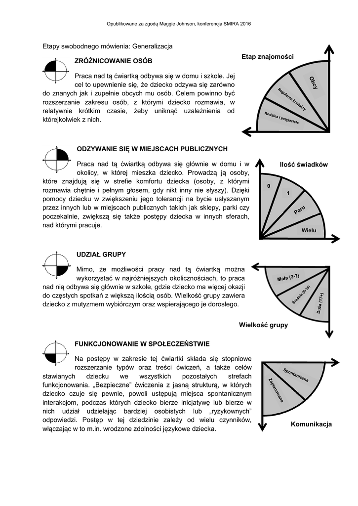 Opublikowane za zgodą Maggie Johnson, konferencja SMIRA 2016 Etapy swobodnego mówienia: Generalizacja ZRÓŻNICOWANIE OSÓB Etap znajomości Praca nad tą ćwiartką odbywa się w domu i szkole. Jej cel to upewnienie się, że dziecko odzywa się zarówno do znanych jak i zupełnie obcych mu osób. Celem powinno być rozszerzanie zakresu osób, z którymi dziecko rozmawia, w relatywnie krótkim czasie, żeby uniknąć uzależnienia od którejkolwiek z nich. ODZYWANIE SIĘ W MIEJSCACH PUBLICZNYCH Praca nad tą ćwiartką odbywa się głównie w domu i w okolicy, w której mieszka dziecko. Prowadzą ją osoby, które znajdują się w strefie komfortu dziecka (osoby, z którymi rozmawia chętnie i pełnym głosem, gdy nikt inny nie słyszy). Dzięki pomocy dziecku w zwiększeniu jego tolerancji na bycie usłyszanym przez innych lub w miejscach publicznych takich jak sklepy, parki czy poczekalnie, zwiększą się także postępy dziecka w innych sferach, nad którymi pracuje. Ilość świadków Wielu UDZIAŁ GRUPY Mimo, że możliwości pracy nad tą ćwiartką można wykorzystać w najróżniejszych okolicznościach, to praca nad nią odbywa się głównie w szkole, gdzie dziecko ma więcej okazji do częstych spotkań z większą ilością osób. Wielkość grupy zawiera dziecko z mutyzmem wybiórczym oraz wspierającego je dorosłego. Wielkość grupy FUNKCJONOWANIE W SPOŁECZEŃSTWIE Na postępy w zakresie tej ćwiartki składa się stopniowe rozszerzanie typów oraz treści ćwiczeń, a także celów stawianych dziecku we wszystkich pozostałych strefach funkcjonowania. „Bezpieczne” ćwiczenia z jasną strukturą, w których dziecko czuje się pewnie, powoli ustępują miejsca spontanicznym interakcjom, podczas których dziecko bierze inicjatywę lub bierze w nich udział udzielając bardziej osobistych lub „ryzykownych” odpowiedzi. Postęp w tej dziedzinie zależy od wielu czynników, włączając w to m.in. wrodzone zdolności językowe dziecka. Komunikacja Opublikowane za zgodą Maggie Johnson, konferencja SMIRA 2016 Interakcja sam na sam Praca nad spokojną, zrównoważoną rozmową z dowolną osobą 0 Nieobecne 1 Sparaliżowane strachem 2 Bierze udział bez komunikacji 3 Komunikuje się niewerbalnie i pisząc 4 Rozmawia przez inną osobę 5 Używa swojego głosu 6 Wypowiada pojedyncze słowa 7 Wyrażenia i zdania 8 Zrównoważona rozmowa GENERALIZACJA N.B. Praca nad wszystkimi celami odbywa się jednocześnie, ale do różnych celów przywiązuje się inną wagę, w zależności od etapu, na którym jest dziecko Zakres osób Osoby, z którymi dziecko rozmawia podczas interakcji sam na sam Rodzina i Regularne kontakty przyjaciele Znane osoby, z którymi dziecko jest w stałym Członkowie kontakcie np. nauczyciel, koledzy z klasy, najbliższej i dalszej sąsiedzi, przyjaciele rodziców, opiekunka, rodziny. instruktorzy zajęć pozalekcyjnych Najprawdopodobniej Obcy ta grupa składa się Osoby, których dziecko prawdopodobnie nigdy z osób, z którymi więcej nie zobaczy lub widzi tylko sporadycznie dziecko rozmawia np. ekspedienci, bibliotekarka, goście w szkole, swobodnie. okulista, dentysta zwiększanie wymagań Odzywanie się w miejscach publicznych W obecności/bliskości obserwatorów, rozmowa może odbywać się w różnych okolicznościach Nie ma szans Toleruje to, że Toleruje to, że Toleruje to, że na to, że ktoś usłyszy je jedna usłyszy je parę usłyszy je wiele inny je usłyszy osoba spoza osób spoza osób spoza strefy komfortu strefy komfortu strefy komfortu zwiększanie wymagań Uczestnictwo grupy Do grupy wlicza się dziecko i dorosły, który pomaga w przeprowadzeniu interakcji, jeśli to konieczne. 3-7 8-16 17+ np. praca w grupach, np. grupa na zajęciach np. klasa, uroczystości nocowanie u dodatkowych, zespół szkolne, koleżanek, rodzinny piłki nożnej przedstawienia posiłek zwiększanie wymagań Funkcjonowanie społeczne Praca mająca na celu umożliwienie dziecku prowadzenie swobodnych rozmów mających na celu spełnienie jego potrzeb ZAPLANOWANA SPONTANICZNA Z Zainicjowana Z Zainicjowana podpowiedziami przez dziecko podpowiedziami przez dziecko Z wyraźną Bez wyraźnej Z wyraźną Bez wyraźnej strukturą struktury strukturą struktury Na podstawie O zabarwieniu Na podstawie O zabarwieniu faktów emocjonalnym faktów emocjonalnym Opublikowane za zgodą Maggie Johnson, konferencja SMIRA 2016 CZYNNIKI RYZYKA WRAŻLIWE DZIECKO CZYNNIKI WYWOŁUJĄCE CZYNNIKI PODTRZYMUJĄCE NEGATYWNE SKOJARZENIA SĄ WZMACNIANE LUB PODTRZYMYWANE PRZEZ DZIECKO KOJARZY ODZYWANIE SIĘ Z POCZUCIEM ZAGROŻENIA (uwarunkowania genetyczne) Poczucie zagrożenia może być spowodowane przez Osobowość reaktywna sprzyjająca nadwrażliwości, nieufności i stanom lękowym u dziecka Nieznane otoczenie Presję związaną z odzywaniem się często występuje razem z Głośne, ruchliwe otoczenie Epizodami nieśmiałości, MW, lękliwości lub zaburzeń zdrowia psychicznego w rodzinie Rozłąka z rodzicami Krytykowanie/karanie Zredukowanie potrzeby odzywania się Lęk separacyjny Perfekcjonizm Lęk odczuwany przez rodziców Trudności z mówieniem lub z byciem zrozumianym Presja związana z wykonywaniem pewnych zadań Prześladowanie lub zastraszanie Zwiększona uwaga czy czułość skierowana do dziecka, kiedy jest ciche Przypisanie dziecku roli kogoś, kto się nigdy nie odzywa. czasem towarzyszą temu również: Problemy z przetwarzaniem sensorycznym i nadpobudliwością Unikanie może być także zamodelowane przez: Opóźniony rozwój motoryczny Rodzica, rodzeństwo bliźniacze lub starsze rodzeństwo Brak chęci do zmiany Oczekiwanie, że zmiana nadejdzie bez odpowiedniego zrozumienia i interwencji. Zaburzenia ze spektrum autyzmu LĘK WYUCZONY Doświadczenia dziecka mogą sprzyjać poczuciu niepewności, braku pewności siebie lub strachu przed zrobieniem błędu: Także inne, bardziej ogólne, okoliczności mogą zwiększać lęk u dziecka i sprawić, że będzie bardz