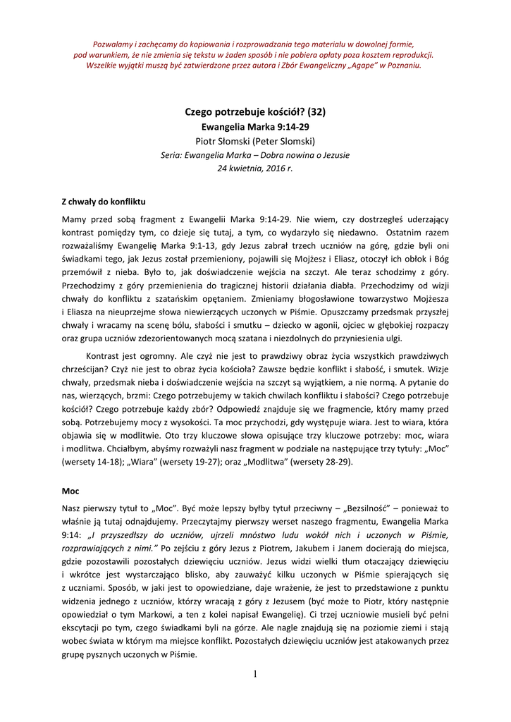 Pozwalamy i zachęcamy do kopiowania i rozprowadzania tego materiału w dowolnej formie, pod warunkiem, że nie zmienia się tekstu w żaden sposób i nie pobiera opłaty poza kosztem reprodukcji. Wszelkie wyjątki muszą być zatwierdzone przez autora i Zbór Ewangeliczny „Agape” w Poznaniu. Czego potrzebuje kościół? (32) Ewangelia Marka 9:14-29 Piotr Słomski (Peter Slomski) Seria: Ewangelia Marka – Dobra nowina o Jezusie 24 kwietnia, 2016 r. Z chwały do konfliktu Mamy przed sobą fragment z Ewangelii Marka 9:14-29. Nie wiem, czy dostrzegłeś uderzający kontrast pomiędzy tym, co dzieje się tutaj, a tym, co wydarzyło się niedawno. Ostatnim razem rozważaliśmy Ewangelię Marka 9:1-13, gdy Jezus zabrał trzech uczniów na górę, gdzie byli oni świadkami tego, jak Jezus został przemieniony, pojawili się Mojżesz i Eliasz, otoczył ich obłok i Bóg przemówił z nieba. Było to, jak doświadczenie wejścia na szczyt. Ale teraz schodzimy z góry. Przechodzimy z góry przemienienia do tragicznej historii działania diabła. Przechodzimy od wizji chwały do konfliktu z szatańskim opętaniem. Zmieniamy błogosławione towarzystwo Mojżesza i Eliasza na nieuprzejme słowa niewierzących uczonych w Piśmie. Opuszczamy przedsmak przyszłej chwały i wracamy na scenę bólu, słabości i smutku – dziecko w agonii, ojciec w głębokiej rozpaczy oraz grupa uczniów zdezorientowanych mocą szatana i niezdolnych do przyniesienia ulgi. Kontrast jest ogromny. Ale czyż nie jest to prawdziwy obraz życia wszystkich prawdziwych chrześcijan? Czyż nie jest to obraz życia kościoła? Zawsze będzie konflikt i słabość, i smutek. Wizje chwały, przedsmak nieba i doświadczenie wejścia na szczyt są wyjątkiem, a nie normą. A pytanie do nas, wierzących, brzmi: Czego potrzebujemy w takich chwilach konfliktu i słabości? Czego potrzebuje kościół? Czego potrzebuje każdy zbór? Odpowiedź znajduje się we fragmencie, który mamy przed sobą. Potrzebujemy mocy z wysokości. Ta moc przychodzi, gdy występuje wiara. Jest to wiara, która objawia się w modlitwie. Oto trzy kluczowe słowa opisujące trzy kluczowe potrzeby: moc, wiara i modlitwa. Chciałbym, abyśmy rozważyli nasz fragment w podziale na następujące trzy tytuły: „Moc” (wersety 14-18); „Wiara” (wersety 19-27); oraz „Modlitwa” (wersety 28-29). Moc Nasz pierwszy tytuł to „Moc”. Być może lepszy byłby tytuł przeciwny – „Bezsilność” – ponieważ to właśnie ją tutaj odnajdujemy. Przeczytajmy pierwszy werset naszego fragmentu, Ewangelia Marka 9:14: „I przyszedłszy do uczniów, ujrzeli mnóstwo ludu wokół nich i uczonych w Piśmie, rozprawiających z nimi.” Po zejściu z góry Jezus z Piotrem, Jakubem i Janem docierają do miejsca, gdzie pozostawili pozostałych dziewięciu uczniów. Jezus widzi wielki tłum otaczający dziewięciu i wkrótce jest wystarczająco blisko, aby zauważyć kilku uczonych w Piśmie spierających się z uczniami. Sposób, w jaki jest to opowiedziane, daje wrażenie, że jest to przedstawione z punktu widzenia jednego z uczniów, którzy wracają z góry z Jezusem (być może to Piotr, który następnie opowiedział o tym Markowi, a ten z kolei napisał Ewangelię). Ci trzej uczniowie musieli być pełni ekscytacji po tym, czego świadkami byli na górze. Ale nagle znajdują się na poziomie ziemi i stają wobec świata w którym ma miejsce konflikt. Pozostałych dziewięciu uczniów jest atakowanych przez grupę pysznych uczonych w Piśmie. 1 Coś sprawiło, że uczeni w Piśmie poczuli swoją przewagę i chcieli pognębić uczniów. Kiedy tylko pojawia się Jezus, coś zaczyna się dziać. Werset 15 mówi nam: „I wnet wszystek lud, ujrzawszy go, zdumiał się, i przybiegłszy, witał go.” Dowiadujemy się, że wszyscy ludzie są zdumieni na widok Jezusa. Nie dowiadujemy się, dlaczego. Być może czują się winni tego, jak zostali potraktowani uczniowie i zaskoczeni przybyciem mistrza uczniów, szybko witają Jezusa. Jezus, widząc, co się dzieje, zadaje bezpośrednie pytanie, o czym czytamy w wersecie 16: „I zapytał ich: O czym z nimi rozprawiacie?” „Zabawa”, jaką mieli uczeni w Piśmie, nagle się kończy. Jezus zadaje pytanie, ale nie ma odpowiedzi, jedynie cisza. Wydaje się, że uczeni w Piśmie są tak zakłopotani, że nie wiedzą, co powiedzieć. Wypytywanie i spieranie się nagle się kończy. Żaden z tych wykształconych mężczyzn nie pragnie odpowiedzieć na pytanie Chrystusa. Łatwo im było krytykować pod nieobecność Jezusa, ale w Jego obecności nie mają nic do powiedzenia. Jednakże cisza nie trwa zbyt długo; gdyż z tłumu występuje naprzód jeden człowiek, co wynika z wersetów 17-18: „Wtedy odpowiedział mu jeden z ludu: Nauczycielu, przyprowadziłem do ciebie syna mego, który ma ducha niemego. A ten, gdziekolwiek go pochwyci, szarpie nim, a on pieni się i zgrzyta zębami i drętwieje; i mówiłem uczniom twoim, aby go wygnali, ale nie mogli.” Te słowa ujawniają, czego dotyczył spór; powód, dla którego uczeni w Piśmie atakowali uczniów. Co się wydarzyło? Ten człowiek przyprowadził swojego chorego syna do uczniów, aby go uzdrowili, ale im się to nie udało; nie mogli uzdrowić dziecka. Byli bezsilni. Tym, czego potrzebowali ci uczniowie, była moc; ale oni jej nie mieli. Podany przez ojca opis stanu chłopca wskazuje na to, że był to stan poważny. Oto chłopiec opętany przez demona. Pozbawił go mowy. Rzuca nim na ziemię, a ten ma pianę na ustach. Zgrzyta zębami i staje się sztywny jak deska. Jakże straszne życie miało to dziecko. Mogło widzieć, co się z nim dzieje, ale nie mogło wołać o pomoc, ponieważ nie mogło nic powiedzieć. Oczywiste jest, że ten zły duch chciał zniszczyć tego chłopca. Chciał zniszczyć Boże stworzenie. W rezultacie szatan starał się zniekształcić obraz Boga w człowieku; obraz Boga w tym biednym chłopcu; to, co jest moralne, szlachetne, dob