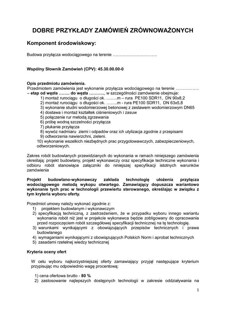 DOBRE PRZYKŁADY ZAMÓWIEŃ ZRÓWNOWAŻONYCH Komponent środowiskowy: Budowa przyłącza wodociągowego na terenie ………………………….. Wspólny Słownik Zamówień (CPV): 45.30.00.00-0 Opis przedmiotu zamówienia. Przedmiotem zamówienia jest wykonanie przyłącza wodociągowego na terenie …………….. – etap od węzła …….. do węzła ……….., w szczególności zamówienie obejmuje: 1) montaż rurociągu o długości ok. ……..m – rura PE100 SDR11, DN 90x8,2 2) montaż rurociągu o długości ok. ……..m - rura PE100 SDR11, DN 63x5,8 3) wykonanie studni wodomierzowej betonowej z zestawem wodomierzowym DN65 4) dostawa i montaż kształtek ciśnieniowych i zasuw 5) połączenie rur metodą zgrzewania 6) próbę wodną szczelności przyłącza 7) płukanie przyłącza 8) wywóz nadmiaru ziemi i odpadów oraz ich utylizacja zgodnie z przepisami 9) odtworzenia nawierzchni, zieleni. 10) wykonanie wszelkich niezbędnych prac przygotowawczych, zabezpieczeniowych, odtworzeniowych. Zakres robót budowlanych przewidzianych do wykonania w ramach niniejszego zamówienia określają: projekt budowlany, projekt wykonawczy oraz specyfikacje techniczne wykonania i odbioru robót stanowiące załączniki do niniejszej specyfikacji istotnych warunków zamówienia Projekt budowlano-wykonawczy zakłada technologię ułożenia przyłącza wodociągowego metodą wykopu otwartego. Zamawiający dopuszcza wariantowo wykonanie tych prac w technologii przewiertu sterowanego, określając w związku z tym kryteria wyboru oferty. Przedmiot umowy należy wykonać zgodnie z: 1) projektem budowlanym i wykonawczym 2) specyfikacją techniczną, z zastrzeżeniem, że w przypadku wyboru innego wariantu wykonania robót niż jest w projekcie wykonawca będzie zobligowany do opracowania przed rozpoczęciem robót szczegółowej specyfikacji technicznej na tę technologię. 3) warunkami wynikającymi z obowiązujących przepisów technicznych i prawa budowlanego 4) wymaganiami wynikającymi z obowiązujących Polskich Norm i aprobat technicznych 5) zasadami rzetelnej wiedzy technicznej Kryteria oceny ofert W celu wyboru najkorzystniejszej oferty zamawiający przyjął następujące kryterium przypisując mu odpowiednio wagę procentową: 1) cena ofertowa brutto - 80 % 2) zastosowanie najlepszych dostępnych technologii w zakresie oddziaływania na 1 środowisko - 20 % Zasady oceny ofert według ustalonych kryteriów Ocena ofert dokonywana będzie w kryterium: a) cena ofertowa brutto – według następującego wzoru: najniższa cena ofertowa brutto C= ---------------------------------------------------- x 100 x waga kryterium cena oferty badanej b) zastosowanie najlepszych środowisko dostępnych technologii w zakresie oddziaływania na podkryteria: metoda bezwykopowa metoda wykopowa - niewielki obszar działania 25 pkt. 10 pkt. - bezproblemowe pokonywanie przeszkód (drogi, ścieżki) 25 pkt. 10 pkt. - utrudnienia w ruchu na wyspie 25 pkt. 10 pkt. - ilość odpadów (ziemia z wykopu) 25 pkt. 10 pkt. Uzyskane ilości punktów za podkryteria zostaną pomnożone przez wagę kryterium – 20% Przyjmuje się, że 1% = 1 pkt. i tak zostanie przeliczona liczba punktów w każdym kryterium 2