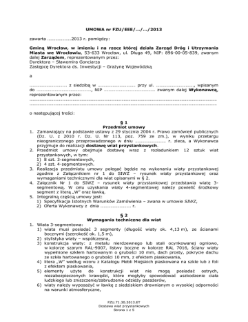 UMOWA nr FZU/EEE/…/…/2013 zawarta …………………2013 r. pomiędzy: Gminą Wrocław, w imieniu i na rzecz której działa Zarząd Dróg i Utrzymania Miasta we Wrocławiu, 53-633 Wrocław, ul. Długa 49, NIP: 896-00-05-839, zwanym dalej Zarządem, reprezentowanym przez: Dyrektora – Sławomira Gonciarza Zastępcę Dyrektora ds. Inwestycji – Grażynę Wojewódzką a …………………………… z siedzibą w …………………………… przy ul. ……………………………, wpisanym do …………………………………………, NIP ……………………………………… zwanym dalej Wykonawcą, reprezentowanym przez: ………………………………………………………………………………………………………………………………………………… ………………………………………………………………………………………………………………………………………………… o następującej treści: 1. 2. 3. 4. 5. §1 Przedmiot umowy Zamawiający na podstawie ustawy z 29 stycznia 2004 r. Prawo zamówień publicznych (Dz. U. z 2010 r. Dz. U. Nr 113, poz. 759 ze zm.), w wyniku przetargu nieograniczonego przeprowadzonego w dniu ……………………… r. zleca, a Wykonawca przyjmuje do realizacji dostawę wiat przystankowych. Przedmiot umowy obejmuje dostawę wraz z rozładunkiem 12 sztuk wiat przystankowych, w tym: 1) 8 szt. 3-segmentowych, 2) 4 szt. 4-segmentowych. Realizacja przedmiotu umowy polegać będzie na wykonaniu wiaty przystankowej zgodnie z Załącznikiem nr 1 do SIWZ – rysunek wiaty przystankowej oraz wymaganiami technicznymi dla wiat opisanymi w § 2. Załącznik Nr 1 do SIWZ – rysunek wiaty przystankowej przedstawia wiatę 3segmentową. W celu uzyskania wiaty 4-segmentowej należy powielić środkowy segment z literą „W” oraz ławką. Integralną częścią umowy jest: 1) Specyfikacja Istotnych Warunków Zamówienia – zwana w umowie SIWZ, 2) Oferta Wykonawcy z dnia ……………………… r. §2 Wymagania techniczne dla wiat 1. Wiata 3-segmentowa: 1) wiata musi posiadać 3 segmenty (długość wiaty ok. 4,13 m), ze ścianami bocznymi (szerokość ok. 1,5 m), 2) stylistyka wiaty – współczesna, 3) konstrukcja wiaty: z metalu nierdzewnego lub stali ocynkowanej ogniowo, w kolorze szarym RAL-9007, listwy boczne w kolorze RAL 7016, ściany wiaty wypełnione szkłem hartowanym o grubości 10 mm, dach prosty, pokrycie dachu ze szkła hartowanego o grubości 10 mm, z efektem piaskowania, 4) litera „W” według wzoru z Katalogu Mebli Miejskich piaskowana na szkle lub z foli z efektem piaskowania, użyte do konstrukcji wiat nie mogą posiadać ostrych, 5) elementy niezabezpieczonych krawędzi, które mogłyby spowodować uszkodzenie ciała ludzkiego lub zniszczenie/zabrudzenie odzieży pasażerów, 6) wiaty należy wyposażyć w ławkę z siedziskiem drewnianym o wysokiej odporności na warunki atmosferyczne, FZU.71.30.2013.ET Dostawa wiat przystankowych Strona 1 z 5 7) w wiatach należy uwzględnić możliwość docelowego (w terminie późniejszym) montażu standardowych paneli reklamowych - cityligh o powierzchni reklamowej 2,16 m (1200 x 1800 mm), 8) na przeszkleniach wiat nie należy umieszczać pasów z nazwą i adresem producenta wiat, 9) sposób odprowadzania wody musi eliminować możliwość ochlapywania pasażerów spływającą z dachu wodą oraz powstawania zastoin wody pod wiatą, 10) wiata powinna posiadać możliwość zasilania paneli reklamowych (w segmencie ściany bocznej, przeciwnej do najazdowej oraz w segmencie skrajnym w ścianie tylnej, od strony najazdowej). 2. Wiata 4-segmentowa: 1) wiata musi posiadać 4 segmenty (długość wiaty ok. 5,60 m), ze ścianami bocznymi (szerokość ok. 1,5 m), 2) stylistyka wiaty – współczesna, 3) konstrukcja wiaty: z metalu nierdzewnego lub stali ocynkowanej ogniowo, w kolorze szarym RAL-9007, listwy boczne w kolorze RAL 7016, ściany wiaty wypełnione szkłem hartowanym o grubości 10 mm, dach prosty, pokrycie dachu ze szkła hartowanego o grubości 10 mm, z efektem piaskowania, 4) litera „W” według wzoru z Katalogu Mebli Miejskich piaskowana na szkle lub z foli z efektem piaskowania, 5) elementy użyte do konstrukcji wiat nie mogą posiadać ostrych, niezabezpieczonych krawędzi, które mogłyby spowodować uszkodzenie ciała ludzkiego lub zniszczenie/zabrudzenie odzieży pasażerów, 6) wiaty należy wyposażyć w 2 ławki z siedziskiem drewnianym o wysokiej odporności na warunki atmosferyczne, 7) w wiatach należy uwzględnić możliwość docelowego (w terminie późniejszym) montażu standardowych paneli reklamowych - cityligh o powierzchni reklamowej 2,16 m (1200 x 1800 mm), 8) na przeszkleniach wiat nie należy umieszczać pasów z nazwą i adresem producenta wiat, 9) sposób odprowadzania wody musi eliminować możliwość ochlapywania pasażerów spływającą z dachu wodą oraz powstawania zastoin wody pod wiatą, 10) wiata powinna posiadać możliwość zasilania paneli reklamowych (w segmencie ściany bocznej, przeciwnej do najazdowej oraz w segmencie skrajnym w ścianie tylnej, od strony najazdowej). §3 Termin realizacji Strony ustalają, że przedmiot umowy będzie realizowany w terminie 75 dni od daty zawarcia umowy. §4 Obowiązki Wykonawcy 1. Wykonawca uzgodni z Zamawiającym termin dostarczenia i rozładowania wiat oraz dostarczy i rozładuje wiaty w siedzibie Zamawiającego, przy ul. Długiej 49, 53-633 Wrocław, w godz. od 8:00 do 14:00 w dni robocze od poniedziałku do piątku, przy użyciu środków transportowych Wykonawcy, w ramach wynagrodzenia, o którym mowa w § 6 ust. 1. Montaż wiat realizowany będzie przez Zamawiającego we własnym zakresie. 2. Wykonawca ponosi pełną odpowiedzialność za wypadki i szkody powstałe w związku z wykonaniem i wykonywaniem niniejszej umowy do momentu przekazania wiat protokołem zdawczo-odbiorczym. 3. Przed podpisani