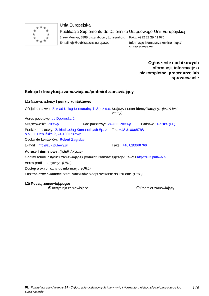 Unia Europejska Publikacja Suplementu do Dziennika Urzędowego Unii Europejskiej 2, rue Mercier, 2985 Luxembourg, Luksemburg Faks: +352 29 29 42 670 E-mail: [email protected] Informacje i formularze on-line: http:// simap.europa.eu Ogłoszenie dodatkowych informacji, informacje o niekompletnej procedurze lub sprostowanie Sekcja I: Instytucja zamawiająca/podmiot zamawiający I.1) Nazwa, adresy i punkty kontaktowe: Oficjalna nazwa: Zakład Usług Komunalnych Sp. z o.o. Krajowy numer identyfikacyjny: (jeżeli jest znany) _____ Adres pocztowy: ul. Dęblińska 2 Miejscowość: Puławy Kod pocztowy: 24-100 Puławy Punkt kontaktowy: Zakład Usług Komunalnych Sp. z o.o., ul. Dęblińska 2, 24-100 Puławy Państwo: Polska (PL) Tel.: +48 818868768 Osoba do kontaktów: Robert Zagraba E-mail: [email protected] Faks: +48 818868768 Adresy internetowe: (jeżeli dotyczy) Ogólny adres instytucji zamawiającej/ podmiotu zamawiającego: (URL) http://zuk.pulawy.pl Adres profilu nabywcy: (URL) _____ Dostęp elektroniczny do informacji: (URL) _____ Elektroniczne składanie ofert i wniosków o dopuszczenie do udziału: (URL) _____ I.2) Rodzaj zamawiającego: Instytucja zamawiająca Podmiot zamawiający PL Formularz standardowy 14 - Ogłoszenie dodatkowych informacji, informacje o niekompletnej procedurze lub sprostowanie 1/6 Sekcja II: Przedmiot zamówienia II.1.1) Nazwa nadana zamówieniu: Dostawa ciągnika z osprzętem do Zakładu Unieszkodliwiania Odpadów Komunalnych w Puławach II.1.2) Krótki opis zamówienia lub zakupu: (podano w pierwotnym ogłoszeniu) Przedmiotem niniejszego zamówienia jest dostawa jednej sztuki fabrycznie nowego ciągnika rolniczego z osprzętem do Zakładu Unieszkodliwiania Odpadów Komunalnych w Puławach, w ramach projektu „Rozbudowa i modernizacja Zintegrowanego Systemu Gospodarki Odpadami dla Miasta Puławy i Gmin Ościennych poprzez rozbudowę i modernizację Zakładu Unieszkodliwiania Odpadów Komunalnych w Puławach – poprawa infrastruktury zbierania i odzysku odpadów”. Charakterystyka Ciągnik rolniczy: Maszyna fabrycznie nowa, Parametry techniczne: •Silnik wysokoprężny turbodoładowany o mocy znamionowej min. 60 kW, chłodzony cieczą, z podgrzewaczem bloku silnika, •Maksymalny moment obrotowy min. 340 Nm, •Norma emisji spalin nie niższa niż EURO Stage 3, •Napęd 4x4, •Skrzynia biegów z rewersem, zsynchronizowana, •Wałek odbioru mocy (WOM) dwustopniowy, tylny z osłoną, •Układ kierowniczy hydrostatyczny, •Koła przednie o rozmiarze opon nie mniejszym niż R24, koła tylne o rozmiarze opon nie mniejszym niż R28, •Masa własna maszyny min. 3500 kg, •Obciążniki min. 0,1 t. •Maksymalna długość nie większa niż 4800 mm, •Wysokość maszyny do zewnętrznej krawędzi kabiny nie mniej niż 2500 mm i nie więcej niż 2800 mm, •Szerokość maksymalna nie większa niż 2450 mm, •Prześwit nad powierzchnią gruntu min. 320 mm, •Udźwig układu hydraulicznego min. 2200 kg, •Hamulce robocze tarczowe mokre, sterowane hydraulicznie, •Hamulce postojowe sterowane mechanicznie, •Instalacja pneumatyczna – dwuobwodowa, •Błotniki przednie i tylne, •Szybkozłącza hydrauliczne do obsługi osprzętu w ilości nie mniejszej niż 4 plus 2, •Trójpunktowy układ zawieszenia (TUZ) z udźwigiem z tyłu i z przodu, •Kabina amortyzowana, spełniająca normy ROPS/FOPS, wyposażona co najmniej w wentylację i ogrzewanie w wycieraczki i spryskiwacze szyby przedniej i tylnej, 2 lusterka zewnętrzne oraz wewnętrzne lusterko wsteczne, oświetlenie drogowe zgodne z obowiązującymi przepisami prawa w tym zakresie oraz oświetlenie robocze składające się co najmniej z dwóch par reflektorów, po jednej z przodu i z tyłu usytuowanych na dachu kabiny. Dodatkowe wymagania i wyposażenie: •Instrukcja obsługi w języku polskim, •Katalog części, •Skrzynia narzędziowa, •Lampa migowa ostrzegawcza koloru pomarańczowego, •Dźwiękowy sygnał ostrzegawczy cofania, PL Formularz standardowy 14 - Ogłoszenie dodatkowych informacji, informacje o niekompletnej procedurze lub sprostowanie 2/6 •Trójkąt ostrzegawczy, •Gaśnica, •Apteczka. Osprzęt do ciągnika: •Zamiatarka czołowa z pojemnikiem o szerokości roboczej nie mniejszej niż 2000 mm, mocowana za pomocą trójpunktowego układu zawieszenia (TUZ) – 1 sztuka, •Kosiarka bijakowa o szerokości roboczej nie mniejszej niż 2500 mm, mocowana za pomocą trójpunktowego układu zawieszenia (TUZ) – 1 sztuka, •Spychacz czołowy do odśnieżania regulowany na boki i w układzie „V” o szerokości roboczej nie mniejszej niż 2800 mm, z dolną częścią lemiesza gumowaną, wyposażony w oświetlenie obrysowe, mocowany za pomocą trójpunktowego układu zawieszenia (TUZ) – 1 sztuka, •Kosiarka do skarpowania o szerokości głowicy nie mniejszej niż 1000 mm, na wysięgniku, o zasięgu koszenia nie mniejszym niż 4000 mm, mocowana za pomocą trójpunktowego układu zawieszenia (TUZ) – 1 sztuka. Pozostałe wymagania: - Ciągnik i osprzęt muszą być fabrycznie nowe, wyprodukowane w 2013 r. lub 2014 r. i nie mogą być prototypami, - Ciągnik i osprzęt muszą być przygotowane do eksploatacji i posiadać wszelkie wymagane przez prawo zaświadczenia i certyfikaty (np. takie jak Certyfikat Unii Europejskiej CE) dopuszczające do obrotu i użytkowania zgodnie z wymogami Zamawiającego. Maszyna musi być przystosowana do poruszania się po drogach publicznych i posiadać wszystkie wymagane prawem dokumenty niezbędne do dokonania rejestracji. - Ciągnik i osprzęt muszą posiadać takie cechy wspólne, aby ich użytkowanie jako całości nie wymagało jakichkolwiek dodatkowych środków technicznych, tzn. musi być zachowana kompatybilność zarówno pod względem podłączenia, jak i wymaganych parametrów każdego urządzenia. - Wykonawca zobowiązany jest do dostarczenia dokumentacji technicznej maszyn oraz instrukcji obsługi jak i innych dokumentów niezbędnych do p