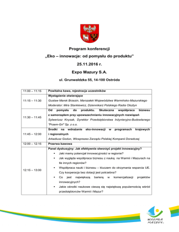 Program konferencji „Eko – innowacje: od pomysłu do produktu” 25.11.2016 r. Expo Mazury S.A. ul. Grunwaldzka 55, 14-100 Ostróda 11:00 – 11:15 Powitalna kawa, rejestracja uczestników Wystąpienie otwierające 11:15 – 11:30 Gustaw Marek Brzezin, Marszałek Województwa Warmińsko-Mazurskiego Moderator: Mira Stankiewicz, Dziennikarz Polskiego Radia Olsztyn Od 11:30 – 11:45 pomysłu do produktu. współpraca Skuteczna biznesu z samorządem przy upowszechnianiu innowacyjnych rozwiązań Sylweriusz Knysak, Dyrektor Przedsiębiorstwa Inżynieryjno-Budowlanego "Przem-Gri" Sp. z o.o. Środki 11:45 – 12:00 na wdrażanie eko-innowacji w programach krajowych i regionalnych Arkadiusz Godun, Wiceprezes Zarządu Polskiej Kompanii Doradczej 12:00 – 12:15 Przerwa kawowa Panel dyskusyjny: Jak efektywnie stworzyć projekt innowacyjny?  Jaki mamy potencjał innowacyjności w regionie?  Jak wygląda współpraca biznesu z nauką na Warmii i Mazurach na tle innych regionów? 12:15 – 13:00  Współpraca nauki i biznesu – kluczem do otrzymania wsparcia UE. Czy kooperacja bez dotacji jest potrzebna?  Co jest największą barierą w komercjalizacji projektów innowacyjnych?  Jakie ośrodki naukowe cieszą się największą popularnością wśród przedsiębiorców Warmii i Mazur? Moderator panelu: Adam Łaskarzewski Paneliści: Dorota Kopeć, Zastępca Dyrektora Departamentu Polityki Regionalnej Urzędu Marszałkowskiego w Olsztynie; Paweł Lulewicz, Dyrektor Elbląskiego Parku Technologicznego; Konrad Nowak, Prezes Zarządu MPEC Sp. z o.o. w Olsztynie Mariusz Rychcik, Środowiskowych Dyrektor Wojewódzkiego Regionalnego Funduszu Centrum Ochrony Projektów Środowiska i Gospodarki Wodnej w Olsztynie; 13:00 – 13:15 Nauka inspiruje biznes do działania – najlepsze przykłady Stanisław Kwitnewski, Państwowa Wyższa Szkoła Zawodowa w Elblągu Jak zmniejszyć ryzyko inwestycji w eko-innowacje - praktyka funduszy 13:15 – 13:30 Venture Capital Łukasz Mańkowski – Black Pearls, Smart Business Ventures  Networking  Stoisko konsultacyjne: informacje na temat dobrych praktyk – eko-innowacyjnych projektów, które uzyskały dofinansowanie 13:30 – 15:00 we wcześniejszej perspektywie finansowej  Lunch Patronat medialny: