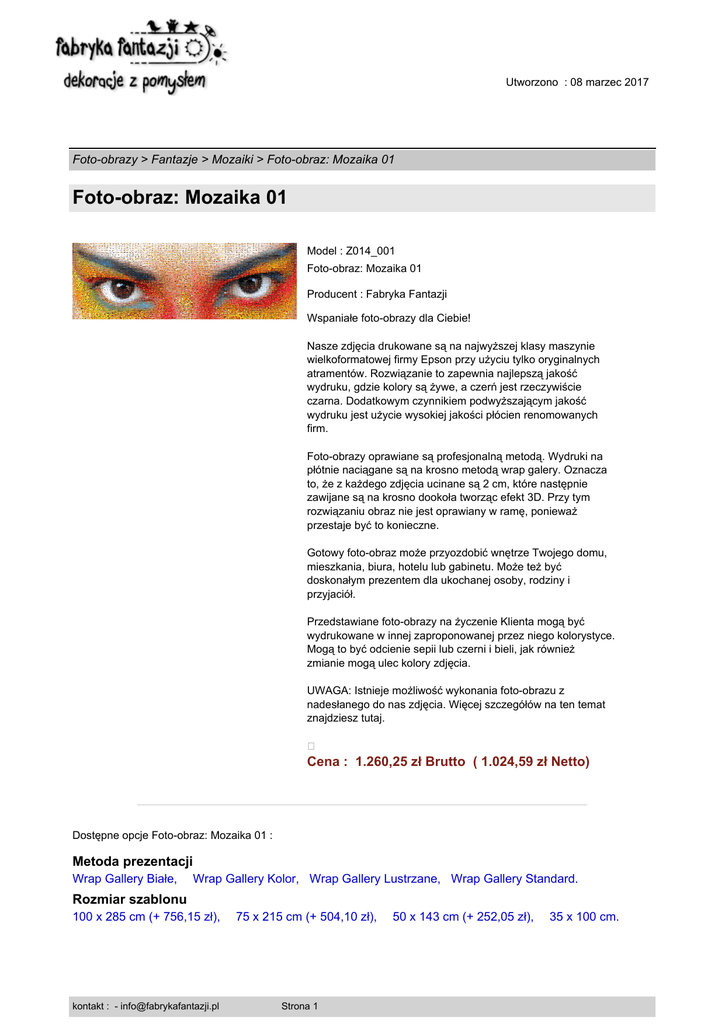 Utworzono : 08 marzec 2017 Foto-obrazy > Fantazje > Mozaiki > Foto-obraz: Mozaika 01 Foto-obraz: Mozaika 01 Model : Z014_001 Foto-obraz: Mozaika 01 Producent : Fabryka Fantazji Wspaniałe foto-obrazy dla Ciebie! Nasze zdjęcia drukowane są na najwyższej klasy maszynie wielkoformatowej firmy Epson przy użyciu tylko oryginalnych atramentów. Rozwiązanie to zapewnia najlepszą jakość wydruku, gdzie kolory są żywe, a czerń jest rzeczywiście czarna. Dodatkowym czynnikiem podwyższającym jakość wydruku jest użycie wysokiej jakości płócien renomowanych firm. Foto-obrazy oprawiane są profesjonalną metodą. Wydruki na płótnie naciągane są na krosno metodą wrap galery. Oznacza to, że z każdego zdjęcia ucinane są 2 cm, które następnie zawijane są na krosno dookoła tworząc efekt 3D. Przy tym rozwiązaniu obraz nie jest oprawiany w ramę, ponieważ przestaje być to konieczne. Gotowy foto-obraz może przyozdobić wnętrze Twojego domu, mieszkania, biura, hotelu lub gabinetu. Może też być doskonałym prezentem dla ukochanej osoby, rodziny i przyjaciół. Przedstawiane foto-obrazy na życzenie Klienta mogą być wydrukowane w innej zaproponowanej przez niego kolorystyce. Mogą to być odcienie sepii lub czerni i bieli, jak również zmianie mogą ulec kolory zdjęcia. UWAGA: Istnieje możliwość wykonania foto-obrazu z nadesłanego do nas zdjęcia. Więcej szczegółów na ten temat znajdziesz tutaj. � Cena : 1.260,25 zł Brutto ( 1.024,59 zł Netto) Dostępne opcje Foto-obraz: Mozaika 01 : Metoda prezentacji Wrap Gallery Białe, Wrap Gallery Kolor, Wrap Gallery Lustrzane, Wrap Gallery Standard. Rozmiar szablonu 100 x 285 cm (+ 756,15 zł), kontakt : - [email protected] 75 x 215 cm (+ 504,10 zł), Strona 1 50 x 143 cm (+ 252,05 zł), 35 x 100 cm. Utworzono : 08 marzec 2017 Foto-obrazy > Fantazje > Mozaiki > Foto-obraz: Mozaika 01 Foto-obraz: Mozaika 01 Dostępność: Produkt dostępny w naszym sklepie od 26 wrzesień 2008 kontakt : - [email protected] Strona 2