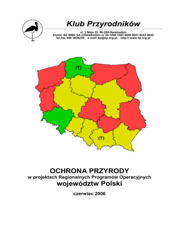 Klub Przyrodników ul. 1 Maja 22, 66-200-Świebodzin Konto: BZ WBK SA o/Świebodzin nr 28 1090 1593 0000 0001 0243 0645 tel./fax 068 3828236, e-mail: [email protected], http:// www.kp.org.pl OCHRONA PRZYRODY w projektach Regionalnych Programów Operacyjnych województw Polski czerwiec 2006 1. Wstęp Podstawą wykorzystania unijnych środków spójności i rozwoju regionalnego w latach 2007-2013 będzie Narodowa Strategia Spójności i wchodzące w jej skład Sektorowe Programy Operacyjne (w tym Sektorowy Program Operacyjny "Infrastruktura i Środowisko" – SPO IiS) oraz Regionalne Programy Operacyjne (RPO) dla poszczególnych województw. Urzędy marszałkowskie poszczególnych województw przygotowały obecnie projekty RPO. Istotnym elementem polityki UE jest ochrona środowiska i przyrody, w tym wdrażanie Dyrektywy Ptasiej i Dyrektywy Siedliskowej – wymagające działań na rzecz wdrożenia sieci Natura 2000, skutecznej ochrony tej sieci oraz skutecznej ochrony krajowych zasobów siedlisk przyrodniczych i gatunków (zarówno w sieci obszarów chronionych, jak i poza nią). Działania te wymagają odpowiedniego finansowania. Unia Europejska przyjęła założenie, że poza niewielkim instrumentem finansowym LIFE+ (przeznaczonym dla finansowania działań innowacyjnych), finansowanie potrzebnych działań na rzecz ochrony przyrody ma być realizowane według "modelu zintegrowanego", tj. ma być wplecione w priorytety wszystkich innych funduszy UE. W Polsce, w projektowanym Sektorowym Programie Operacyjnym 'Infrastruktura i Środowisko" stosunkowo szeroko ujęto działania, które miałyby służyć ochronie różnorodności biologicznej. W priorytecie V SPO IiS przewidziano działania na rzecz: (a) ochrony i renaturyzacji ekosystemów i siedlisk przyrodniczych; (b) odtwarzania drożności korytarzy ekologicznych; (c) ochrony gatunków. Założono przy tym że przedmiotem krajowego SPO IiS będą duże projekty (>0,1 mln Euro) w tym zakresie, a projekty małe, o znaczeniu regionalnym (<0,1 mln Euro) będą przedmiotem regionalnych programów operacyjnych. Klub Przyrodników dokonał przeglądu projektów RPO poszczególnych województw, analizując, czy to założenie komplementarności zostało w nich rzeczywiście zrealizowane. Wyniki tej analizy przedstawiamy w rozdziale 2, a uwagi i wnioski, jakie w wyniku analizy przesłaliśmy marszałkom województw, zestawiamy w rozdziale 4. Przy okazji przeanalizowaliśmy wstępnie główne zagrożenia, jakie w naszej opinii realizacja SPO IiS oraz RPO będzie stwarzać dla różnorodności biologicznej Polski. Uwagi na ten temat są przedmiotem rozdziału 3. 2. Ujęcie ochrony przyrody w Regionalnych Programach Operacyjnych W poszczególnych województwach przyjęte są dwa modele ujęcia w RPO działań na rzecz ochrony różnorodności biologicznej: a) Ujęcie w ramach priorytetu "środowisko" – obok działań na rzecz tworzenia infrastruktury ochrony środowiska, ochrony wody, powietrza, bezpieczeństwa ekologicznego itp. Jest to model częściej spotykany, bardziej intuicyjny oraz zgodny z ujęciem w SPOiIS. Akcentuje on żywe zasoby przyrody jako komponent środowiska przyrodniczego. Najlepszy przykład takiego ujęcia stanowi projekt RPO woj. dolnośląskiego; b) Ujęcie w ramach priorytetu "turystyka" – oparte na założeniu, że różnorodność biologiczna i ekosystemy są składnikiem dziedzictwa przyrodniczego województwa, a to z kolei stanowi podstawę jego atrakcyjności turystycznej. To ujęcie, mimo że nietypowe, zasługuje na uwagę – akcentuje ono bezpośrednią użyteczność różnorodności biologicznej dla rozwoju województwa. Ujęcie to może w praktyce być nie mniej skuteczne od poprzedniego, jednak pod warunkiem zrozumienia, że atrakcyjność krajobrazowa i turystyczna jest funkcją zachowania przyrody na całym terenie województwa i we wszystkich jej aspektach (kwietne łąki, stare lasy, rozległe wrzosowiska, tętniące żabim kumkaniem bagna, różnorodne przyrodniczo czyste jeziora ...), ta nie tylko punktowego zachowania atrakcyjnych turystycznie obiektów i obszarów przyrodniczych. Dobry przykład takiego ujęcia stanowi RPO województwa pomorskiego. Podobne, lecz mniej wypracowane ujęcie zastosowano w województwie małopolskim. W województwie podkarpackim działania z zakresu ochrony przyrody ujęto, lecz umieszczono je w ramach priorytetu "rewitalizacja obszarów zdegradowanych". Takie rozwiązanie nie wydaje się logiczne, choć być może nie będzie mieć negatywnego wpływu na rzeczywistą realizację tych działań w momencie wdrażania RPO. W siedmiu spośród 16 województw Polski zagadnień ochrony przyrody nie ujęto jednak w projekcie RPO w ogóle, łamiąc tym samym ideę komplementarności projektów RPO z Priorytetem V SPO IiS. Są to województwa: − Zachodniopomorskie − Lubuskie − Warmińsko-Mazurskie − Podlaskie − Lubelskie − Świętokrzyskie − Łódzkie Uderzające jest, że wśród wymienionych tu województw są między innymi województwa zawierające jedne z najcenniejszych przyrodniczo i krajobrazowo terenów Polski, a w dodatku są to województwa deklarujące swój rozwój w kierunku "turystyki opartej na zasobach przyrodniczych" (np. podlaskie, warmińsko-mazurskie, zachodniopomorskie!). Nawet w województwach w których ujęto w RPO działania na rzecz ochrony przyrody, ich zakres przedmiotowy jest często zawęzony w stosunku do potrzeb. Zawężenie takie może powodować niepełną komplementarność poszczególnych RPO z Priorytetem V SPO IiS. Występują dwie podstawowe negatywne tendencje zawężające: a) Ograniczanie projektowanych działań z zakresu ochrony przyrody do "obiektów i obszarów chronionych" – podczas gdy dla zachowania różnorodności przyrodniczej województw zwykle są potrzebne także działania poza tymi obszarami (realizacja programów ochrony zagrożonych gatunków i udrażnianie korytarzy ekologicznych); b) Ograniczanie pr