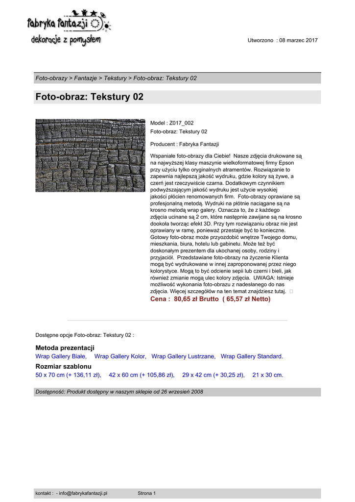 Utworzono : 08 marzec 2017 Foto-obrazy > Fantazje > Tekstury > Foto-obraz: Tekstury 02 Foto-obraz: Tekstury 02 Model : Z017_002 Foto-obraz: Tekstury 02 Producent : Fabryka Fantazji Wspaniałe foto-obrazy dla Ciebie! Nasze zdjęcia drukowane są na najwyższej klasy maszynie wielkoformatowej firmy Epson przy użyciu tylko oryginalnych atramentów. Rozwiązanie to zapewnia najlepszą jakość wydruku, gdzie kolory są żywe, a czerń jest rzeczywiście czarna. Dodatkowym czynnikiem podwyższającym jakość wydruku jest użycie wysokiej jakości płócien renomowanych firm. Foto-obrazy oprawiane są profesjonalną metodą. Wydruki na płótnie naciągane są na krosno metodą wrap galery. Oznacza to, że z każdego zdjęcia ucinane są 2 cm, które następnie zawijane są na krosno dookoła tworząc efekt 3D. Przy tym rozwiązaniu obraz nie jest oprawiany w ramę, ponieważ przestaje być to konieczne. Gotowy foto-obraz może przyozdobić wnętrze Twojego domu, mieszkania, biura, hotelu lub gabinetu. Może też być doskonałym prezentem dla ukochanej osoby, rodziny i przyjaciół. Przedstawiane foto-obrazy na życzenie Klienta mogą być wydrukowane w innej zaproponowanej przez niego kolorystyce. Mogą to być odcienie sepii lub czerni i bieli, jak również zmianie mogą ulec kolory zdjęcia. UWAGA: Istnieje możliwość wykonania foto-obrazu z nadesłanego do nas zdjęcia. Więcej szczegółów na ten temat znajdziesz tutaj. � Cena : 80,65 zł Brutto ( 65,57 zł Netto) Dostępne opcje Foto-obraz: Tekstury 02 : Metoda prezentacji Wrap Gallery Białe, Wrap Gallery Kolor, Wrap Gallery Lustrzane, Wrap Gallery Standard. Rozmiar szablonu 50 x 70 cm (+ 136,11 zł), 42 x 60 cm (+ 105,86 zł), 29 x 42 cm (+ 30,25 zł), Dostępność: Produkt dostępny w naszym sklepie od 26 wrzesień 2008 kontakt : - [email protected] Strona 1 21 x 30 cm.