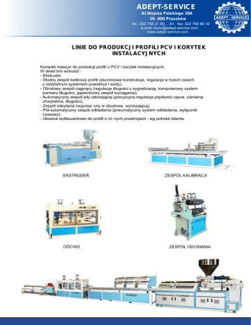 ADEPT-SERVICE Al.Wojska Polskiego 20A 05 -800 Pruszków tel.: 022 758 21 90, ...91, fax: 022 758 89 10 e-mail: [email protected] www.adept-service.com LINIE DO PRODUKCJI PROFILI PCV I KORYTEK INSTALACYJNYCH Komplet maszyn do produkcji profili z PCV i korytek instalacyjnych. W skład linii wchodzi : - Ekstruder, - Wodny zespół kalibracji profili (aluminiowa konstrukcja, regulacja w trzech osiach, z oddzielnym systemem powietrza i wody), - Obrotowy zespół ciągnący (regulacja długości z sygnalizacją, komputerowy system pomiaru długości, gąsienicowy zespół wyciągania), - Automatyczny zespół piły odcinającej (precyzyjna regulacja prędkości cięcia, ciśnienia chwytaków, długości), - Zespół odpylania (wyposażony w obudowę wyciszającą), - Pół-automatyczny zespół odkładania (pneumatyczny system odkładania, wyłącznik czasowy). - Głowice wytłaczarkowe do profili o różnych przekrojach - wg potrzeb klienta. EKSTRUDER ODCIĄG ZESPÓŁ KALIBRACJI ZESPÓŁ ODCINANIA
