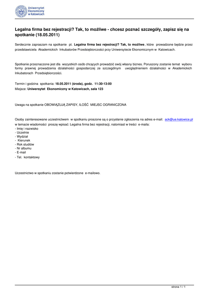 Legalna firma bez rejestracji? Tak, to możliwe - chcesz poznać szczegóły, zapisz się na spotkanie (18.05.2011) Serdecznie zapraszam na spotkanie pt. Legalna firma bez rejestracji? Tak, to możliwe , które prowadzone będzie przez przedstawiciela Akademickich Inkubatorów Przedsiębiorczości przy Uniwersytecie Ekonomicznym w Katowicach. Spotkanie przeznaczone jest dla wszystkich osób chcących prowadzić swój własny biznes. Poruszony zostanie temat wyboru formy prawnej prowadzenia działalności gospodarczej ze szczególnym uwzględnieniem działalności w Akademickich Inkubatorach Przedsiębiorczości. Termin i godzina spotkania: 18.05.2011 (środa), godz. 11:30-13:00 Miejsce: Uniwersytet Ekonomiczny w Katowicach, sala 123 Uwaga na spotkanie OBOWIĄZUJĄ ZAPISY, ILOŚĆ MIEJSC OGRANICZONA Osoby zainteresowane uczestnictwem w spotkaniu proszone są o przysłanie zgłoszenia na adres e-mail: [email protected] w temacie wiadomości proszę wpisać: Legalna firma bez rejestracji, natomiast w treści e-maila: - Imię i nazwisko - Uczelnie - Wydział - Kierunek - Rok studiów - Nr albumu - E-mail - Tel. kontaktowy Uczestnictwo w spotkaniu zostanie potwierdzone e-mailowo. strona 1 / 1